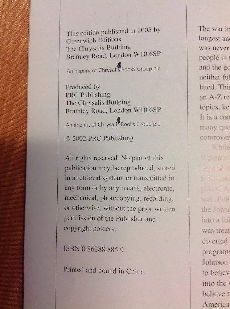 Note condition the only flaw is some damage to the cloth page marker please see photos for detail VIETNAM: A VISUAL ENCYCLOPEDIA: 1954-1975 Gutzman, Philip About this Item black leather bound spine with gilt titles and Easton Press logo on spine. textblock appears unread, with gilt-tipped pages as well. corners sharp, decorative paper inside cover and fep. filled with glossy photos on glossy, tightly bound pages. Ask Seller a Question Bibliographic Details Title: VIETNAM: A VISUAL ENCYCLOPEDIA: 1954-1975 Publisher: Greenwich Editions/Easton Press, Great Britain Publication Date: 2005 Binding: Hardcover