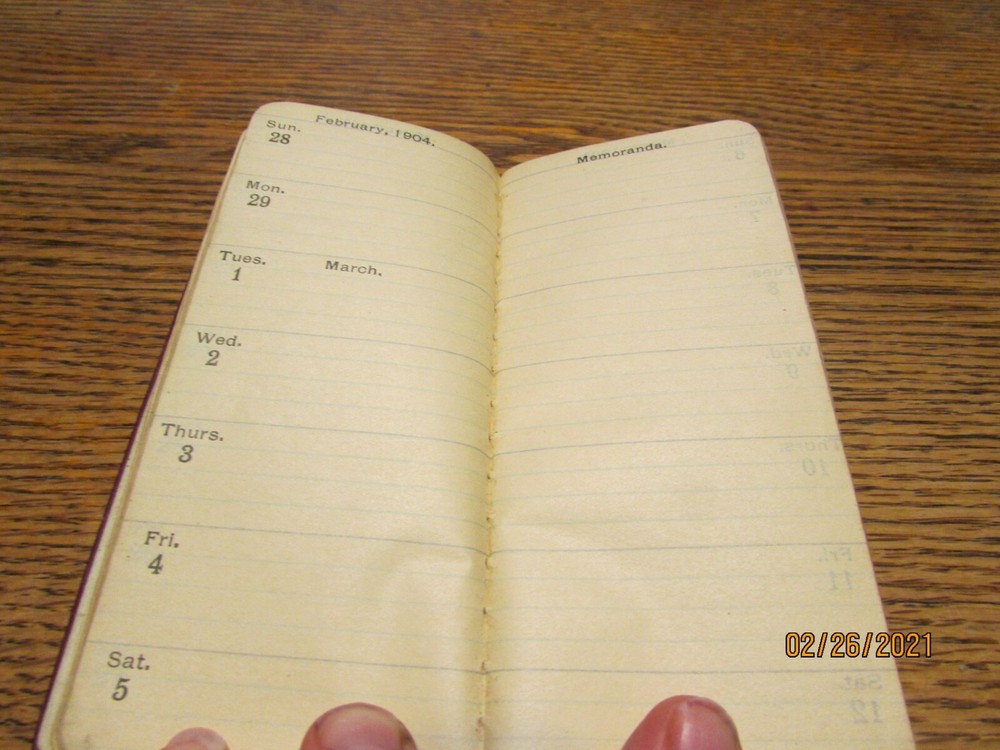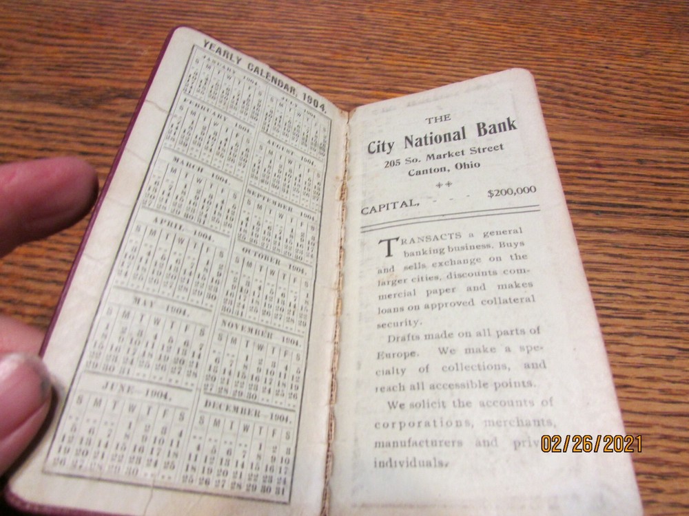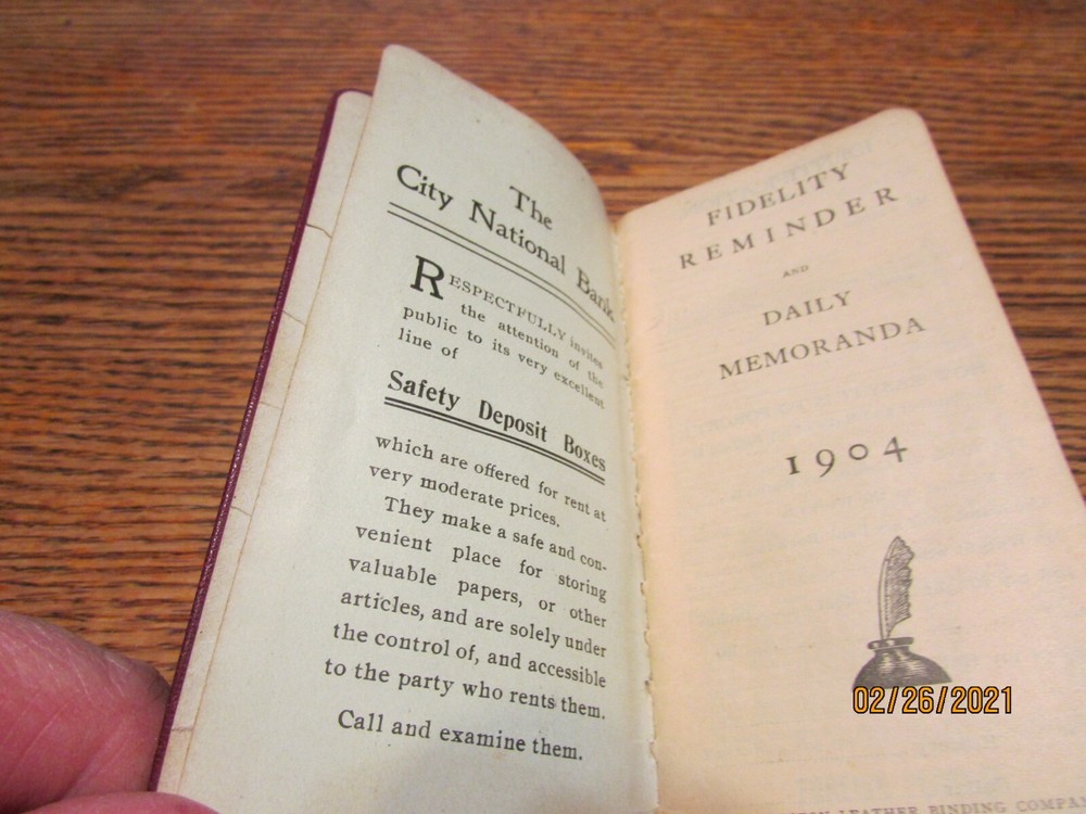 VINTAGE 1904 LEATHER BOUND SMALL MEMO BOOK WITH GILT EDGED PAGES MEASURES 5 3/4" X 2 1/2 INCHES THERE ARE 2 PAGES FOR EACH WEEK ~ THE PAGES UP UNTIL FEB 14- 20 ARE WRITTEN ON IN PENCIL. THE REST ARE BLANK COVERS ARE A BIT WORN COVER READS "PRESENTED BY THE CITY NATIONAL BANK OF CANTON OHIO 1904 HAS PAGES IN THE FRONT WITH INFO ON POSTAGE RATES, DEPT OF AGRICULTURE FLAG SIGNALS FOR WEATHER, STORM SIGNALS, INTEREST TABLE, STOCK YIELD TABLE AND POSTAL DISTANCES AND TIME FROM NEW YORK CITY PLEASE ASK ALL QUESTIONS BEFORE BIDDING. THIS ITEM IS FROM A NO SMOKING HOME. I USUALLY SHIP WITHIN ONE DAY. IF YOU ARE UNHAPPY WITH THIS ITEM FOR ANY REASON PLEASE EMAIL ME TO TRY TO WORK IT OUT. Something that may be insignificant to me, may be of great importance to you, so please, ask questions before bidding! This item is pre-owned and will have visual and physical cues typical of an item that has been handled and used. It is sold as USED.