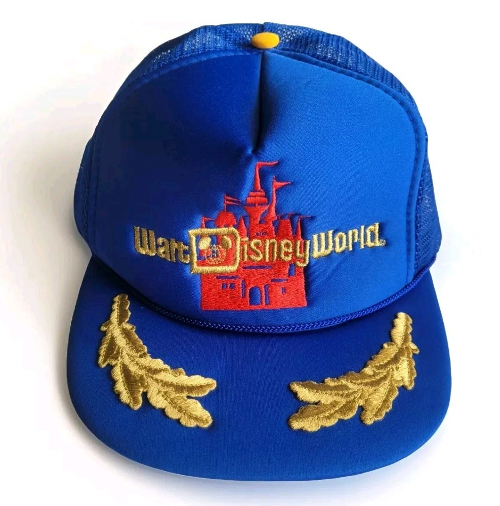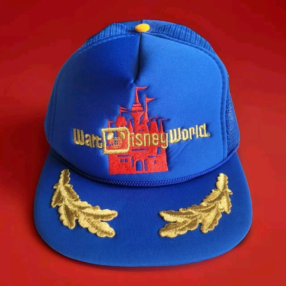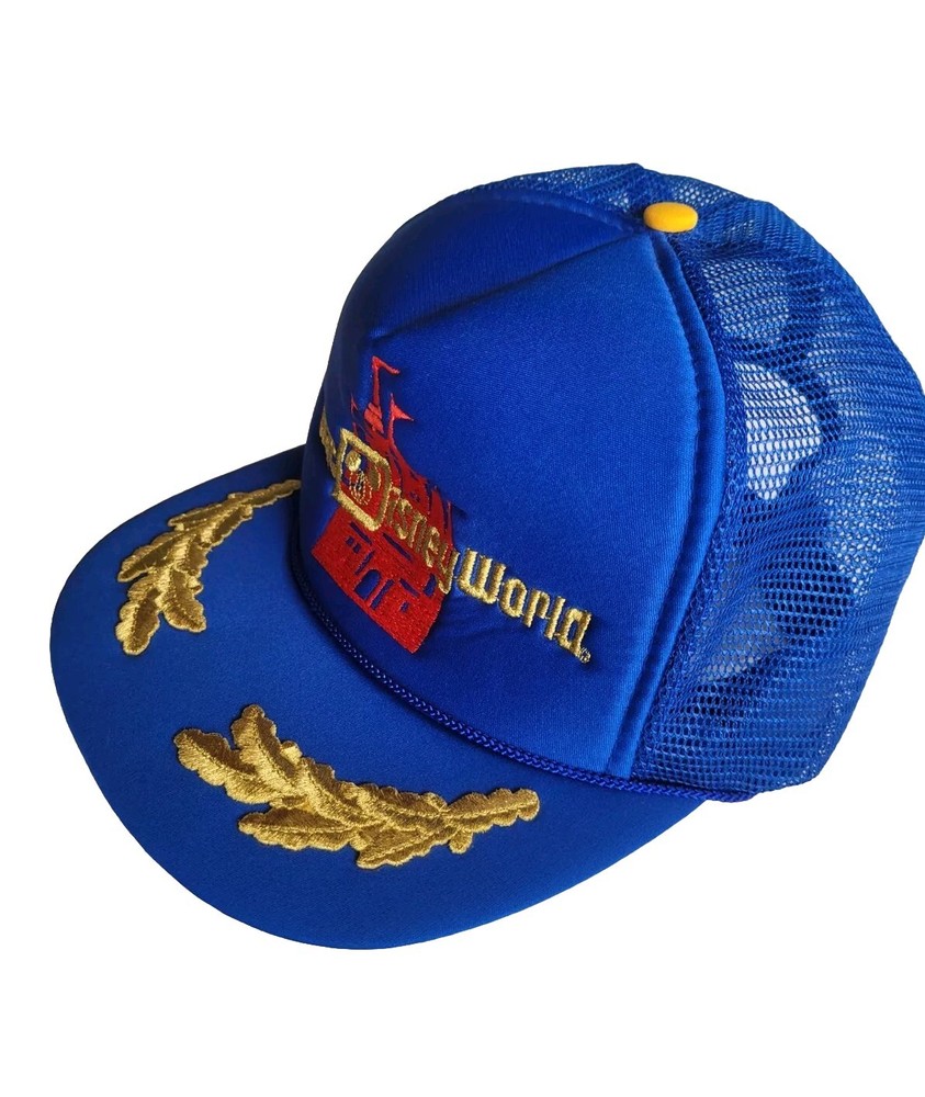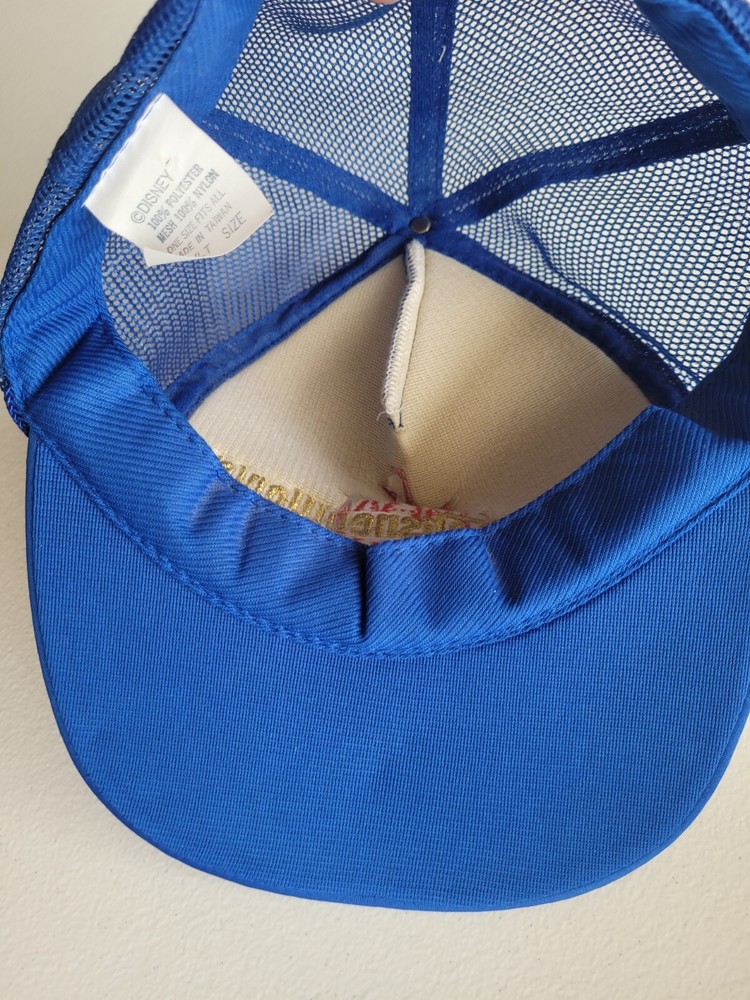 Get your hands on this fun vintage Walt Disney World hat featuring a blue mesh trucker snapback design with gold leaves. This late 80s early 90s era hat is perfect for any Disney fan and is suitable for both men and women. The hat is branded with the Disney logo and Disney world castle and is perfect for any occasion. The hat is made of high-quality materials and is designed to last for years to come. It is in excellent condition amd is perfect for vintage clothing collectors and Disneyana collectors alike. Don't miss out on this unique and eye catching hat. Non smoking home All sales final