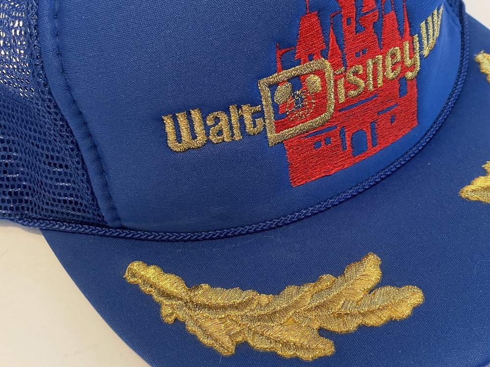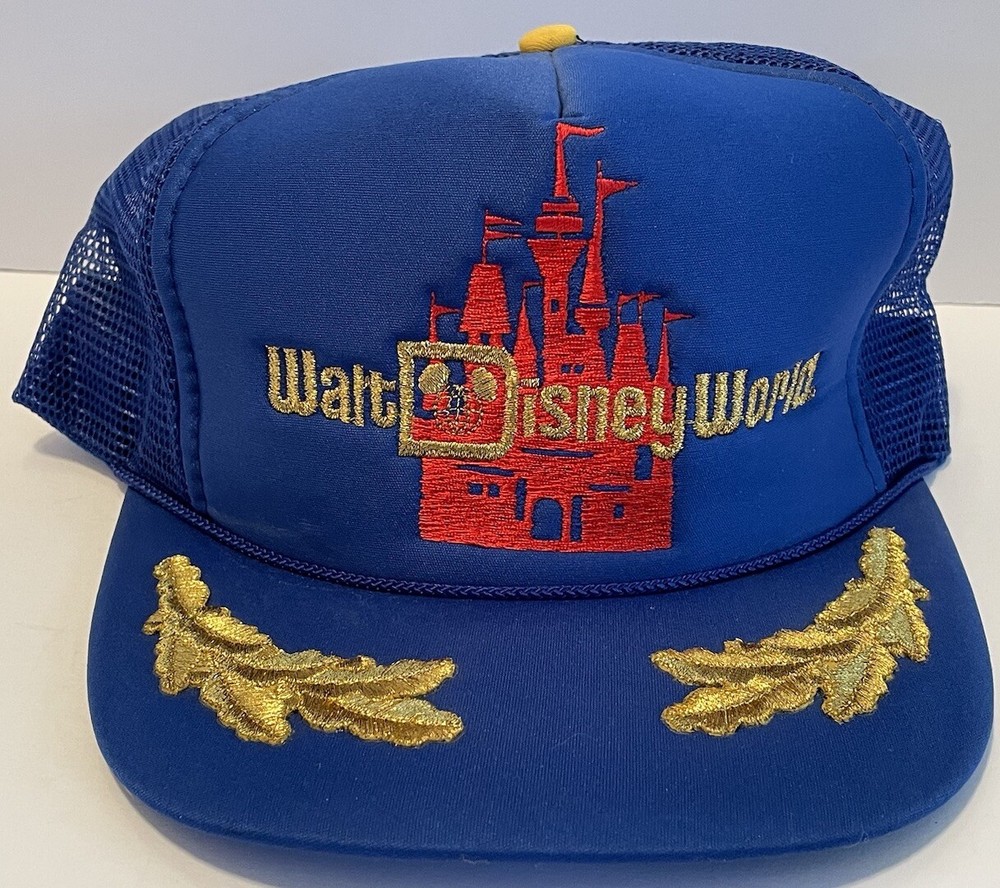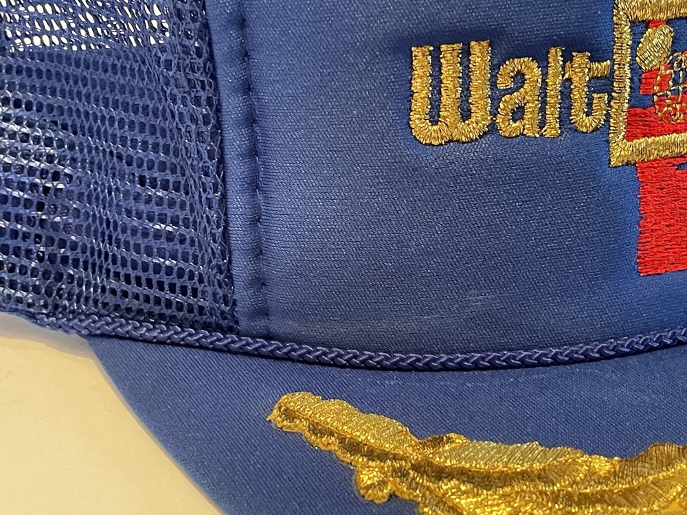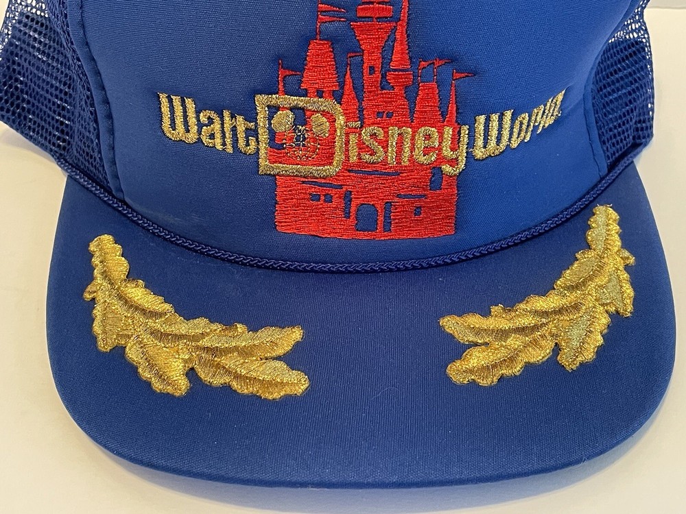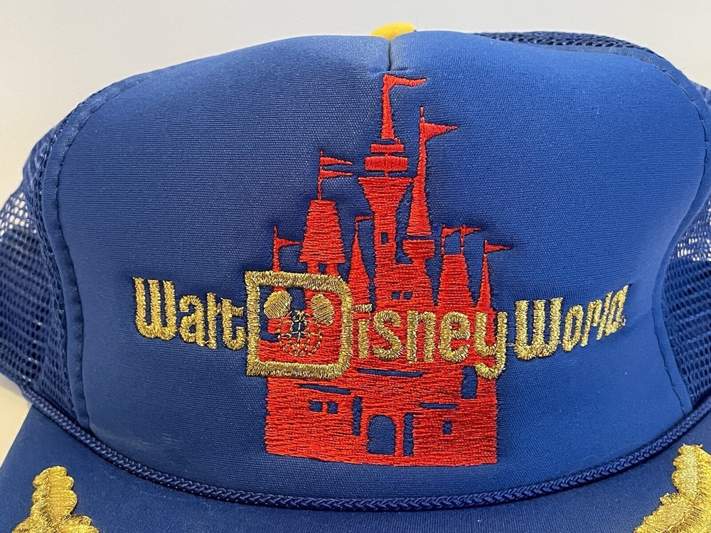 This vintage Walt Disney World hat is a true gem for any Disney fan. The blue trucker mesh cap features the iconic Disney World logo on the front and a snap back for a comfortable fit. Made in Taiwan, this hat is suitable for both men and women and is a must-have accessory for any Disneyana collector. The hat is from the 80s and is perfect for adults who want to add a touch of nostalgia to their wardrobe. Get your hands on this rare piece of Disney history today! Some small staining on the bottom front of the hat