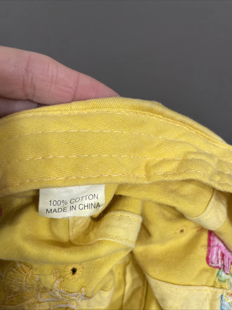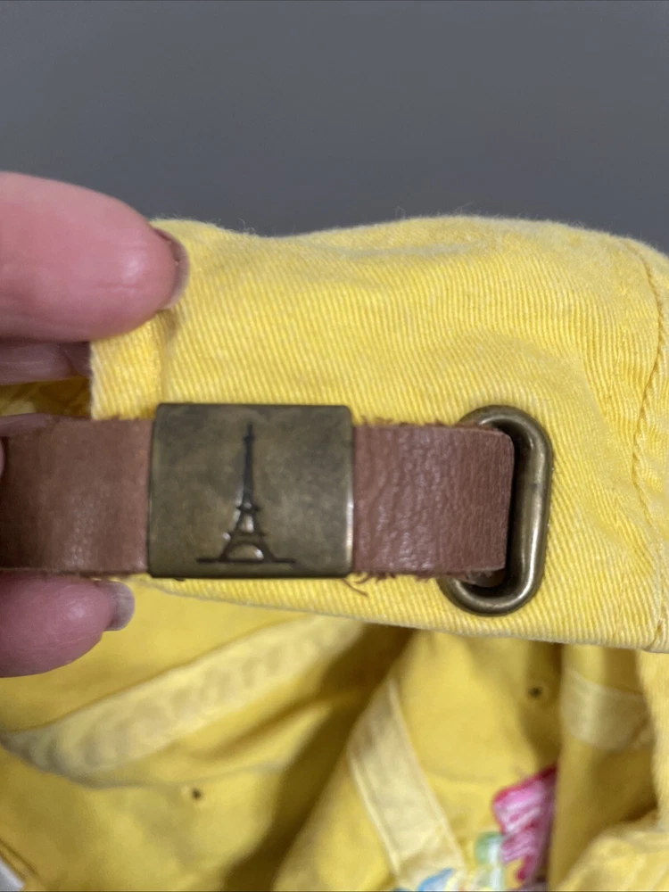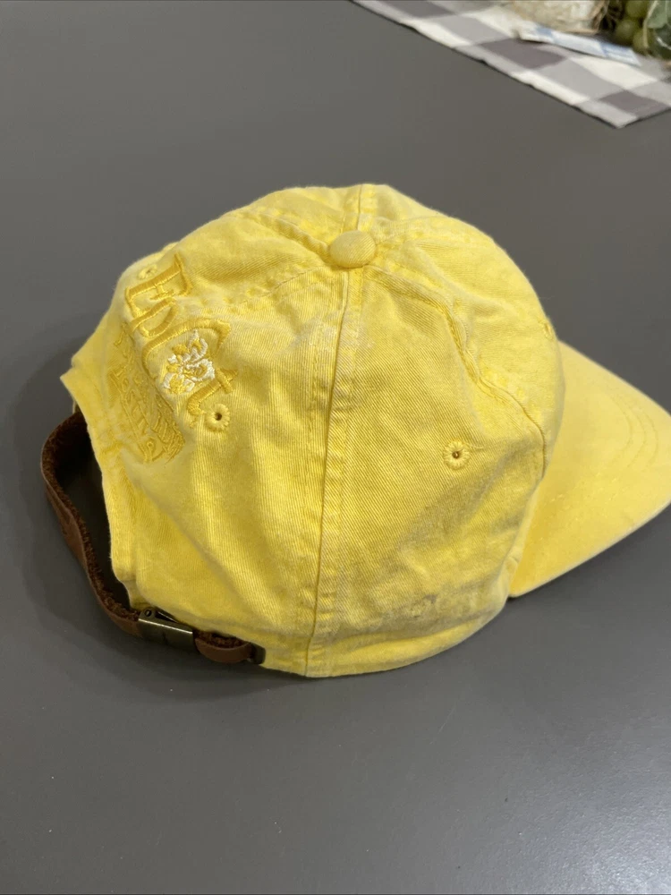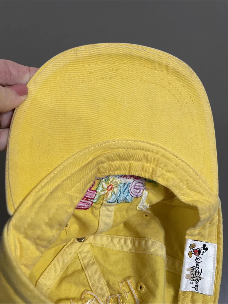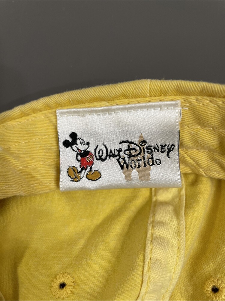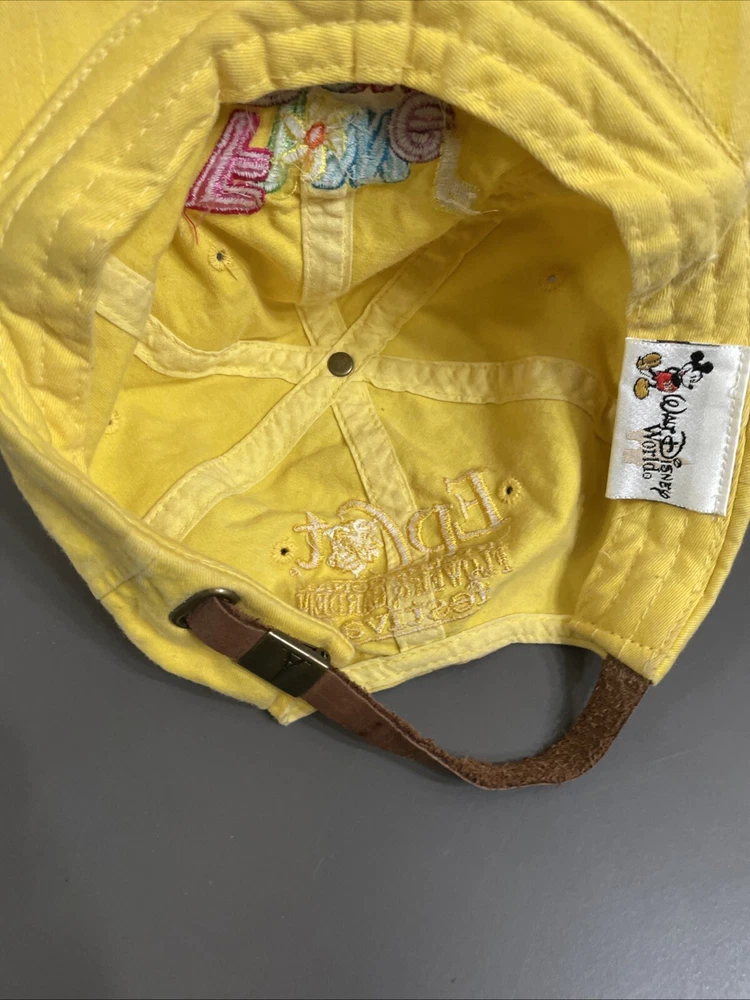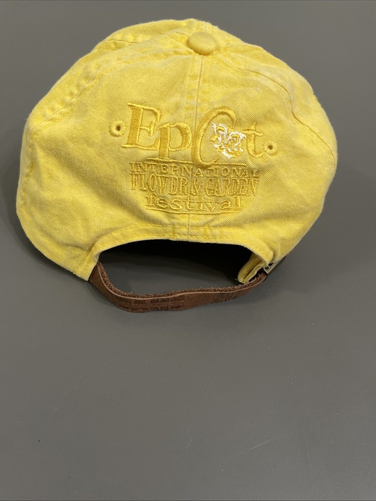 This vintage Disney Parks Epcot Flower Power Hat Ball Cap with brown Leather Strap WDW-1 in yellow is a must-have for any Disney fan. From the Epcot international flower and garden festival. This is vintage may be a little fading, but in good condition. With its unique design and high-quality materials, this cap is perfect for collectors or anyone who wants to show off their love for Disney. The cap features a contemporary design, with an international flower and garden festival theme, and is made in China. It also has a leather strap for added comfort and durability. This cap is a great addition to any Disneyana collection or as a theme park souvenir. Get yours today!