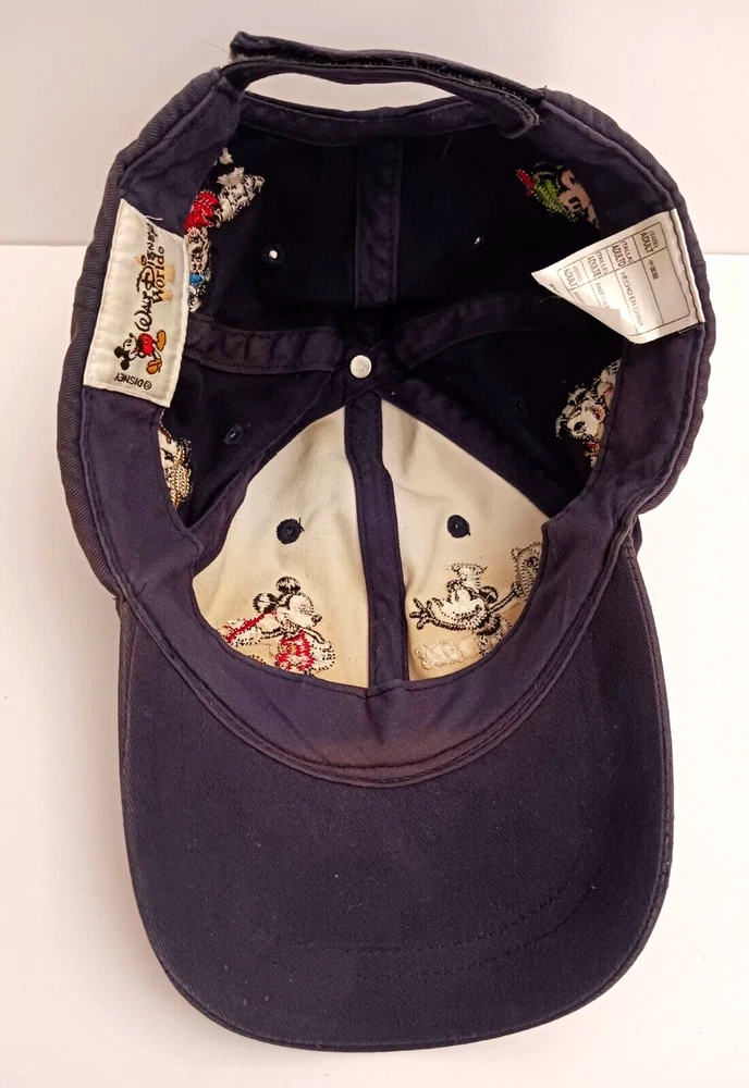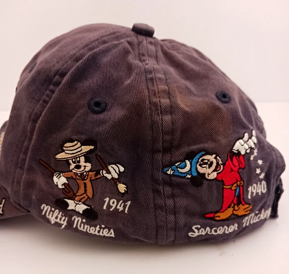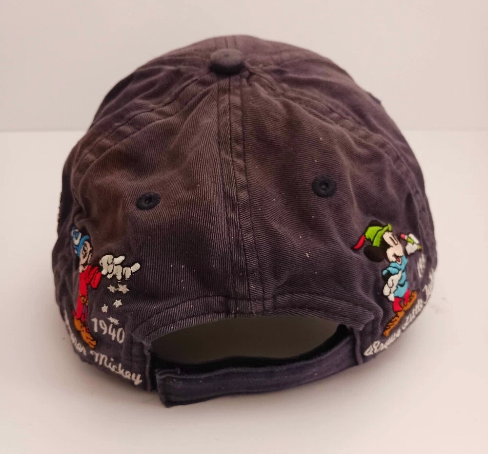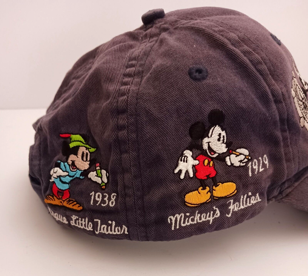 This vintage Disney World hat features Mickey Mouse through the years. Embroidered images of Mickey including Steamboat Willie, Sorcerer, and Brave Little Tailor stitched on all sides of the hat. The navy blue strapback hat is perfect for any Disney fan, suitable for both men and women. It's a great addition to any collection, especially for those who love Disney memorabilia. This hat is very popular and has been produced for many years. The white tag of this hat dates it to the mid- late 90's. Hat is clean but does have some fading in the blue cotton, no rips.
