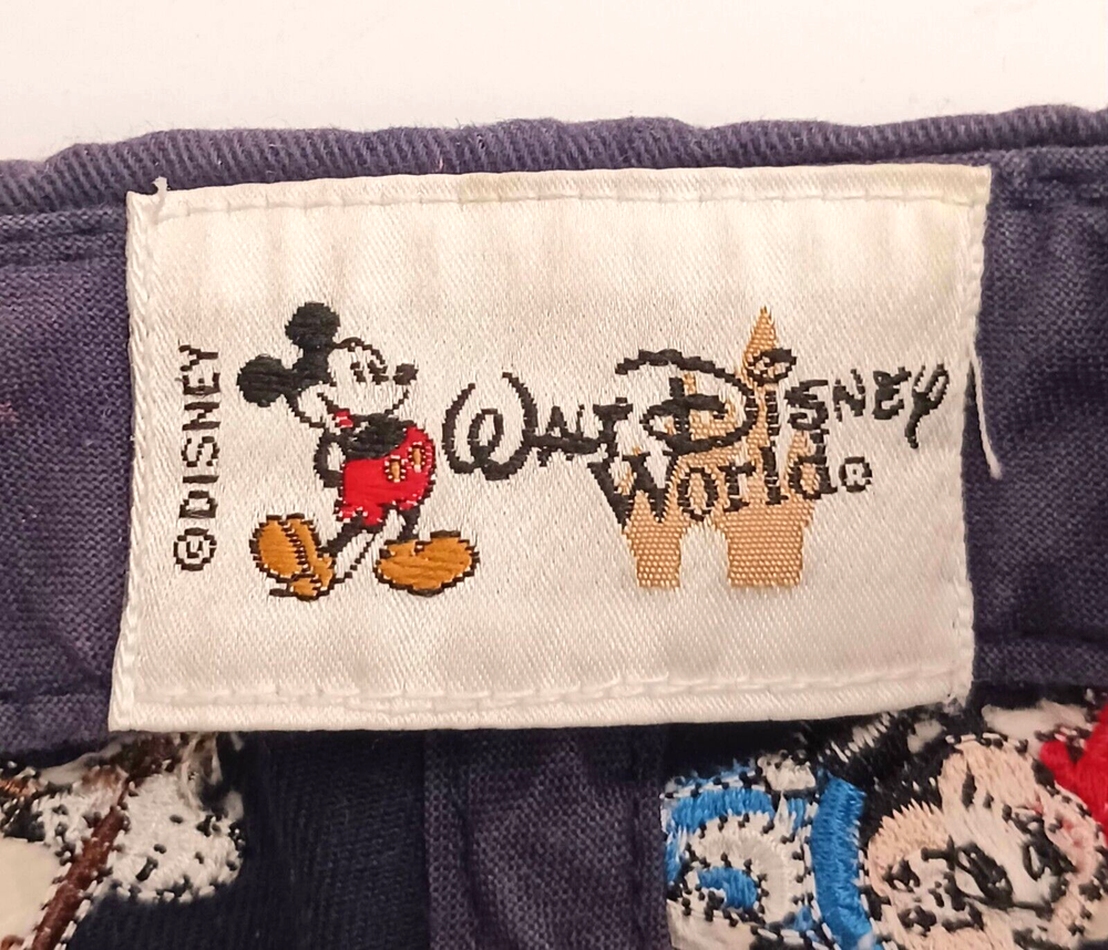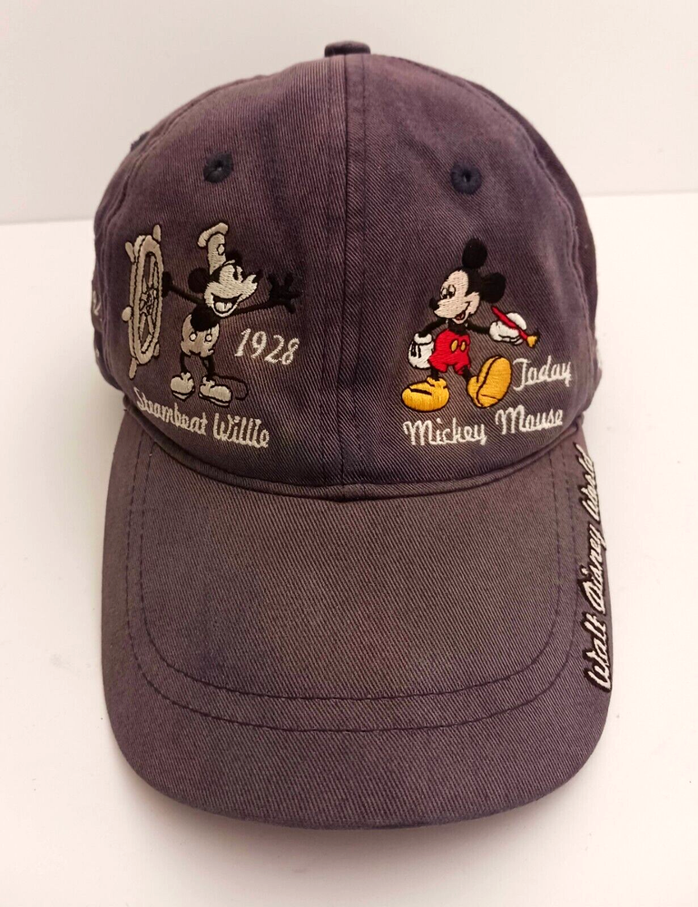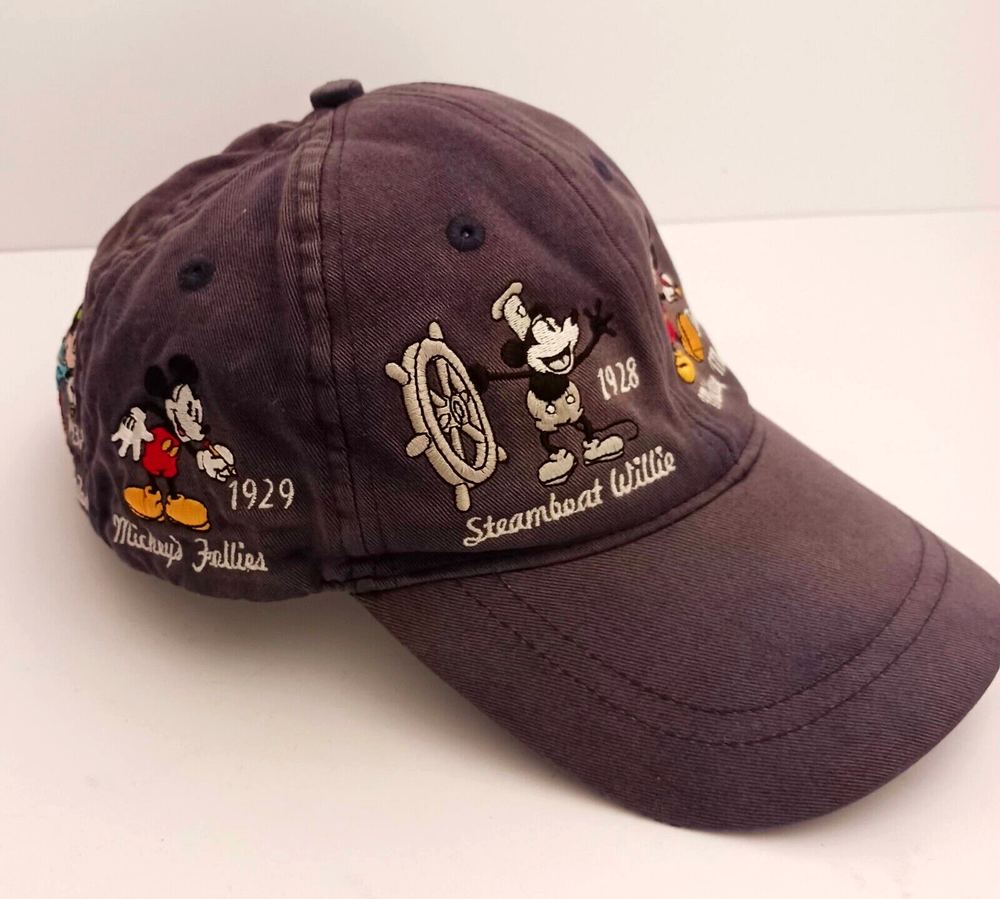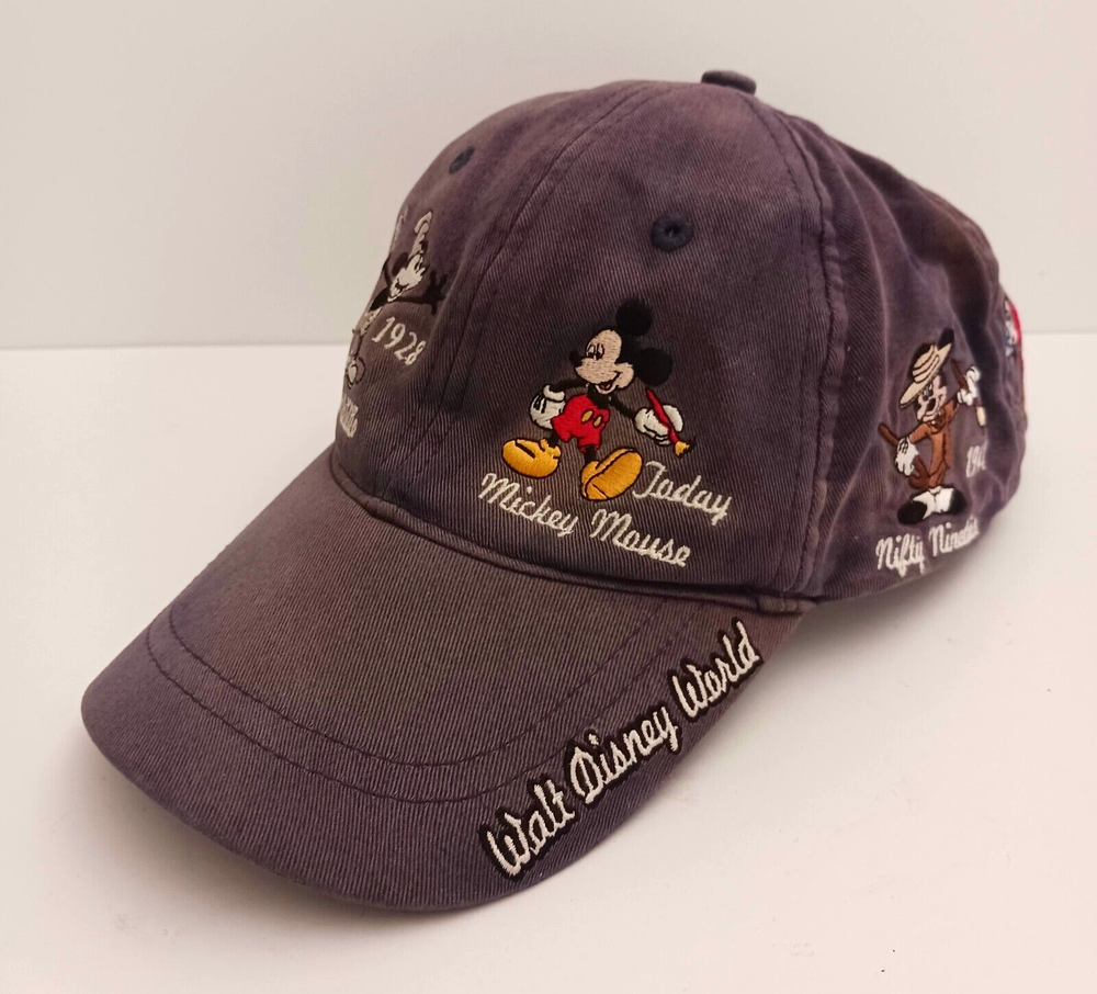 This vintage Disney World hat features Mickey Mouse through the years. Embroidered images of Mickey including Steamboat Willie, Sorcerer, and Brave Little Tailor stitched on all sides of the hat. The navy blue strapback hat is perfect for any Disney fan, suitable for both men and women. It's a great addition to any collection, especially for those who love Disney memorabilia. This hat is very popular and has been produced for many years. The white tag of this hat dates it to the mid- late 90's. Hat is clean but does have some fading in the blue cotton, no rips.