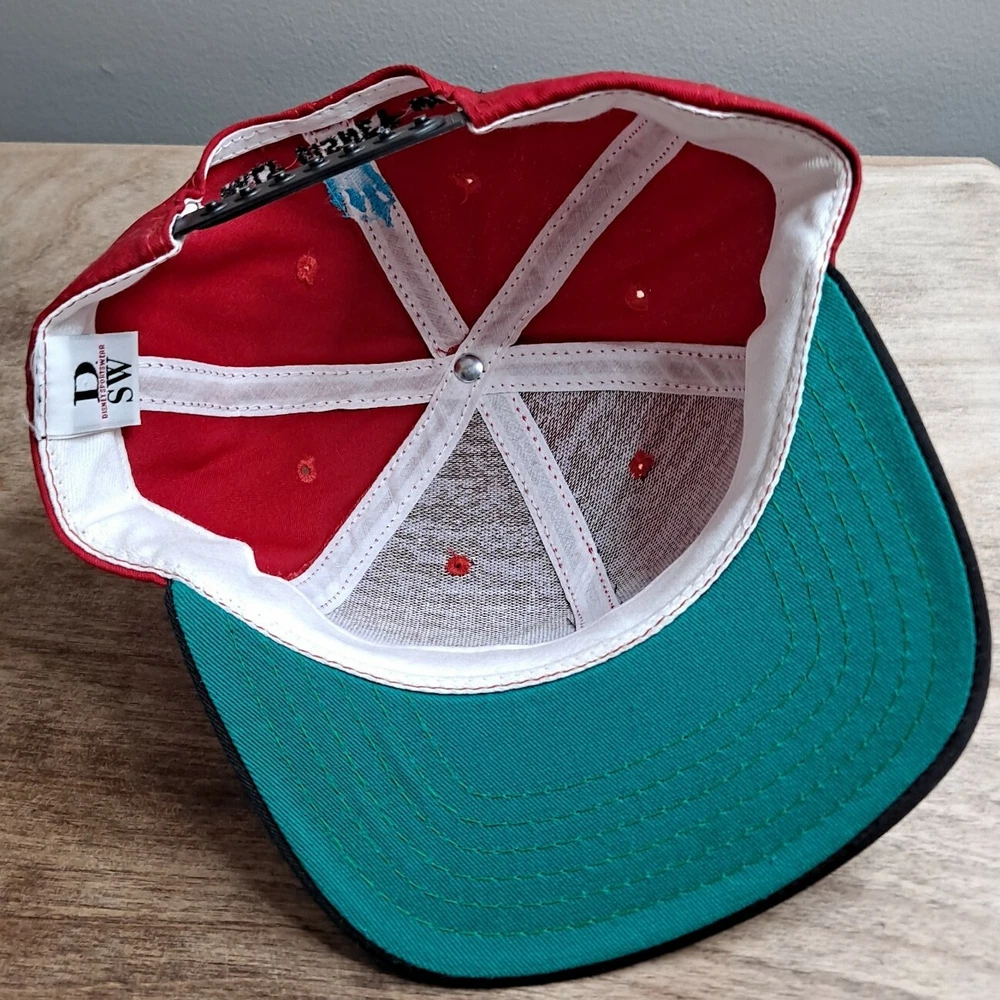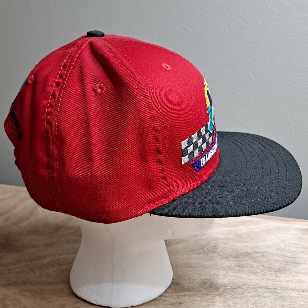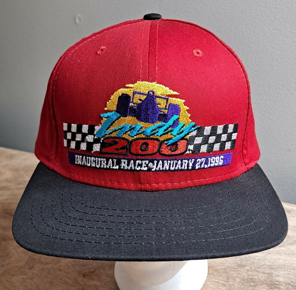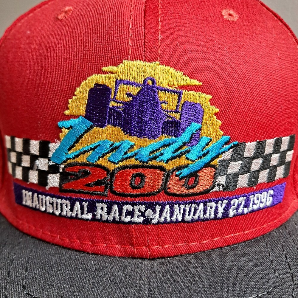 A very nice, pre-owned, vintage Indy 200 at Walt Disney World Inaugural 1996 Race Snapback Hat Made in the USA. Red crown with a black bill and button. Large, full-front embroidery and a second embroidery hit on the back. Shipped in a box for protection of hat.