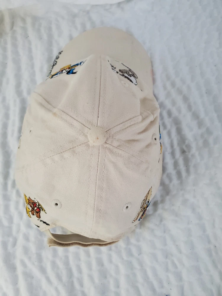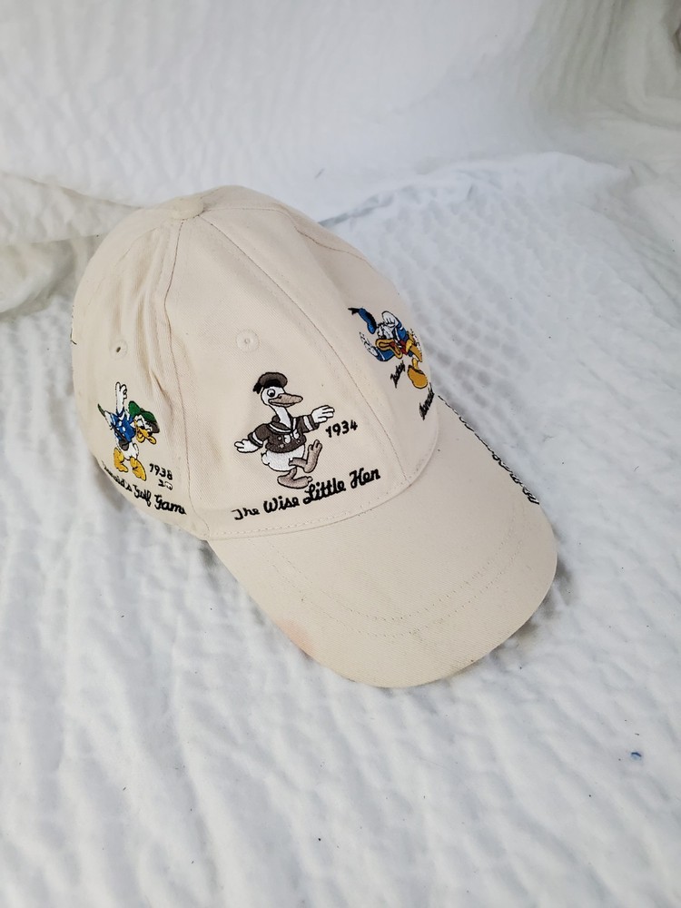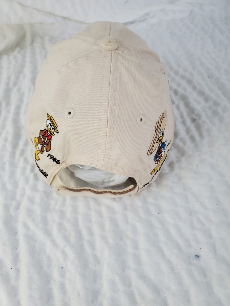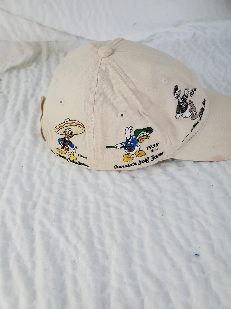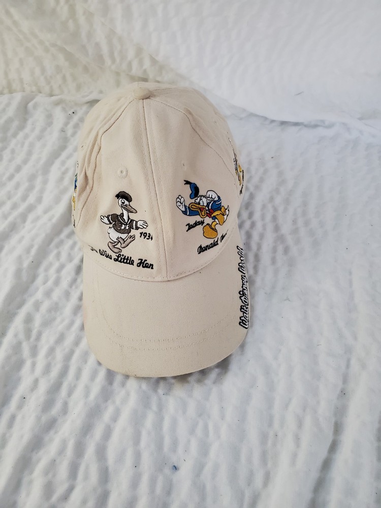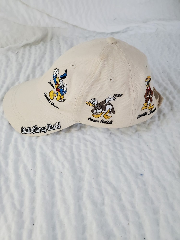 Please see photos. Stain on brim. This is a rare vintage Walt Disney World Donald Duck "Faces Of Donald" adult one size hat. The hat features a white color and a design that showcases different angles of Donald Duck's face. This collectible item is perfect for any Disney fan and is suitable for unisex wear. The hat is made in China and is part of the Disney franchise. It is a great addition to any Disneyana collection.