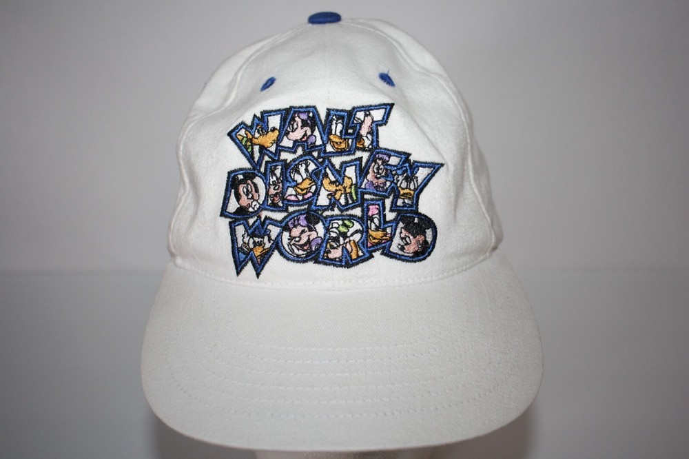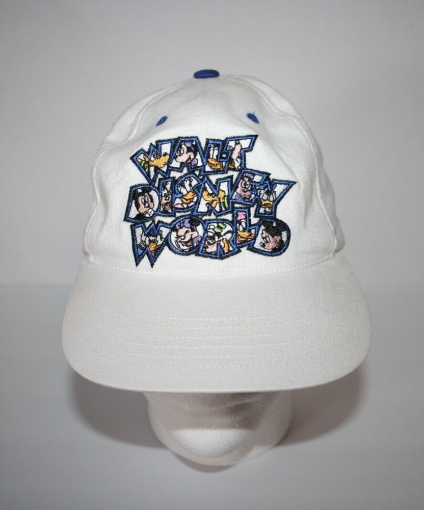 VTG Walt Disney World Baseball Hat White with embroidered lettering and characters on the front Adjustable Preowned in good condition...