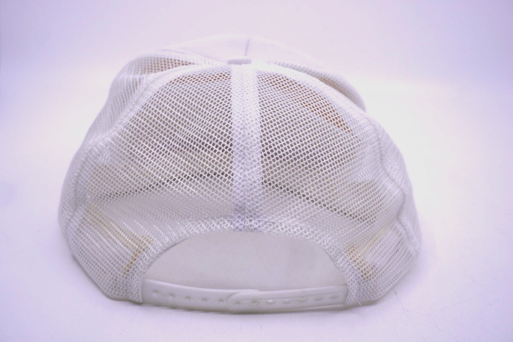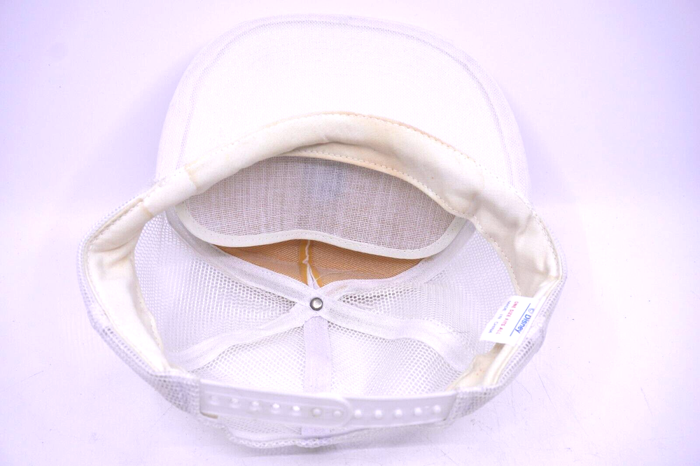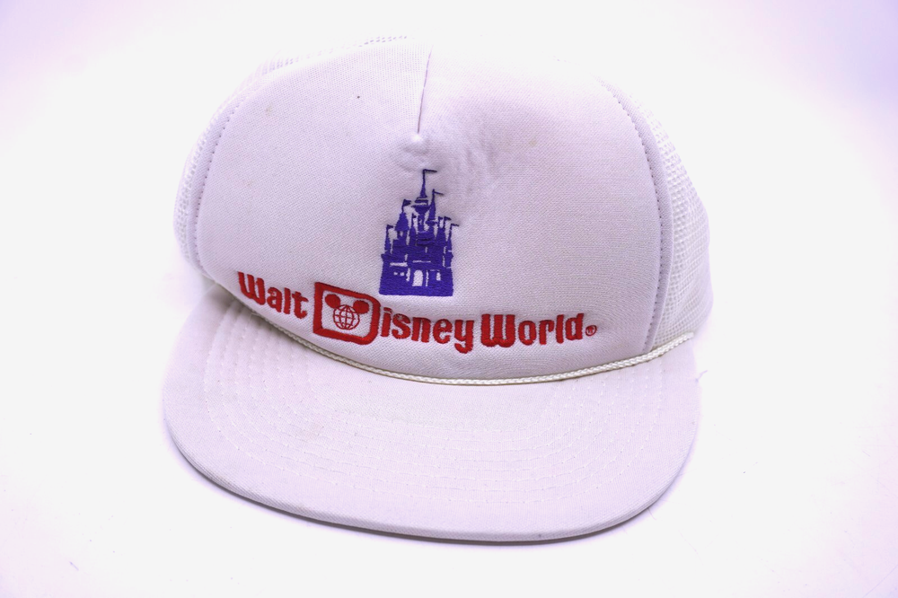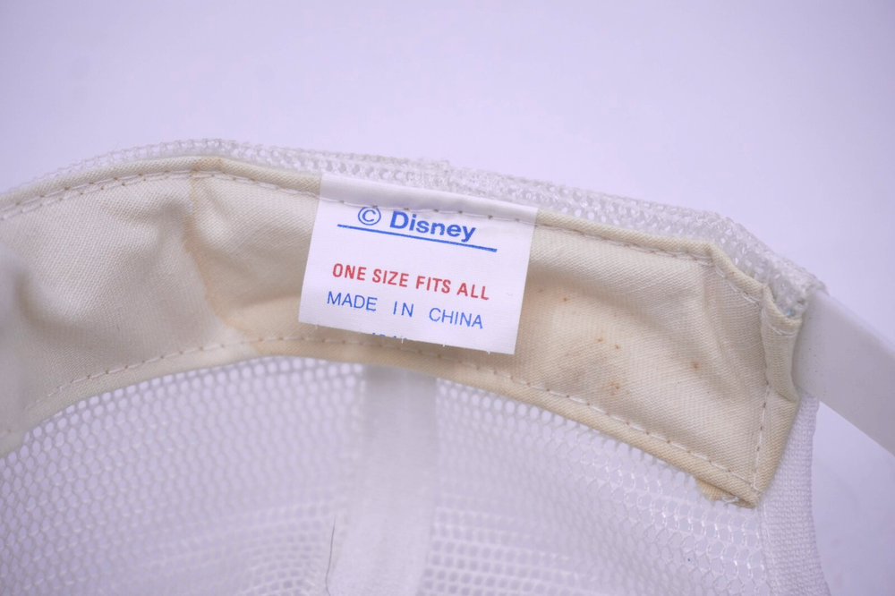 This vintage Walt Disney World snap-back hat is a must-have for any fan of the theme park. The white mesh back provides breathability and the adjustable feature allows for a comfortable fit. The hat features the iconic Disney logo in red and blue, making it a stylish addition to any casual outfit. The snap-back style is perfect for men who want to add a touch of nostalgia to their wardrobe. This hat is perfect for casual occasions and is made in Korea with high-quality materials. Don't miss out on this opportunity to own a piece of Disney history. Bit of yellowing around rim.