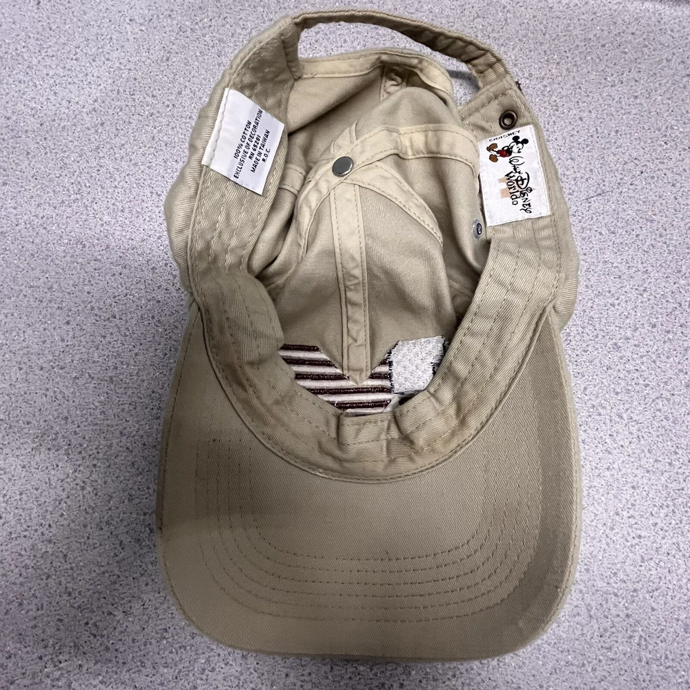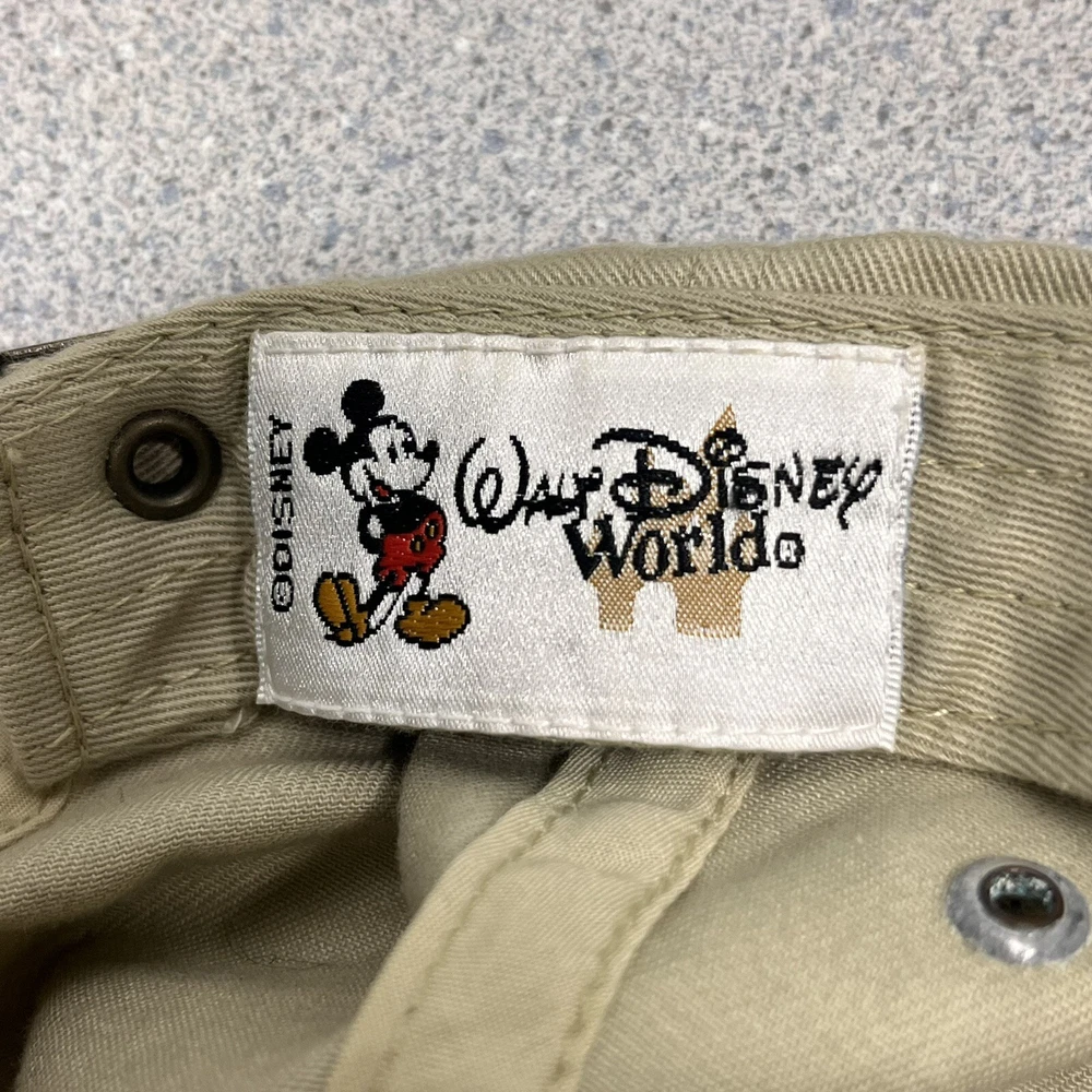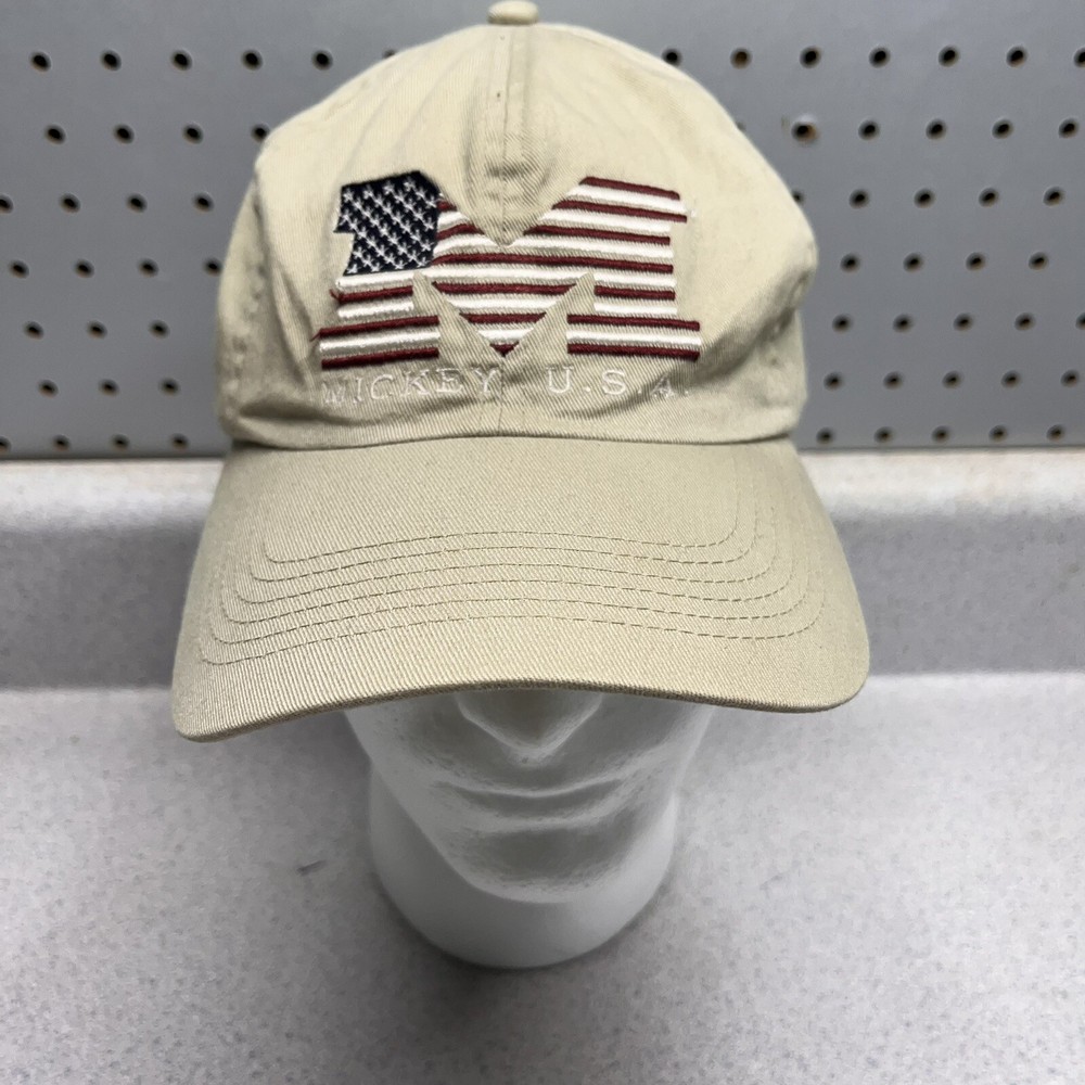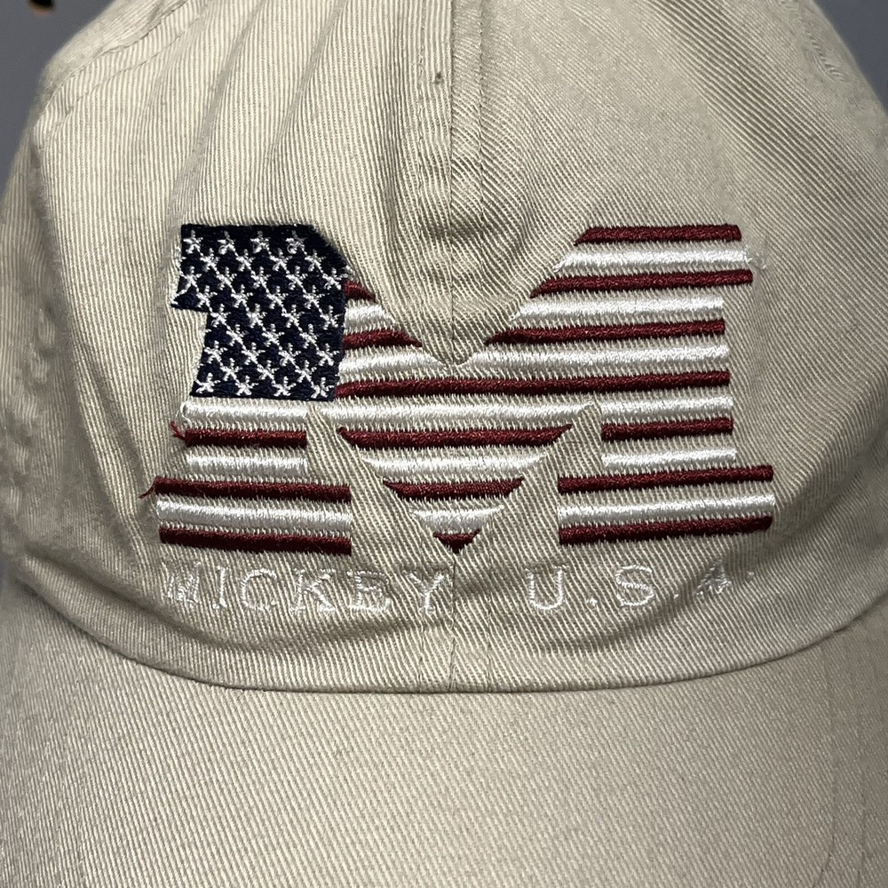 This vintage Walt Disney World Mickey Mouse cap is a must-have for any Disney fan. The beige color and adjustable slideback make it a versatile addition to any collection. The cap features a patriotic design with the iconic Mickey Mouse and is suitable for adult unisex wear. Made in Taiwan, this cap is a genuine Disneyana item and perfect for collectors or as a statement piece for everyday wear.