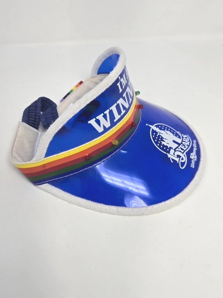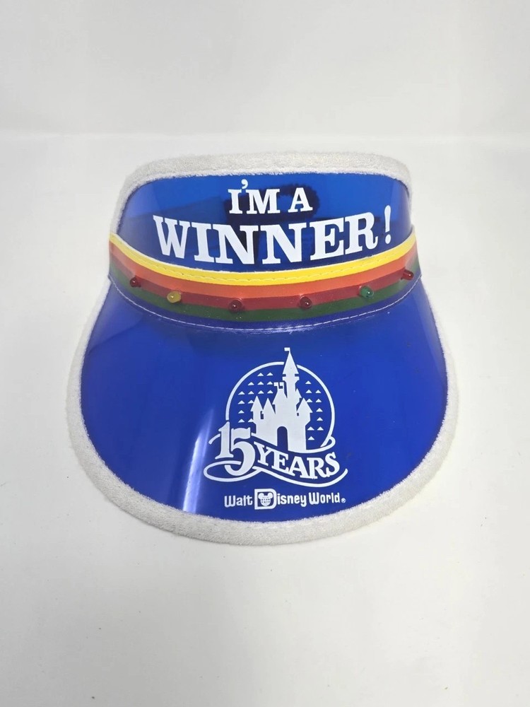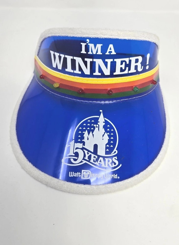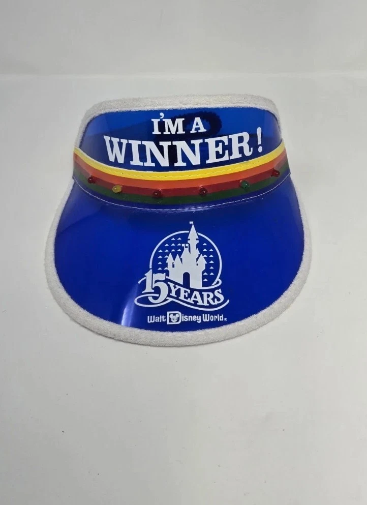 This is a vintage Walt Disney World visor from 1986, celebrating the 15th anniversary of the park. The visor features Mickey Mouse and the words "I'm A Winner" written in blue. It is suitable for unisex adults and was manufactured in the United States. The item is part of the Disneyana collectibles category and is a contemporary piece from 1968 to now.