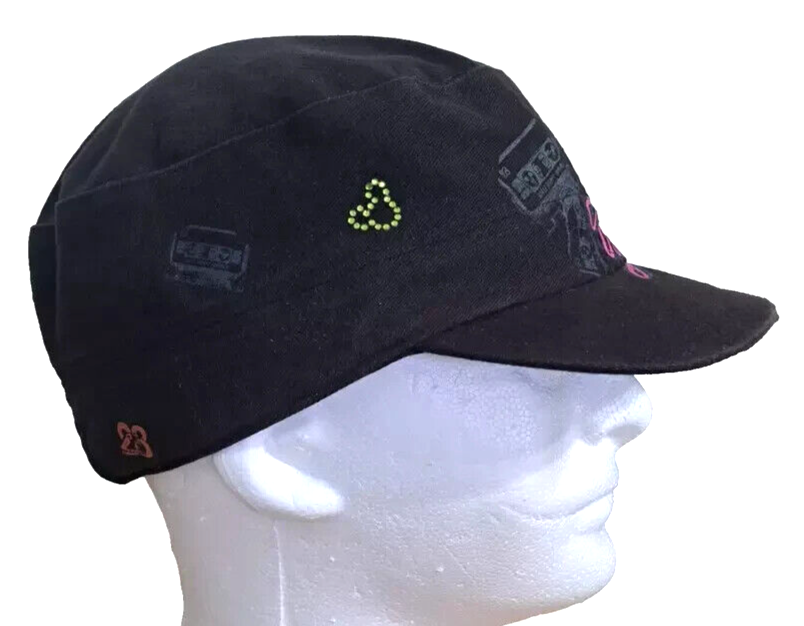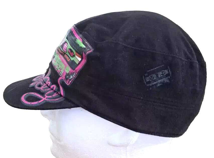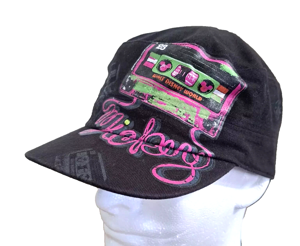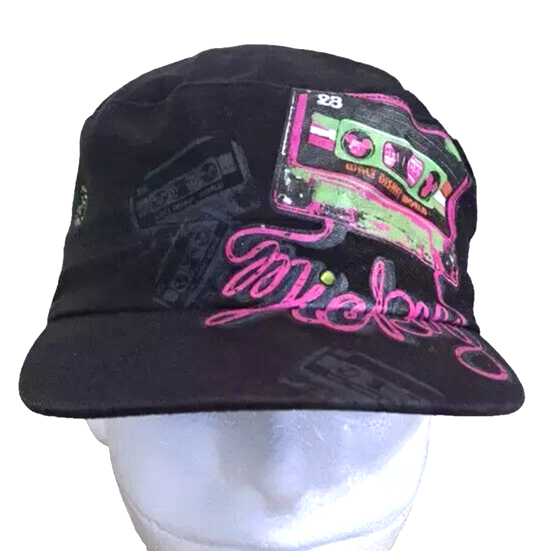 This vintage Walt Disney World Painters Cap Hat features a retro graffiti style from the 80s or 90s, showcasing a design inspired by the iconic Disney character Mickey Mouse. The black cap is one size fits all, suitable for adults, and part of the Disney franchise collection. It offers a nostalgic and timeless appeal, perfect for fans of Disney looking to add a unique and collectible piece to their apparel and accessories collection.