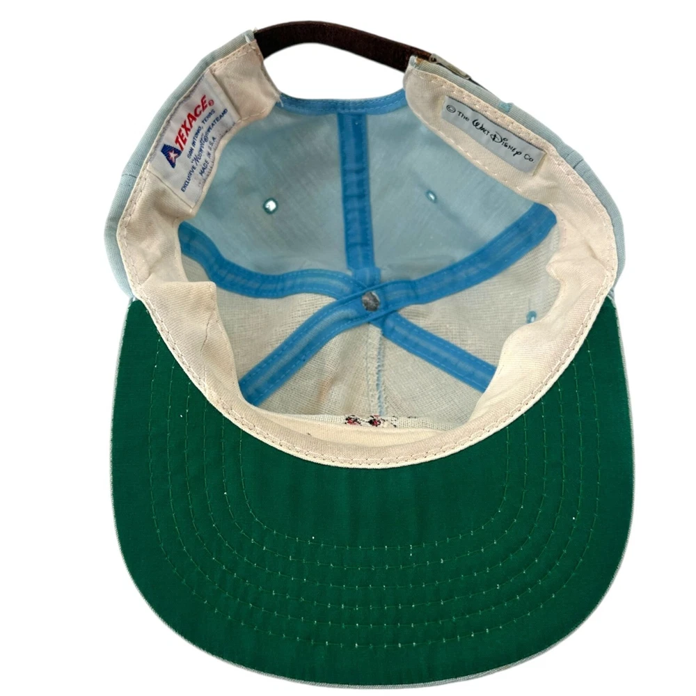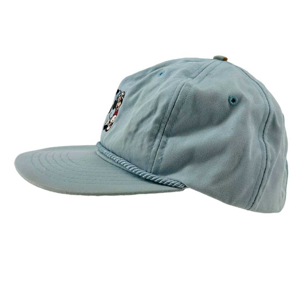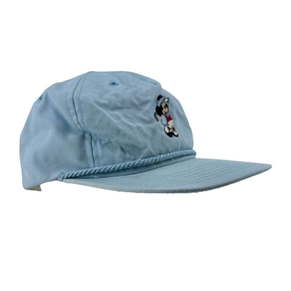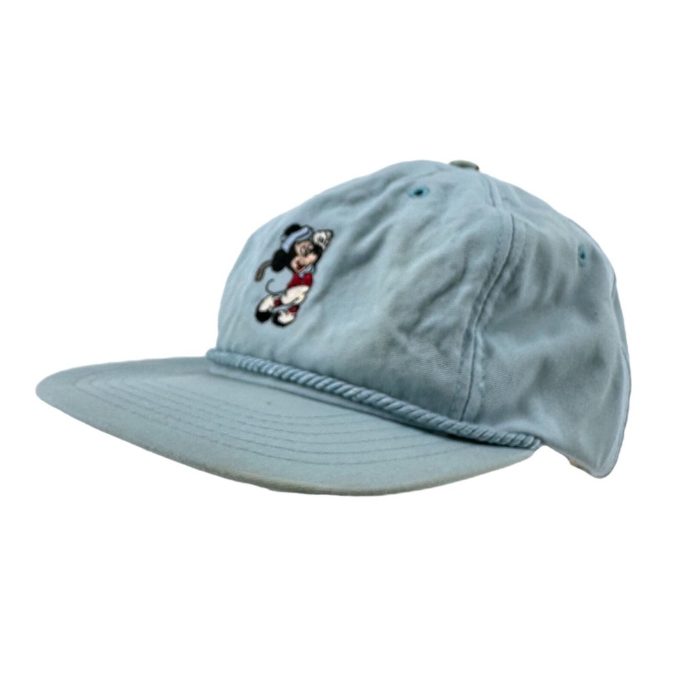 Vintage 80s Walt Disney World Golf Strapback Hat Sky Blue Mickey Mouse USA Made SKU:203-021 Features: • Strapback, Adjustable, Embroidered, Vintage • Made in United States Condition: Pre-Owned Some rust discoloration on back of hat by strapback, buckle, and to top button. Please, see photos! Any and all flaws will be shown in the detailed pictures. Please see pictures for an accurate description of the item and condition. Colors vary based on perception and screen display.