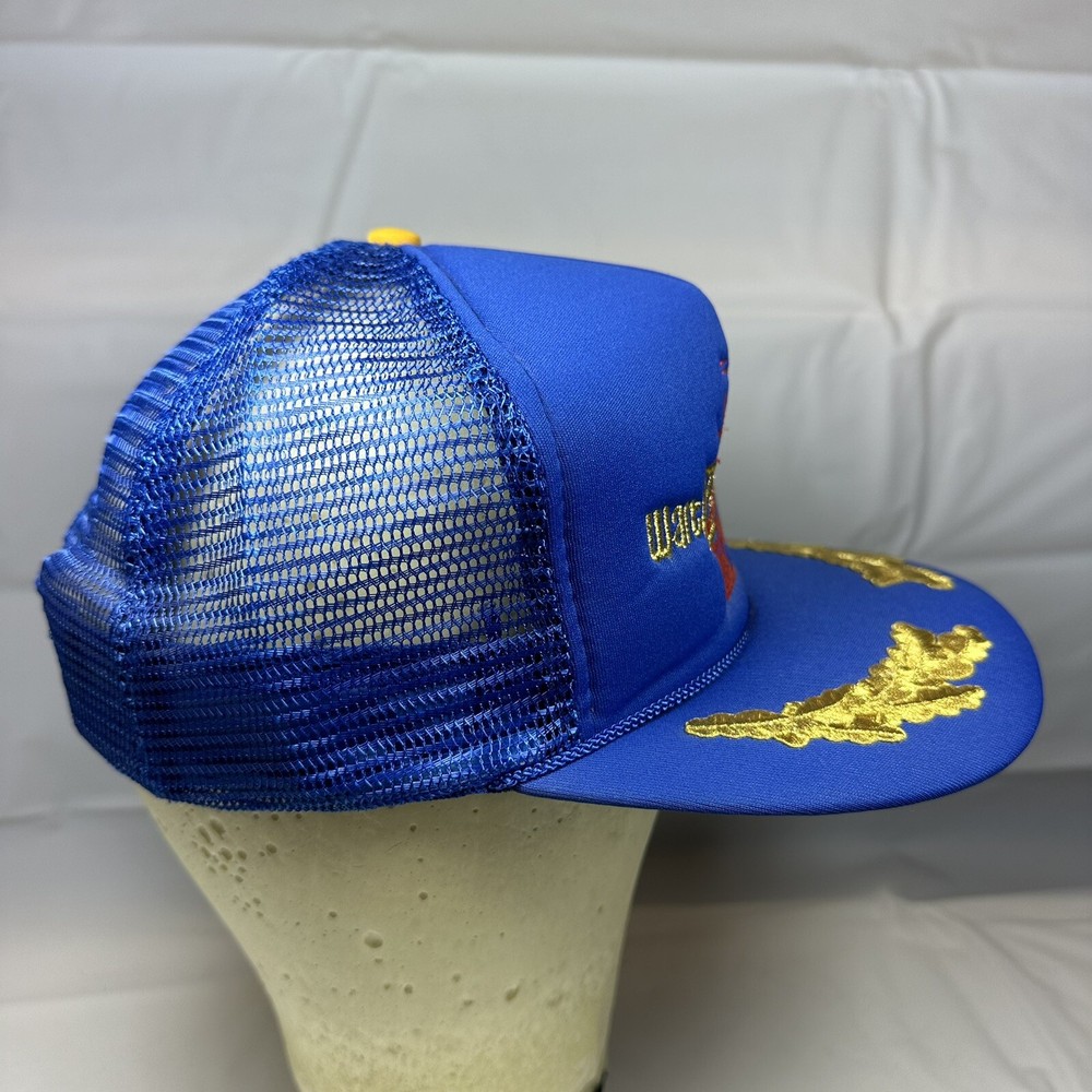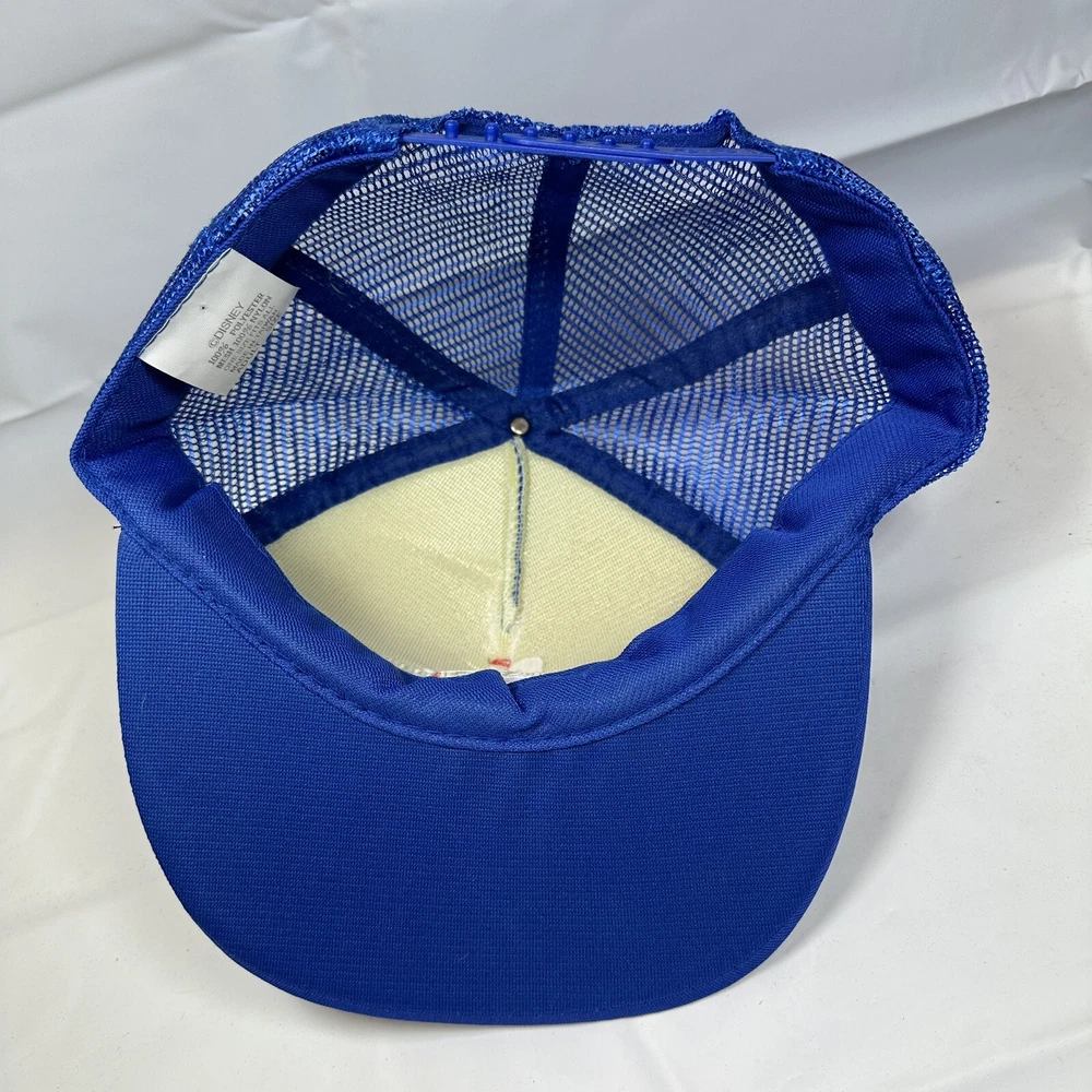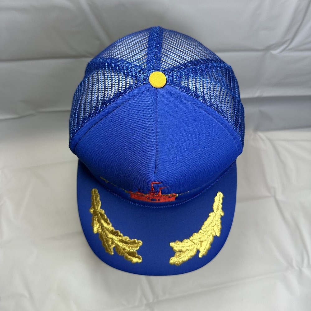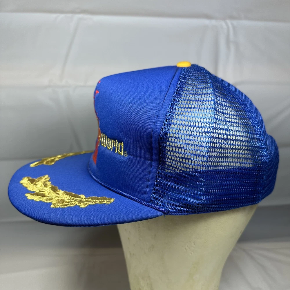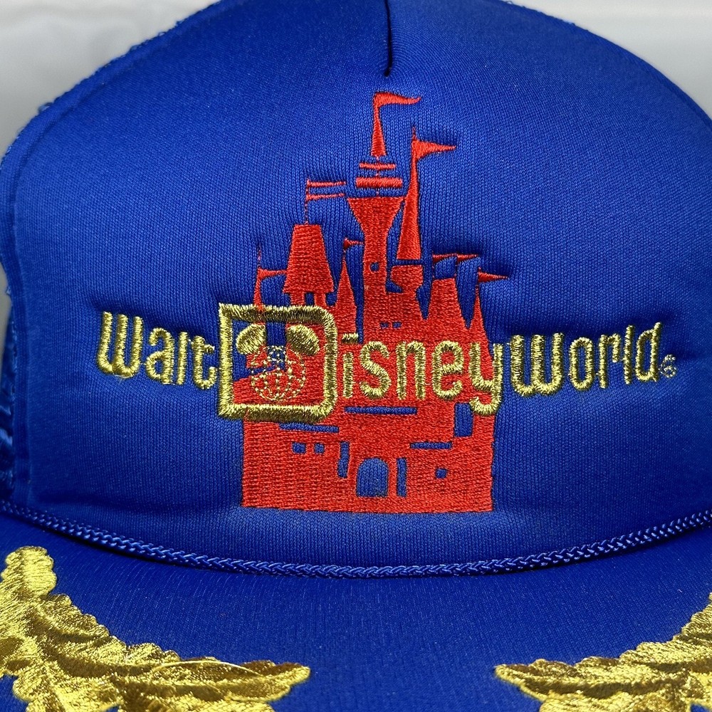 Vintage 80s Walt Disney World Snapback Trucker Hat, Blue Cap w/ Scrambled Eggs This hat is in excellent pre-owned condition. DISCLAIMER: "One Size" does not guarantee that this hat will fit YOUR head (They fit most). If you have ever had problems with adjustable hats fitting you before please contact me before purchasing. Thank you. See pictures for more details or feel free to message me with any questions. 3 DAY HANDLING TIME. FREE SHIPPING.