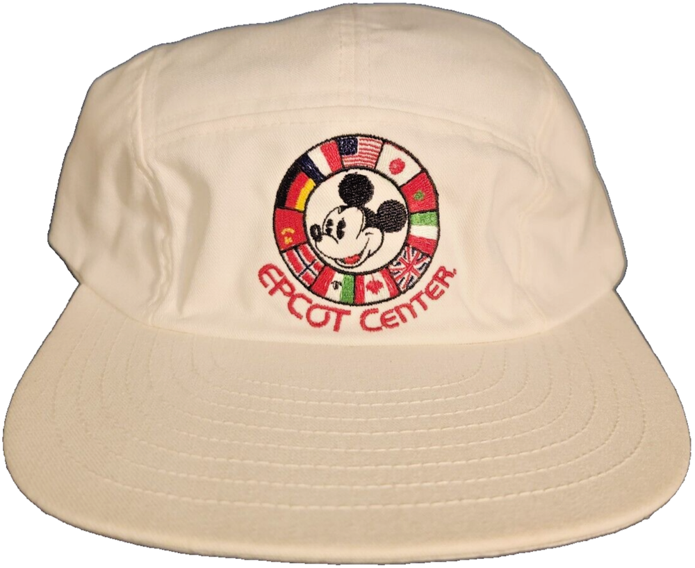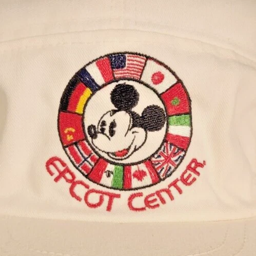 This vintage Atlas Co, Walt Disney World Flags Around the World Mickey Mouse Epcot Center hat is perfect for any Disney fan. The hat features a colorful design with flags from around the world around the iconic Mickey Mouse. It has an elastic conforming strap to fit most head sizes and is suitable for both men and women. The hat is a great addition to any Disneyana fan collection and is made in the United States.