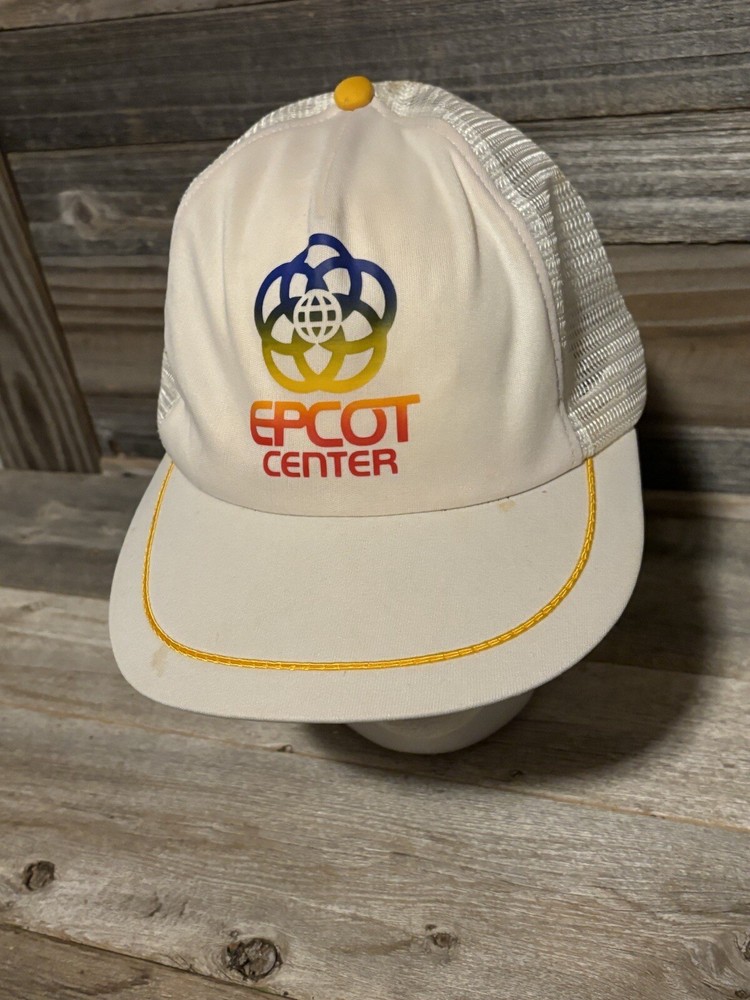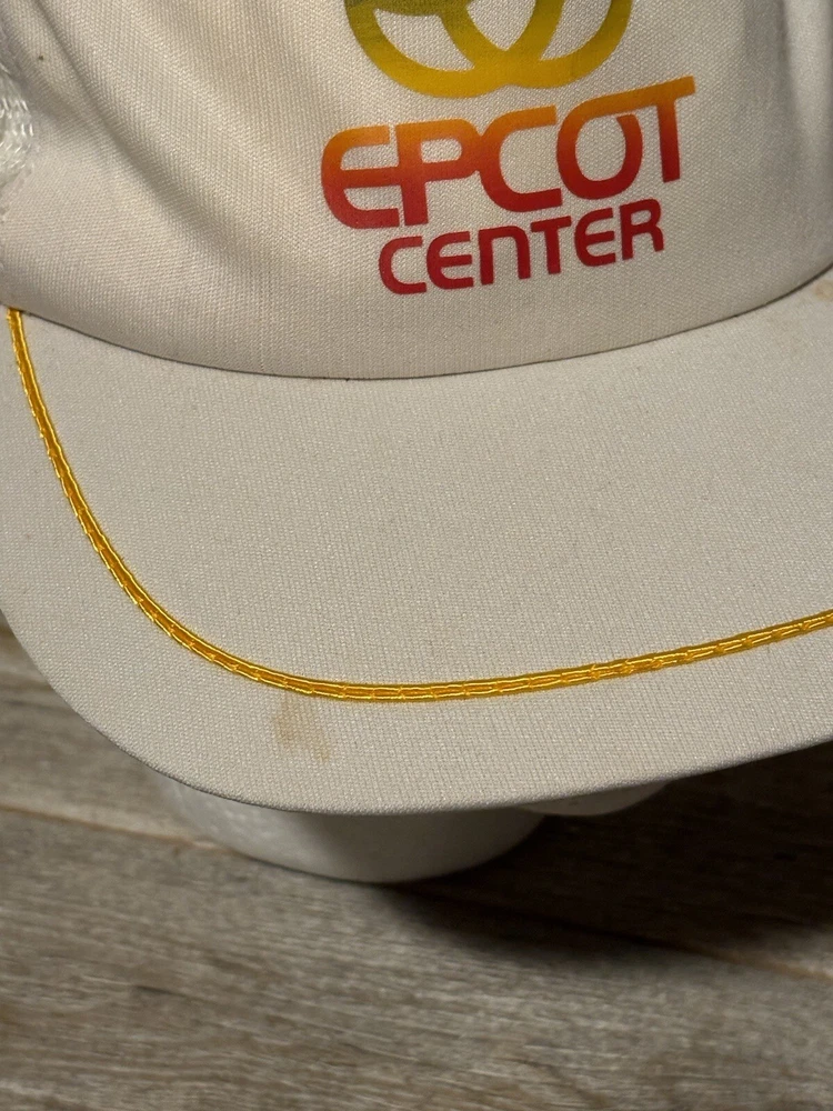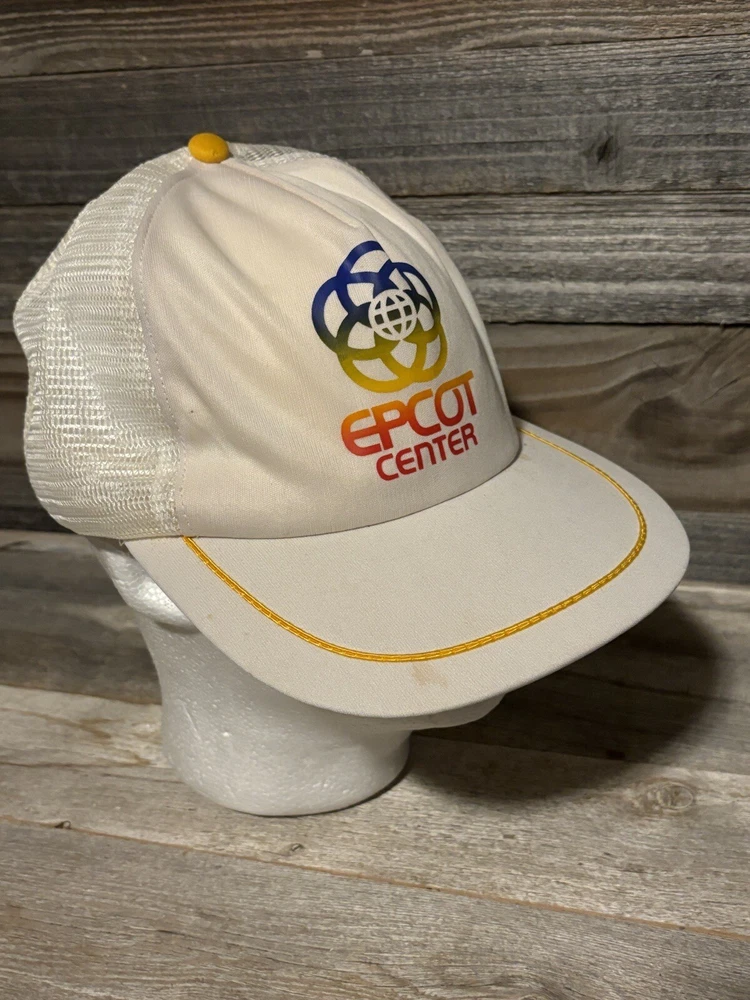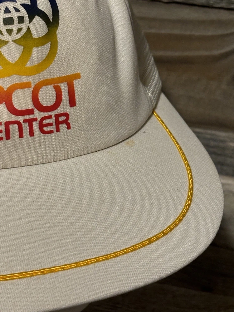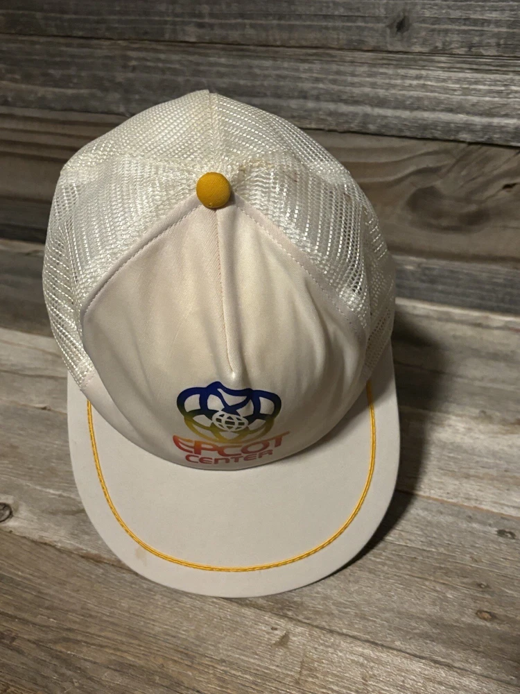 Add a touch of nostalgia to your wardrobe with this vintage California Headwear Epcot Center white snapback hat from Walt Disney World. The colorful American theme makes it perfect for any casual occasion. The adjustable size ensures a comfortable fit, and the solid pattern and blue character add a fun element to your outfit. Crafted from polyester and canvas fabric type, this hat is a true testament to American-made quality. The brand, California Headwear, and the fact that it was made in the United States adds to its uniqueness. Whether it's winter, summer, fall, or spring, this hat is perfect for any season. Get your hands on this piece of history now! *please note last photo of the foam padding under inner mesh forehead area is deteriorating and falling out.
