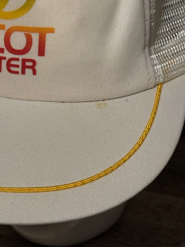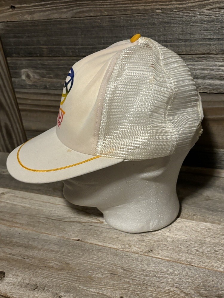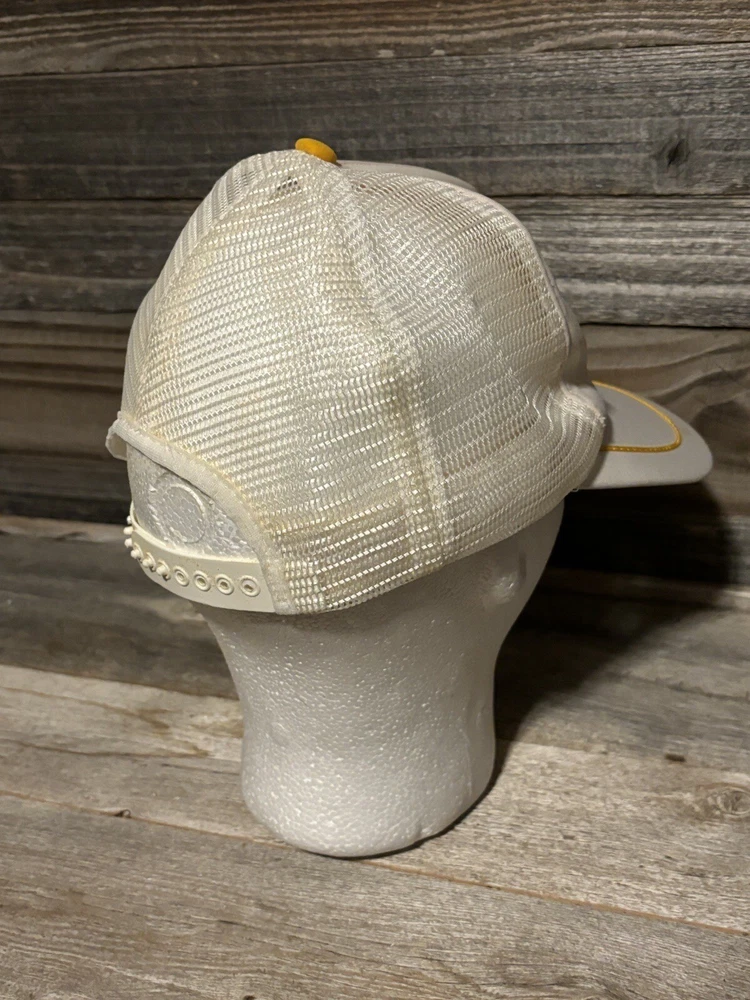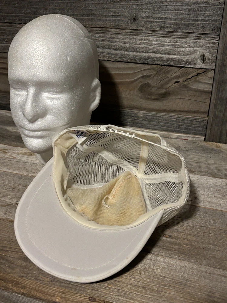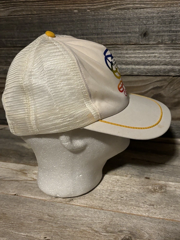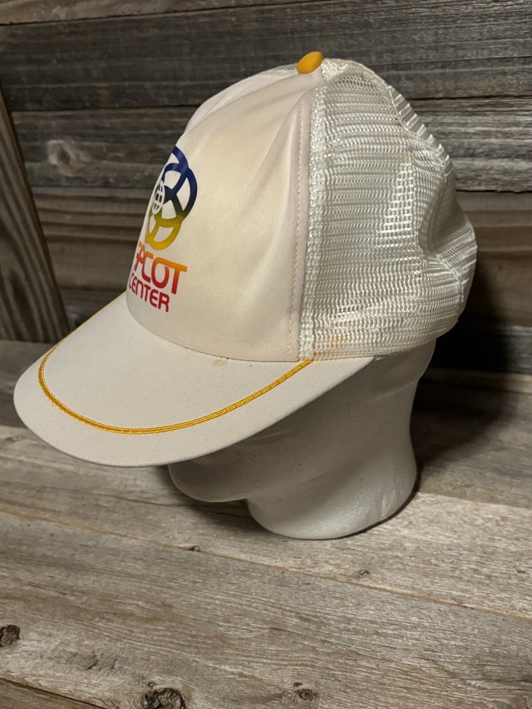 Add a touch of nostalgia to your wardrobe with this vintage California Headwear Epcot Center white snapback hat from Walt Disney World. The colorful American theme makes it perfect for any casual occasion. The adjustable size ensures a comfortable fit, and the solid pattern and blue character add a fun element to your outfit. Crafted from polyester and canvas fabric type, this hat is a true testament to American-made quality. The brand, California Headwear, and the fact that it was made in the United States adds to its uniqueness. Whether it's winter, summer, fall, or spring, this hat is perfect for any season. Get your hands on this piece of history now! *please note last photo of the foam padding under inner mesh forehead area is deteriorating and falling out.