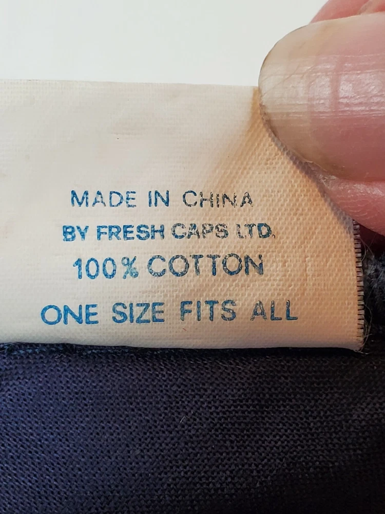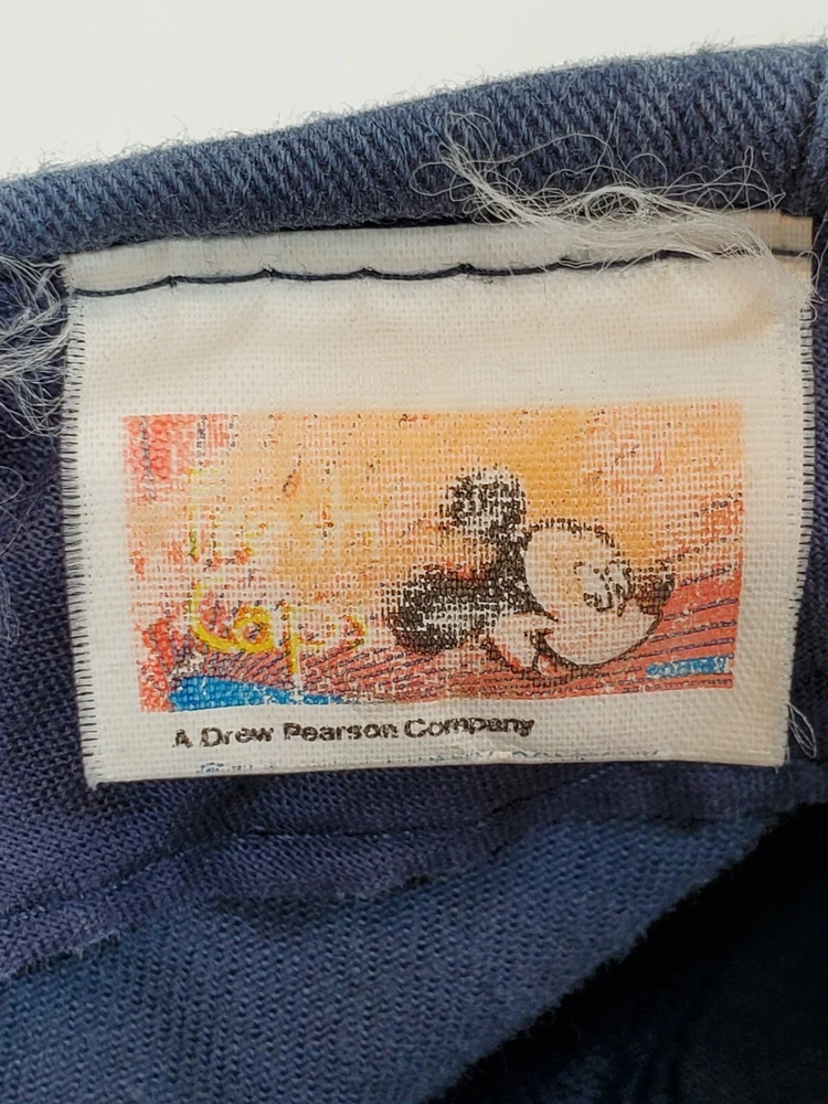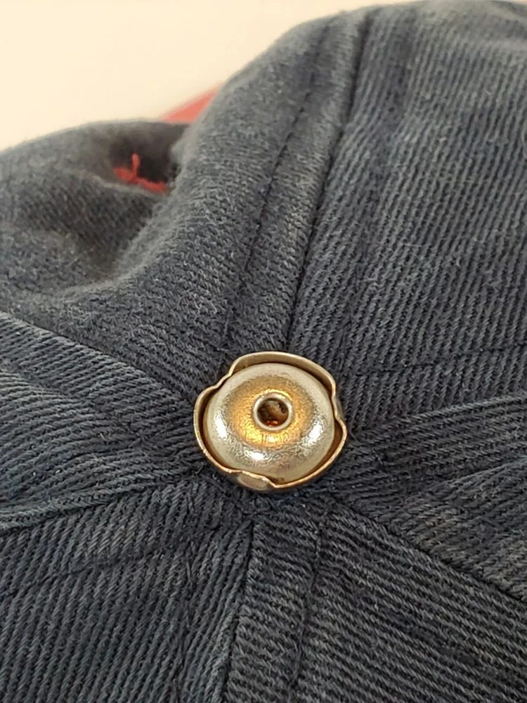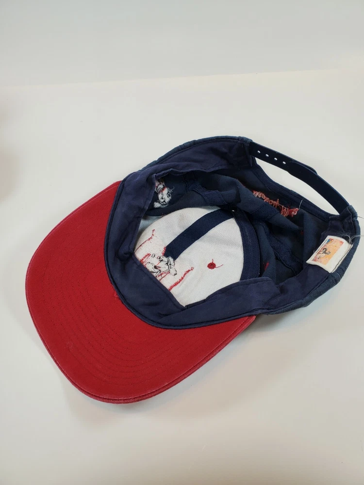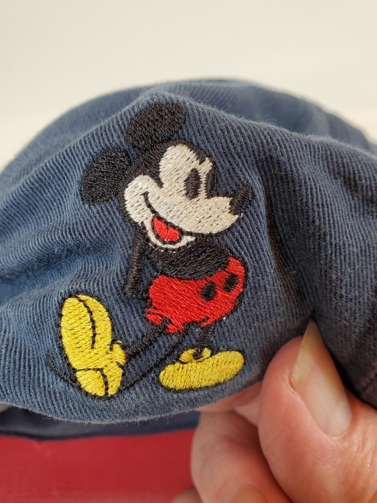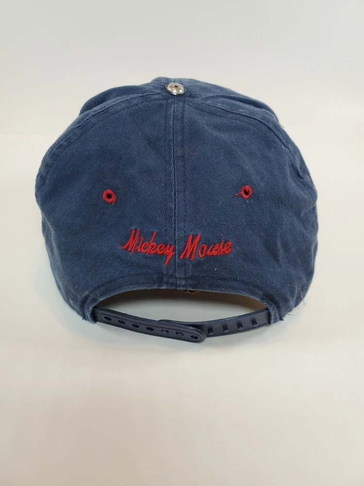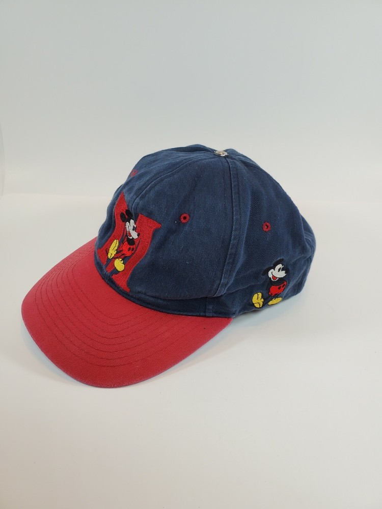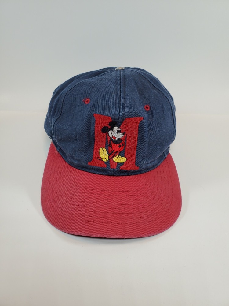 Vintage Mickey Mouse M Logo SnapBack Baseball Cap, Two-Tone Navy/Red Embroidered. Good condition. Shows wear from age. The fabric has come off the top button. (see pic)