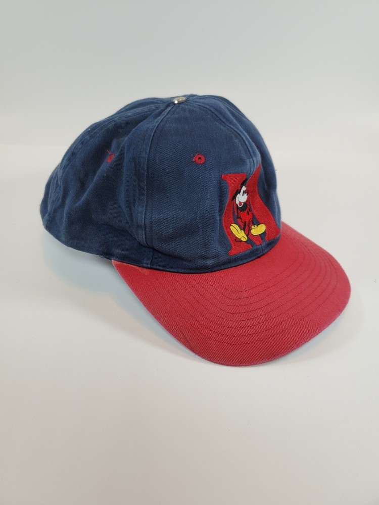 Vintage Mickey Mouse M Logo SnapBack Baseball Cap, Two-Tone Navy/Red Embroidered. Good condition. Shows wear from age. The fabric has come off the top button. (see pic)...