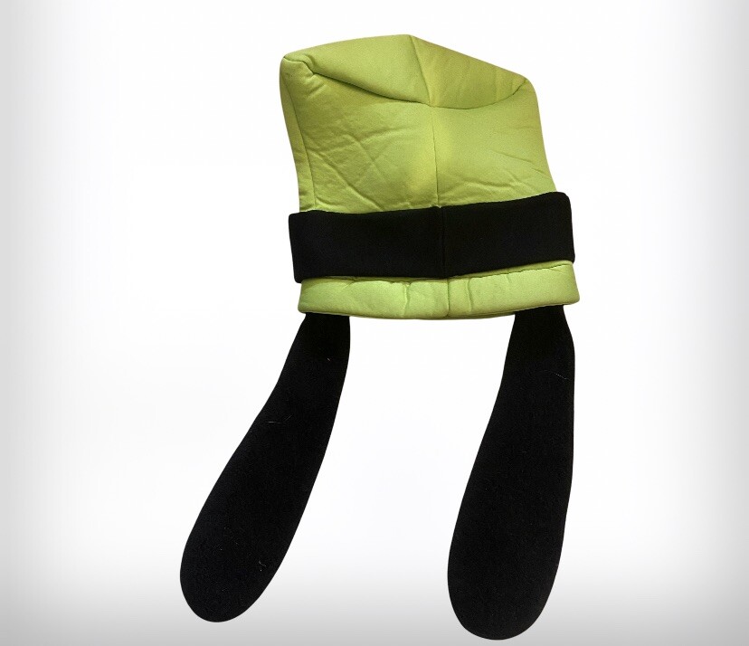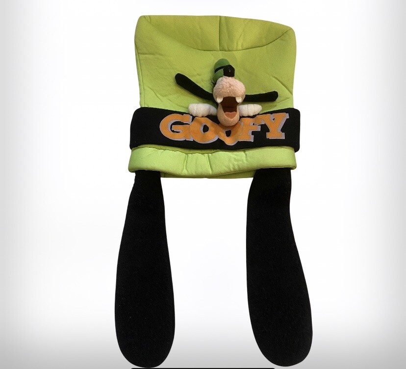 This is a vintage Disney World Goofy hat. The hat is tall and green with fuzzy floppy ears. It features the Disney brand and is perfect for fans of the Goofy character. The hat is suitable for unisex Youth although can fit an adult and would make a great addition to any Disney Parks collection.