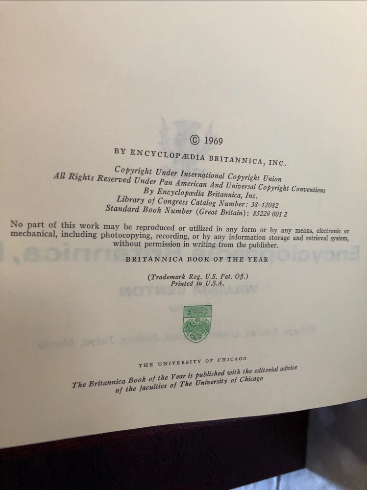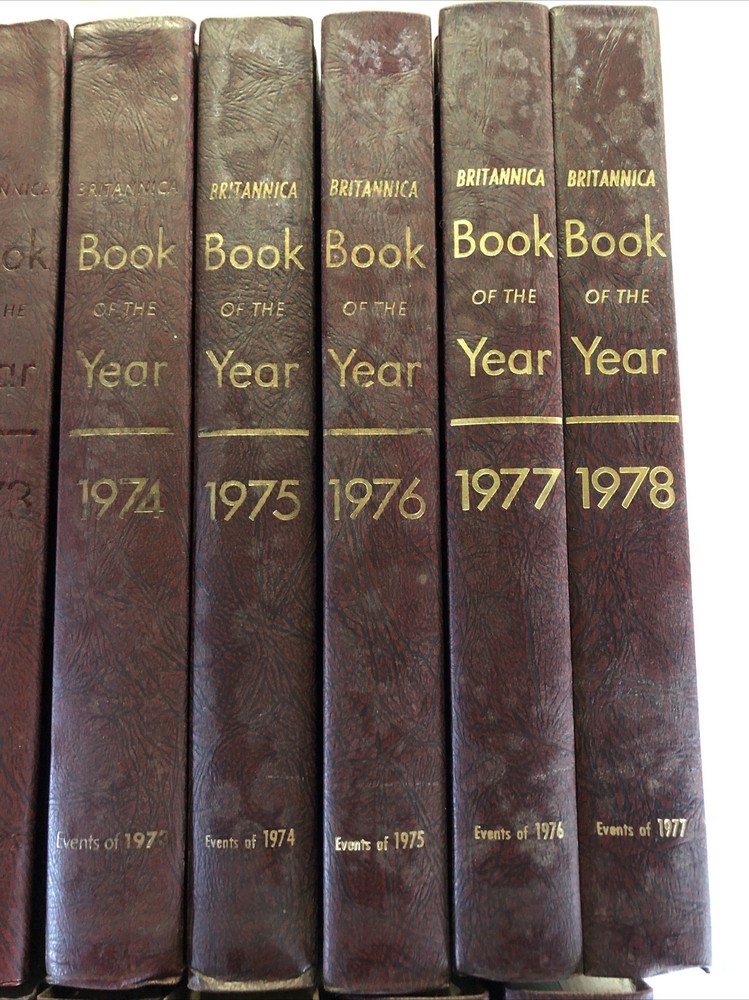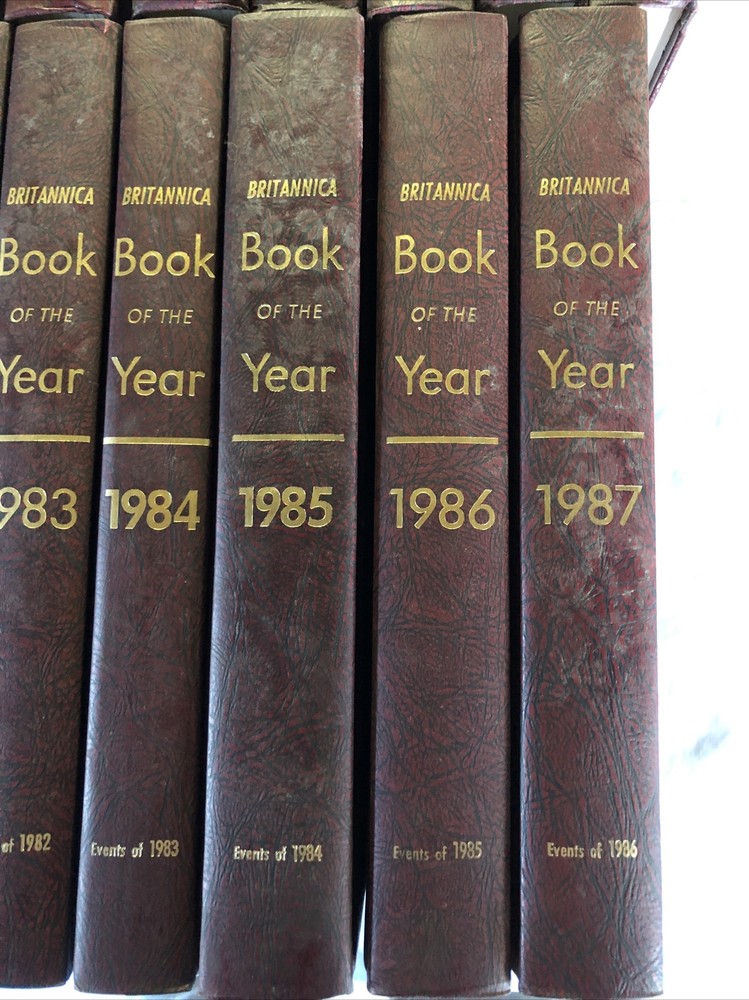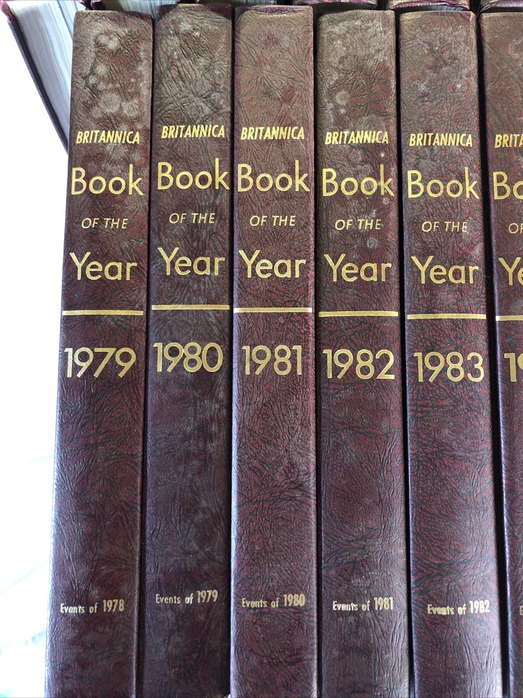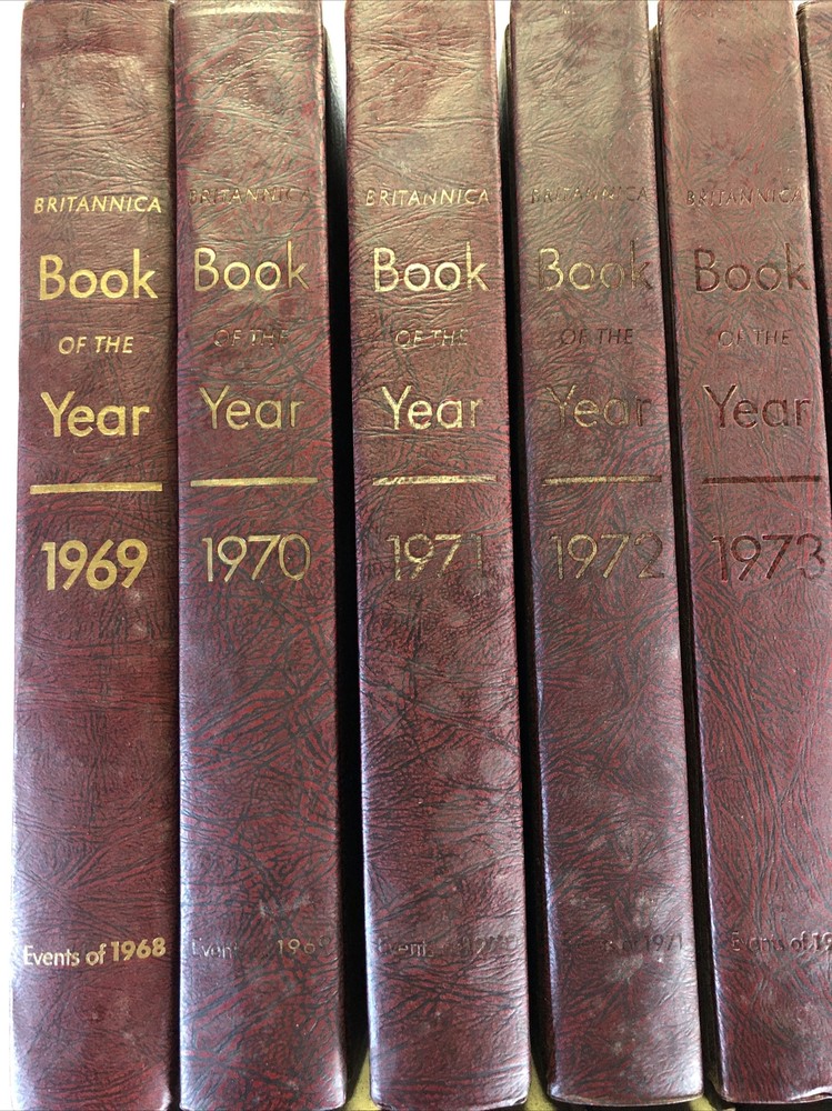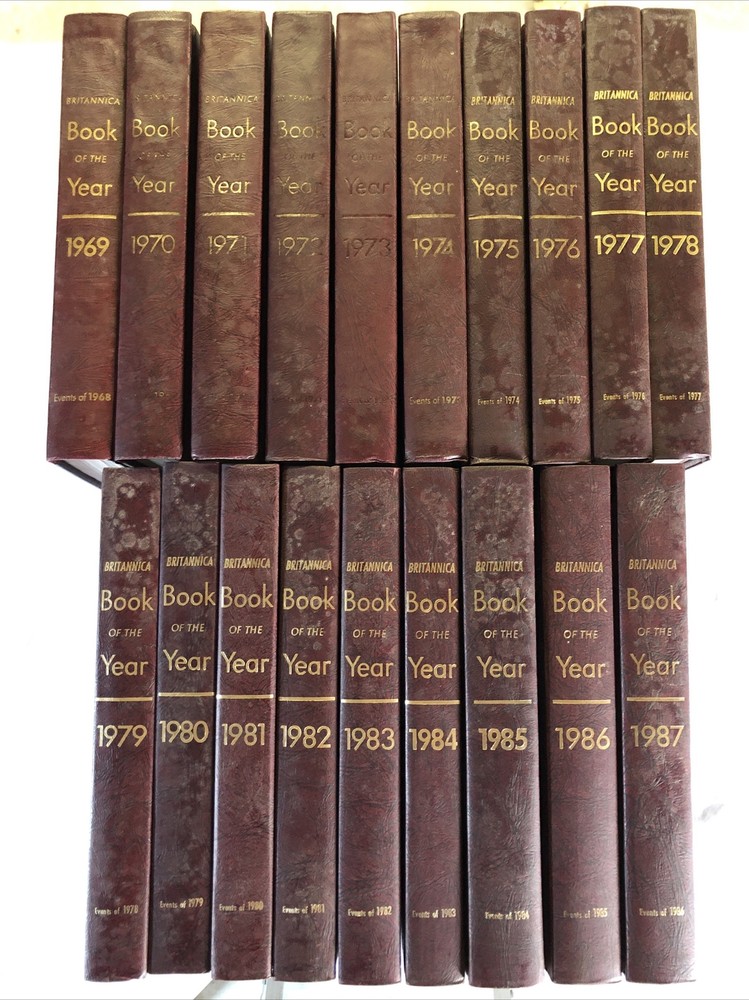 Vintage Encyclopedia Britannica Book of the Year 1969–1987 (19 Total Books). Included are each year from 1969 through 1987. All are in great condition with only minor areas to surface clean on binding and cover. The pages are complete and in great shape as well; no rips, tears. Bindings are solid as well, having had minimal use. Additional photos can be taken upon request, and if you have have questions feel free to ask.