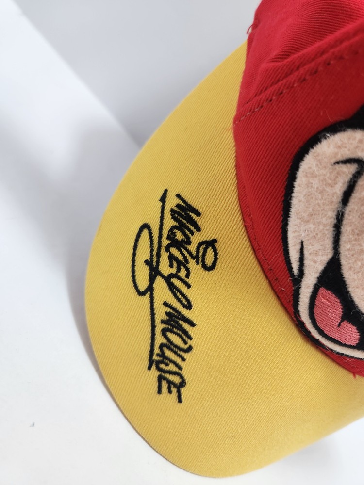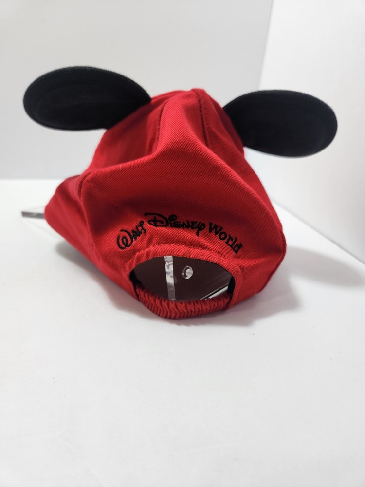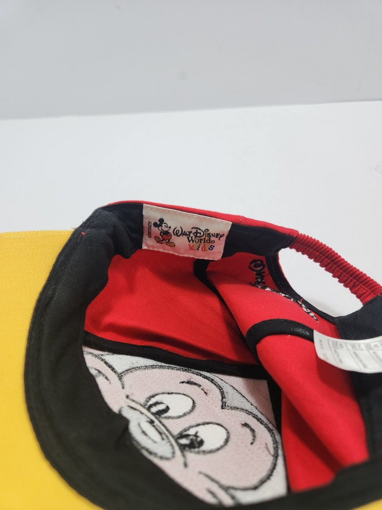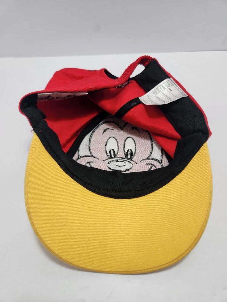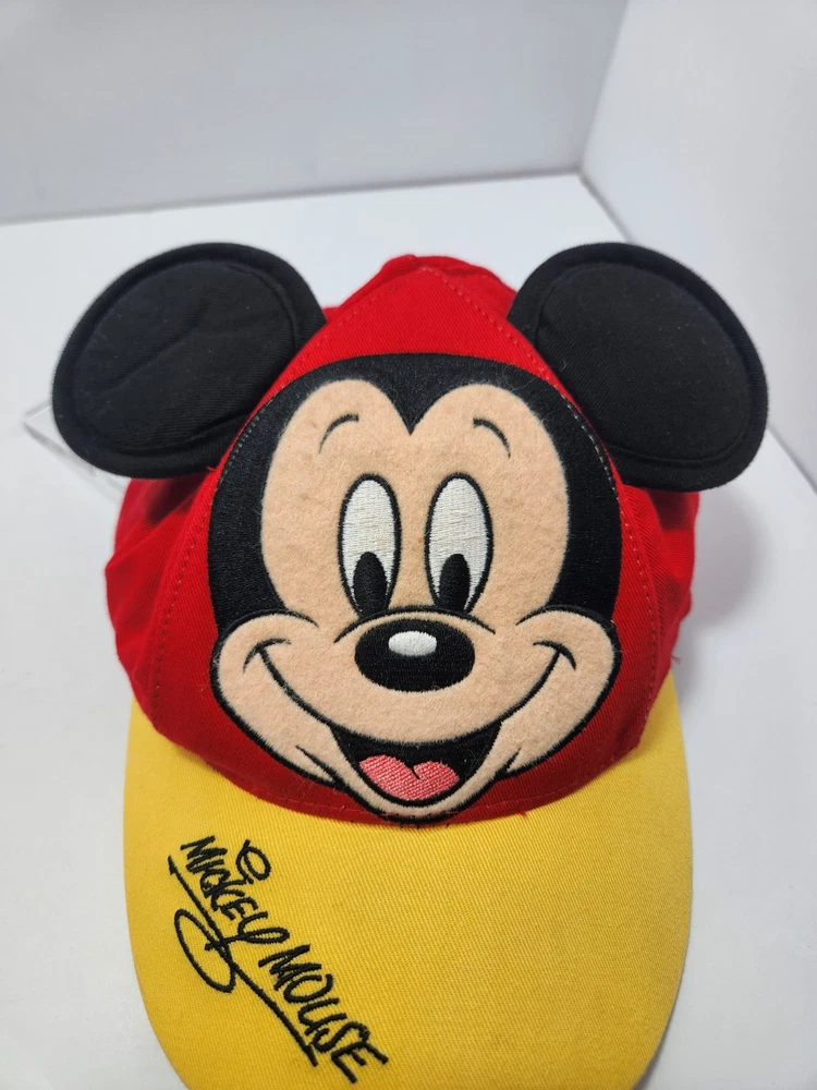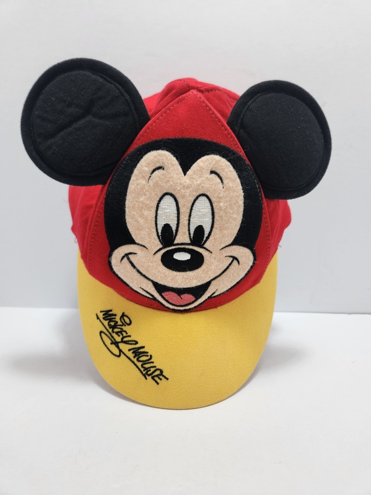 This vintage kids' Mickey Mouse hat with ears is a nostalgic piece from Walt Disney World. The hat features classic red and yellow colors, staying true to Mickey Mouse's iconic look. The Disney brand and franchise are highlighted, making it a must-have for collectors of Disneyana and fans of the beloved character. Perfect for young Disney enthusiasts, this hat captures the timeless charm of Mickey Mouse in a fun and wearable accessory.