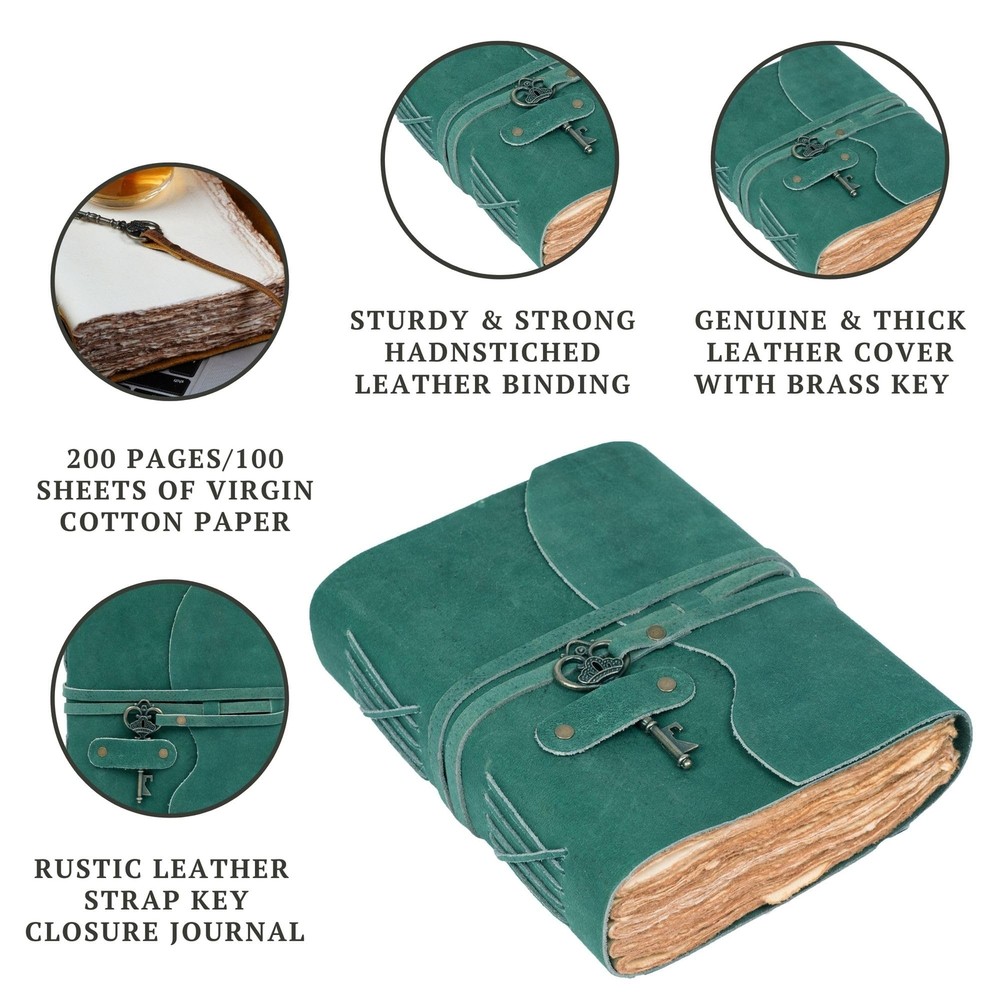 Vintage Leather Journal – 200 Handmade Vintage Deckle Edge Paper – Leather bound Journal For Women Men – Vintage Key Closure - Book of Shadows - Turquoise - 8X6 inches (A5) LEATHER JOURNAL: This Vintage Journal is crafted from Cruelty-Free Water Buffalo Genuine Leather, naturally tanned with oils, salt, and scents. VINTAGE DECKLE PAPER: Elevate your writing experience with this Leather-Bound Journal, showcasing 200 Pages (Both Sides) 125 GSM thick Virgin Cotton Handmade Deckle Edge watercolor Paper. This paper is an impeccable canvas for both dry and wet mediums. JOURNAL FOR MEN & WOMEN : This versatile leather notebook is offered in a variety of colors and sizes, catering to both men and women. With four size options - 6X4”, 8X6”, 10X7”, and 13X8” - you can find the perfect fit for your requirements. Take your pick from a wide selection of nine colors. PROMISE: Our Vintage Leather Journal reflects a dedication to quality craftsmanship. We use top-tier materials and meticulous attention to detail. Your satisfaction is our priority. One-of-a-Kind: Crafting these journals with Genuine Leather and Hand-Dipped Paper ensures that each journal possesses distinct variations in appearance and shading, resulting in a truly unique piece. The texture and color of both the leather and paper may naturally differ, adding to the individuality of each journal. Description Shipping We ship within Three business days of payment, usually sooner. Some delivery times are longer than normal due to increased demand. We use a selection of shipping services such as UPS, FedEx, USPS etc. We only ship to the lower 48 states, no APO/FPO addresses or PO Boxes allowed. Local pickups and combined shipping options are not provided at this time. Return You can return a product for up to 30 days from the date you purchased it. Any product you return must be in the same condition you received it and in the original packaging. Please keep the receipt. Payment We accept payment by any of the following methods: PayPal Please pay as soon as possible after winning an auction, as that will allow us to post your item to you sooner! Feedback Customer satisfaction is very important to us. If you have any problem with your order, please contact us and we will do our best to make you satisfied. Contact Us If you have any queries, please contact us via ebay. We usually respond within 24 hours on weekdays. Thank you for shopping at our store.