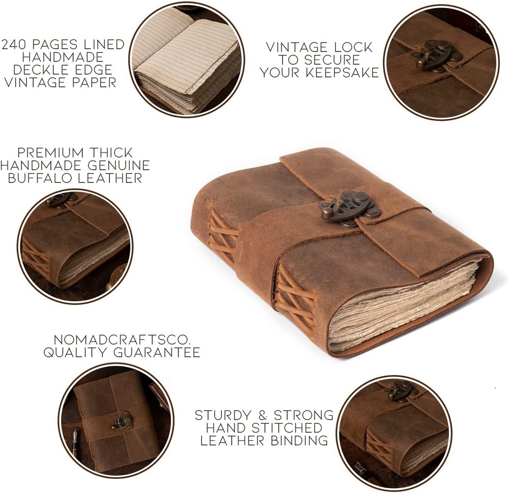 Vintage Leather Journal Lined Pages, Writing Journal, Leather Journals for Women | Daily Journal, Leather Bound Journal, Leather Sketchbook | Vintage Journal, Journal for Men, Leather Journal Product Details Size: 11.7" x 8.3"(A4) Color: Vintage Brown Brand: NomadCraftsCo. MPN: NOMAD-LINED-C-LOCK-A4 EAN: 5060892040602 UPC: Does not apply Brand: NomadCraftsCo. Color: Vintage Brown Theme: Book Cover Material: Leather Style: Unique,Vintage Ruling Type: Plain Special Feature: Soft cover Number of Items: 1 Specific Uses For Product: Writing, Sketching, Doodling, Journaling Binding: Unknown Binding Manufacturer: NomadCraftsCo. Brand: NomadCraftsCo. Item Weight: 2.88 pounds Package Dimensions: 12.2 x 10.12 x 2.13 inches Item model number: NOMAD-LINED-C-LOCK-A4 Color: Vintage Brown Cover Material: Leather Number of Items: 1 Size: 11.7" x 8.3"(A4) Ruling: Plain Manufacturer Part Number: NOMAD-LINED-C-LOCK-A4 Date First Available: May 2, 2022