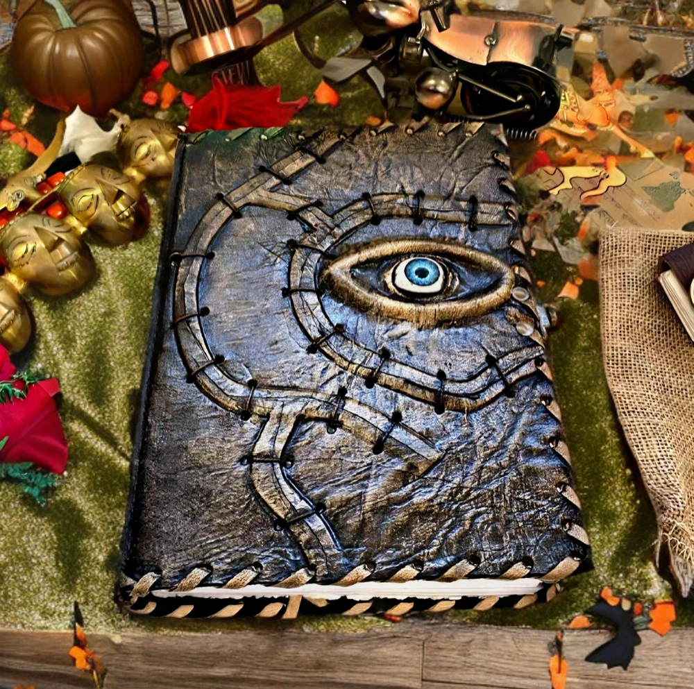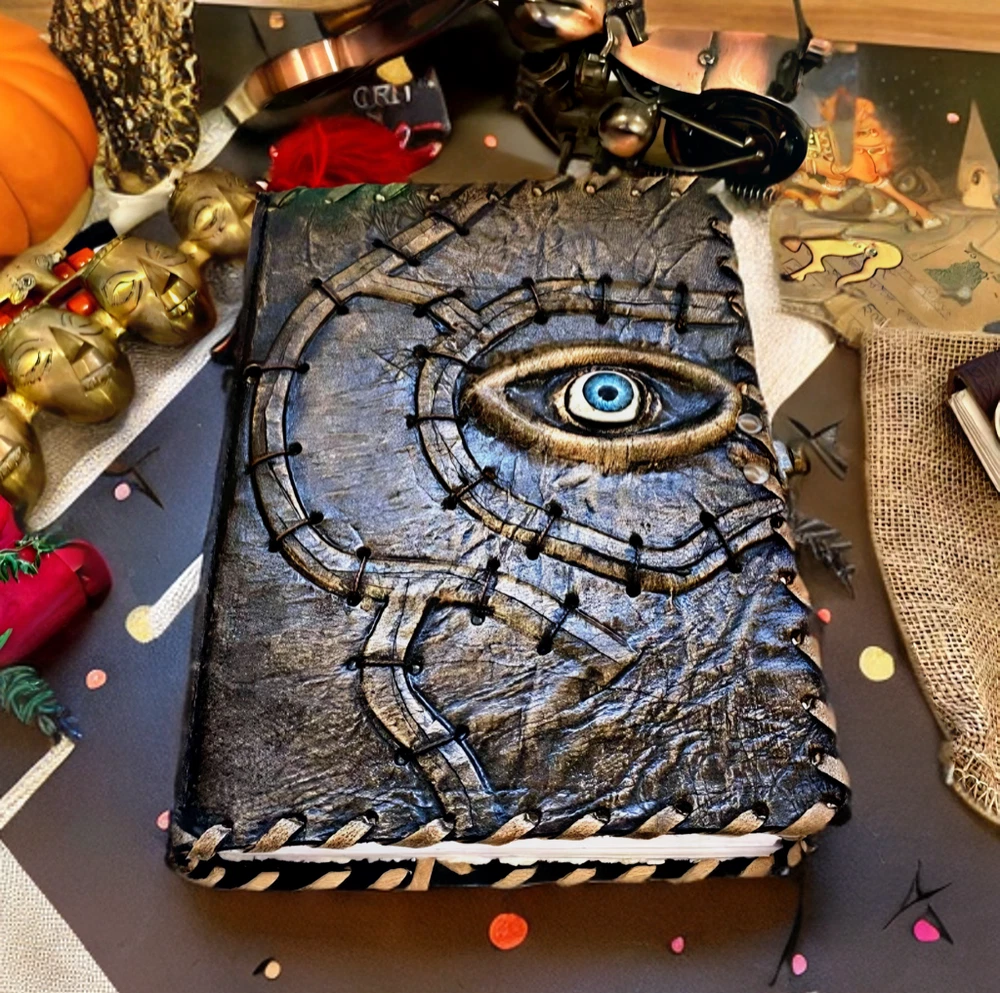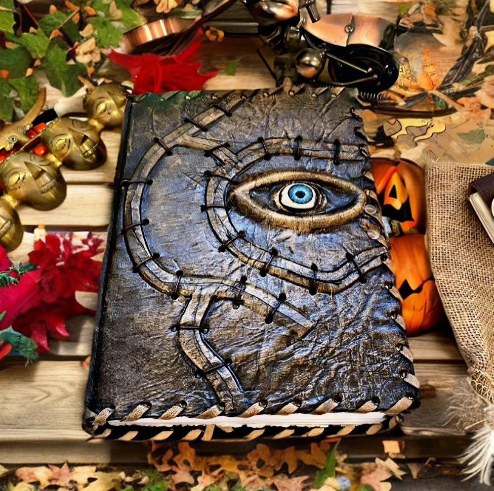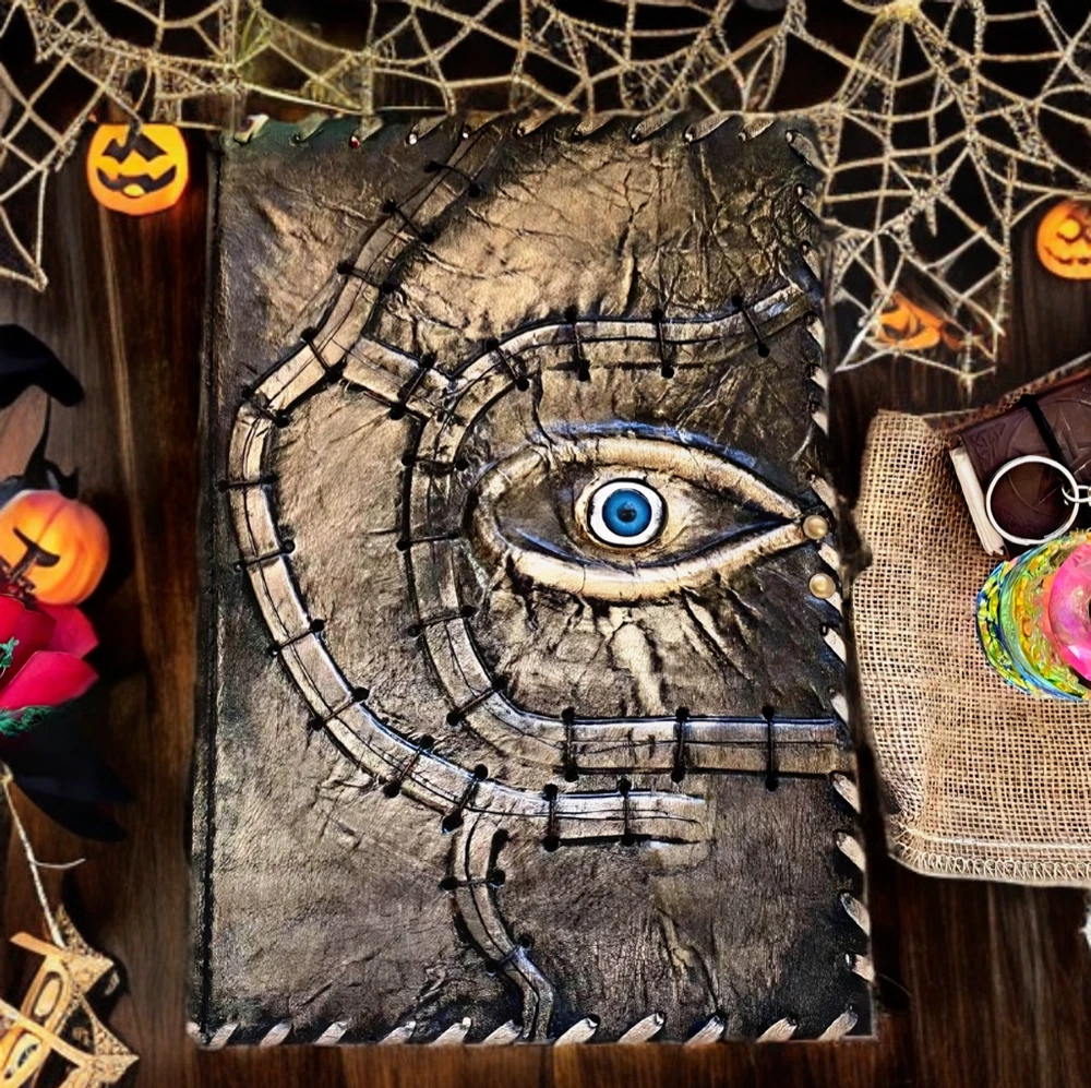 Hocus Pocus Book Antique Book of shadows Blank journal hocus pocus Eye Journal - leather notebook is made with 200 pages of Antique Deckle Edged Paper which looks like it was pulled from history. You will fall in love with the the antique handmade vintage paper which is unique to our spell book EXQUISITE & UNIQUE EYE STONE - Leather Bound Journal is antique made with a special stone called “Eye” which helps to reveal inner truth within yourself and encourage self-awareness and self expression. We have taken extra to make sure that the emboss is perfect in every piece. USE ANY KIND OF PEN - Sketch, Doodle, Write on your Leather Blank Spell Journal with a Calligraphy Pen Fountain Pen, Brush Pen, Ball Pen, Acrylic Colours, Watercolor and many more. We guarantee no bleed through. VINTAGE LOCK AND STURDY BINDING - The vintage clasp lock will keep all your valuable writing locked inside.Sturdy hand stitched binding to make sure that no paper comes out loose from your vintage notebook. Many Uses - Can be used as a notepad, journal, writing notebook, sketch book. 1.25 inch thickness, easy for handwriting, drawing or sketching and compact for carrying in your bag. Ideal for alternative Artist Sketchbooks, Photo Album, Traveling Notes, Business Executive, Logbook, Poetry Work, Journalists, Food Planner, Instagram Scrapbook and Bible Journaling. Unique Clasp Lock Easy To Open - Stylishly Medieval - Ancient looking rustic cotton unlined paper combined with the beauty of distressed leather, hand stitched by Artisans, creates a keepsake you will cherish forever. Makes a great gift for the men, women, and wiccans in your life!