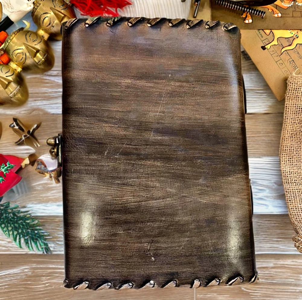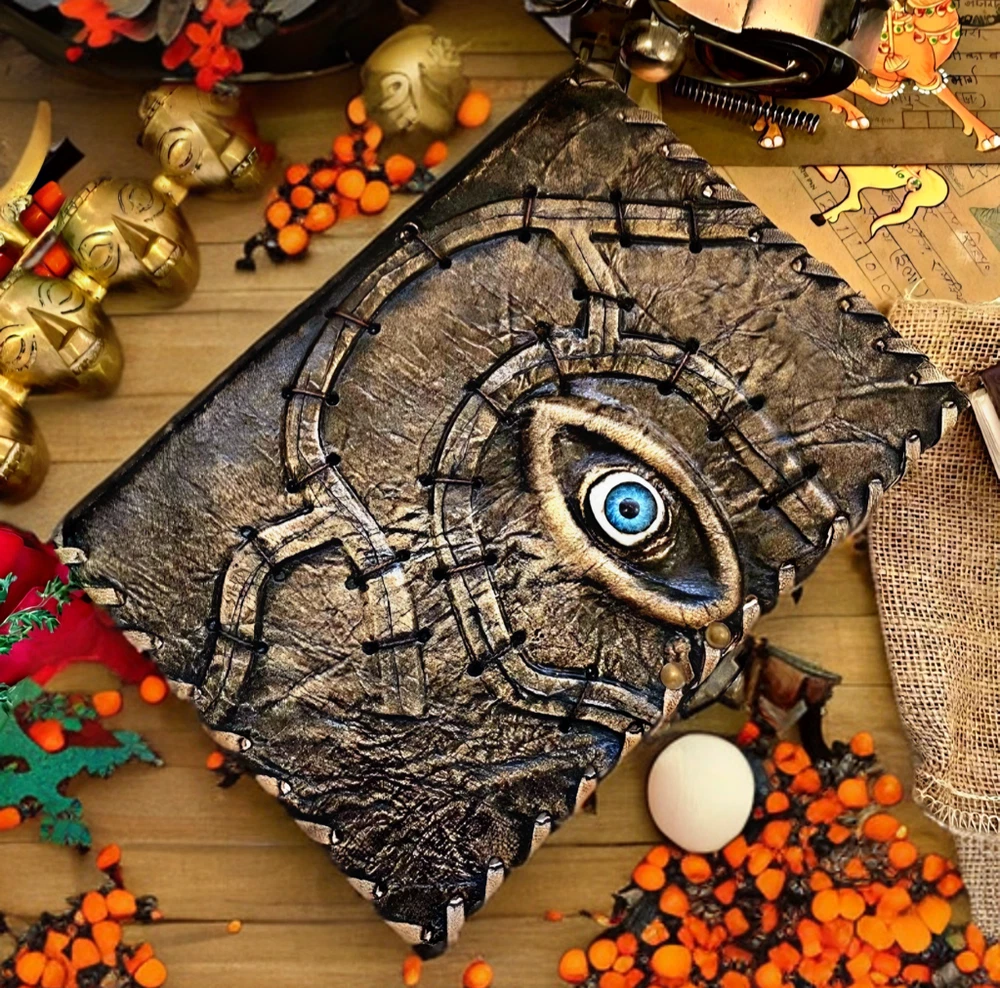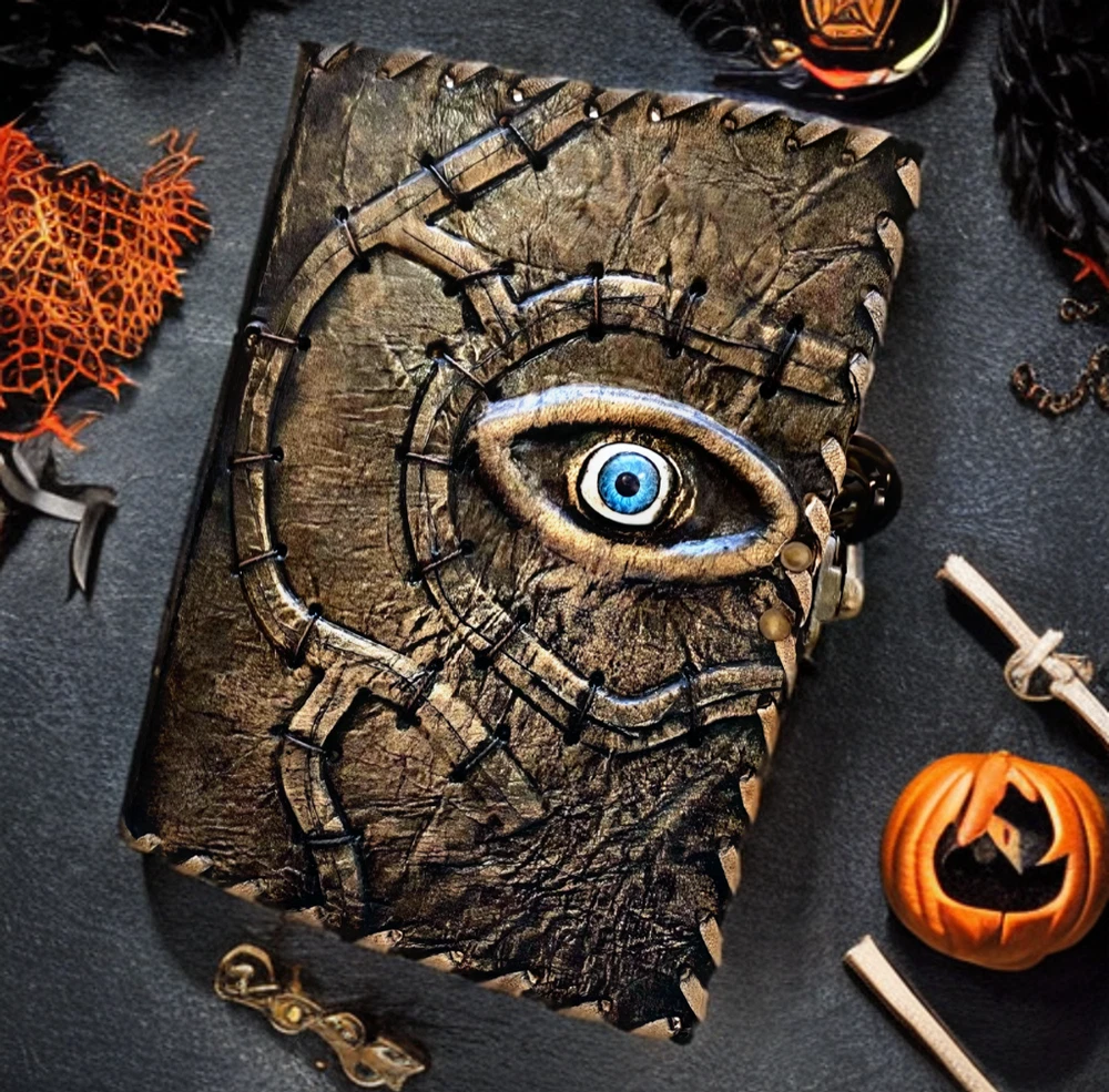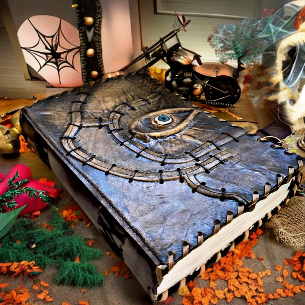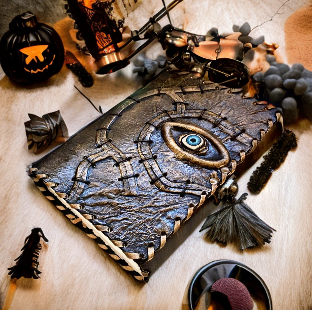 Hocus Pocus Book Antique Book of shadows Blank journal hocus pocus Eye Journal - leather notebook is made with 200 pages of Antique Deckle Edged Paper which looks like it was pulled from history. You will fall in love with the the antique handmade vintage paper which is unique to our spell book EXQUISITE & UNIQUE EYE STONE - Leather Bound Journal is antique made with a special stone called “Eye” which helps to reveal inner truth within yourself and encourage self-awareness and self expression. We have taken extra to make sure that the emboss is perfect in every piece. USE ANY KIND OF PEN - Sketch, Doodle, Write on your Leather Blank Spell Journal with a Calligraphy Pen Fountain Pen, Brush Pen, Ball Pen, Acrylic Colours, Watercolor and many more. We guarantee no bleed through. VINTAGE LOCK AND STURDY BINDING - The vintage clasp lock will keep all your valuable writing locked inside.Sturdy hand stitched binding to make sure that no paper comes out loose from your vintage notebook. Many Uses - Can be used as a notepad, journal, writing notebook, sketch book. 1.25 inch thickness, easy for handwriting, drawing or sketching and compact for carrying in your bag. Ideal for alternative Artist Sketchbooks, Photo Album, Traveling Notes, Business Executive, Logbook, Poetry Work, Journalists, Food Planner, Instagram Scrapbook and Bible Journaling. Unique Clasp Lock Easy To Open - Stylishly Medieval - Ancient looking rustic cotton unlined paper combined with the beauty of distressed leather, hand stitched by Artisans, creates a keepsake you will cherish forever. Makes a great gift for the men, women, and wiccans in your life!