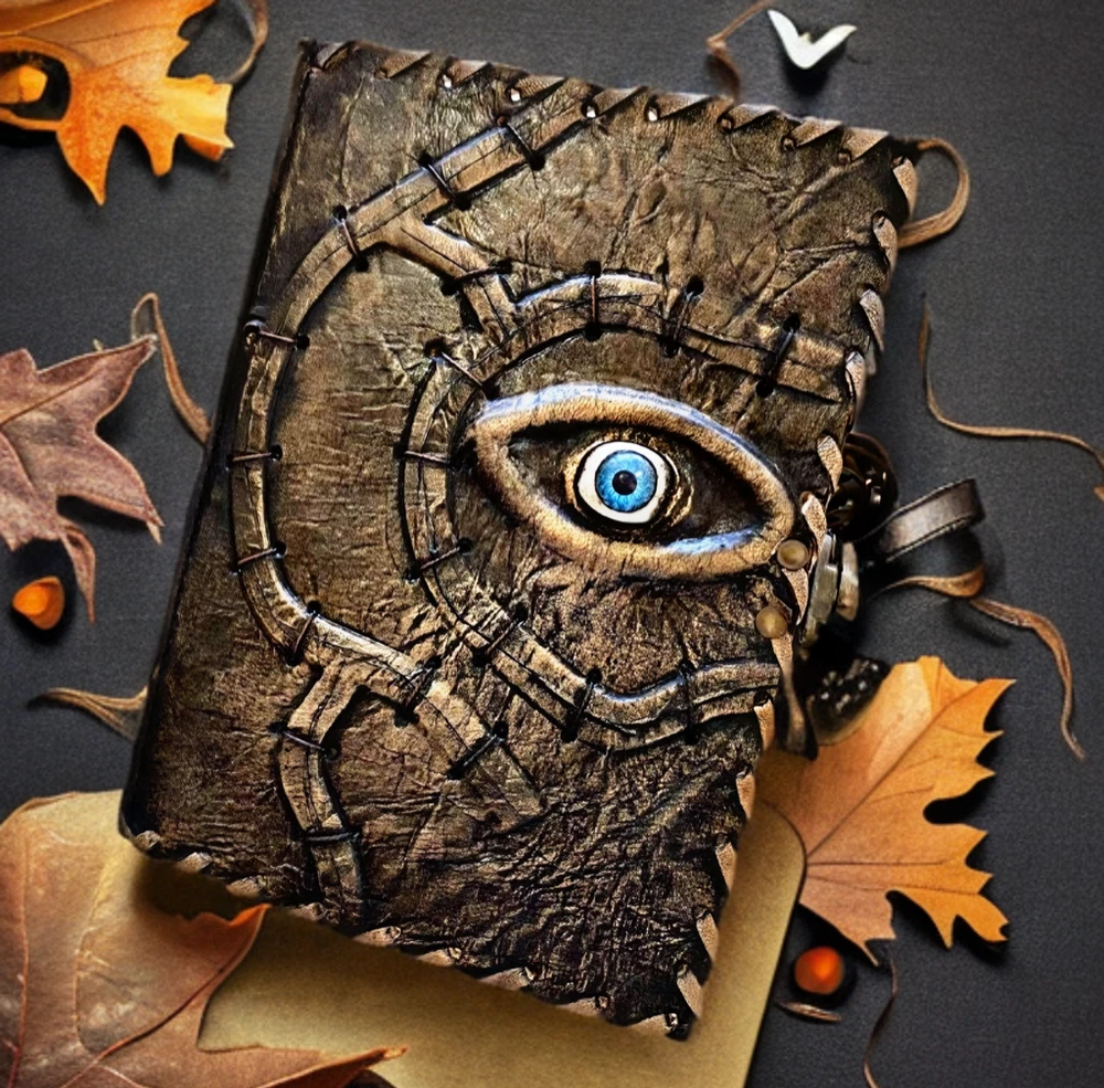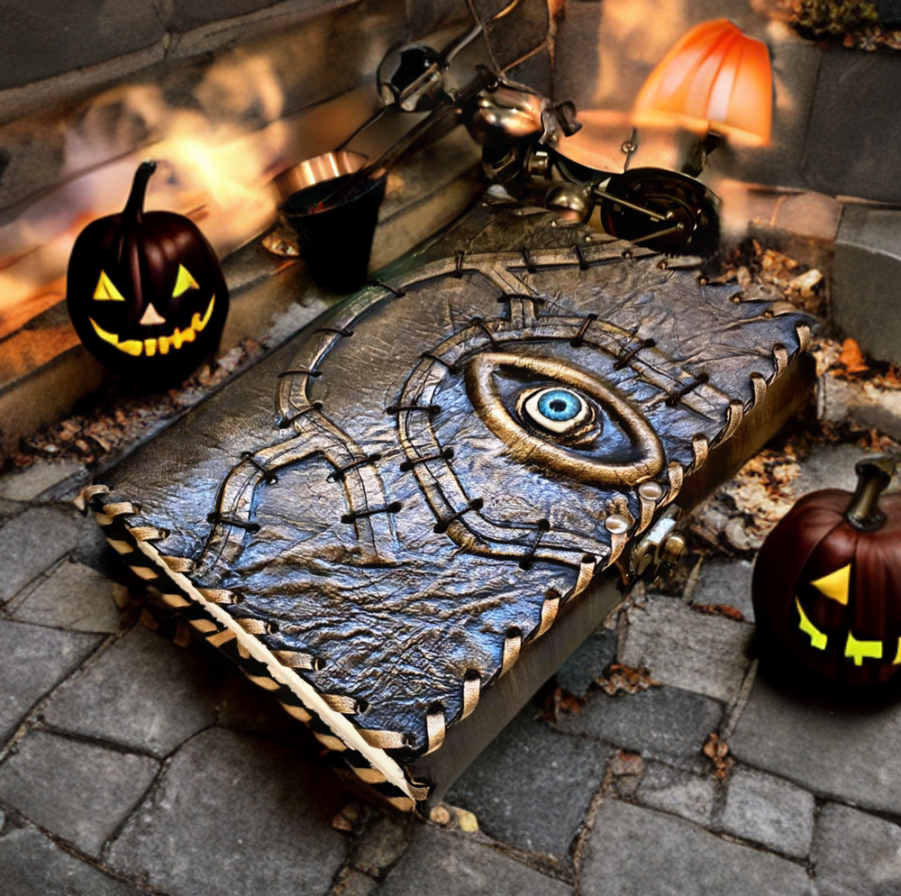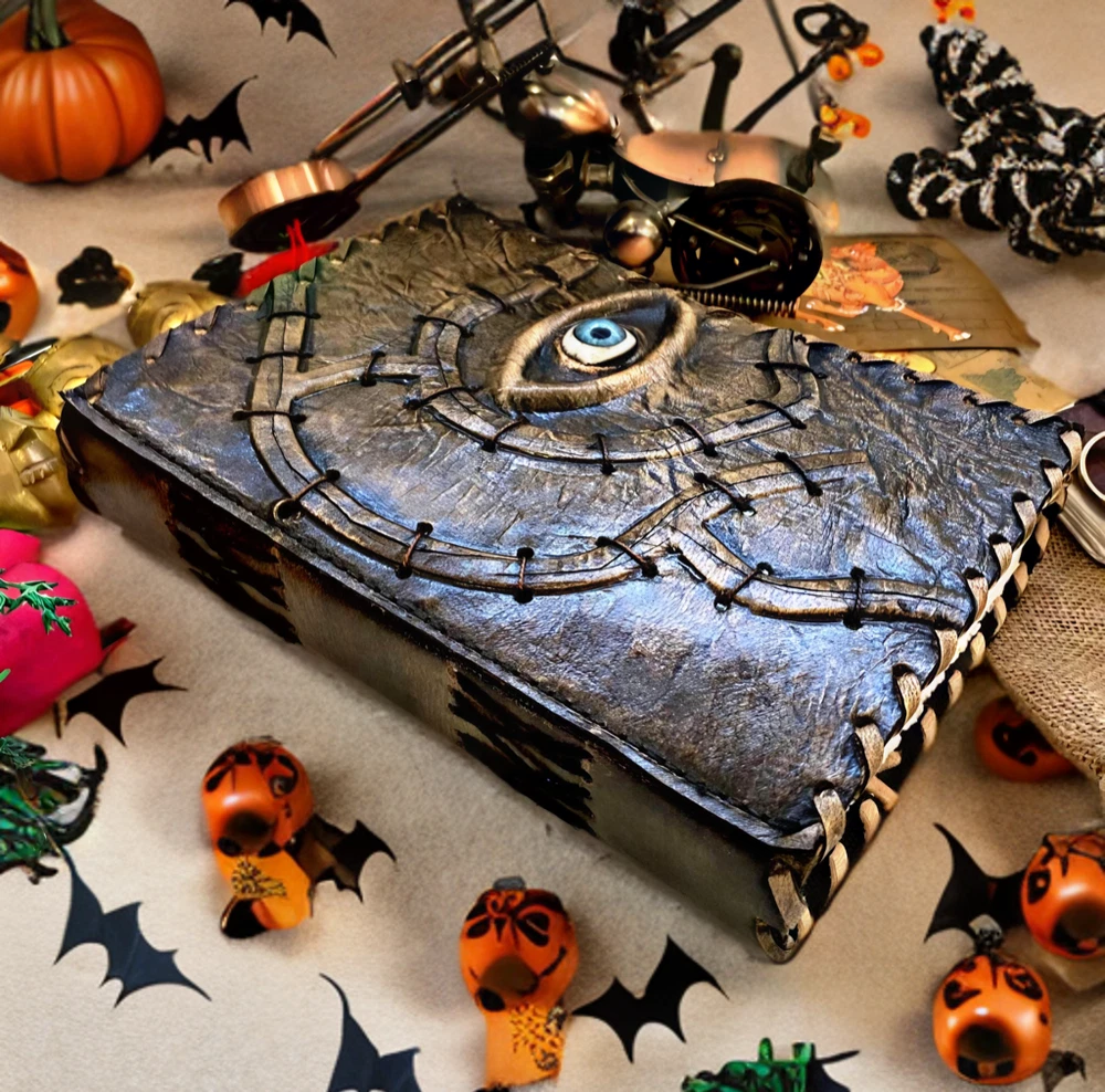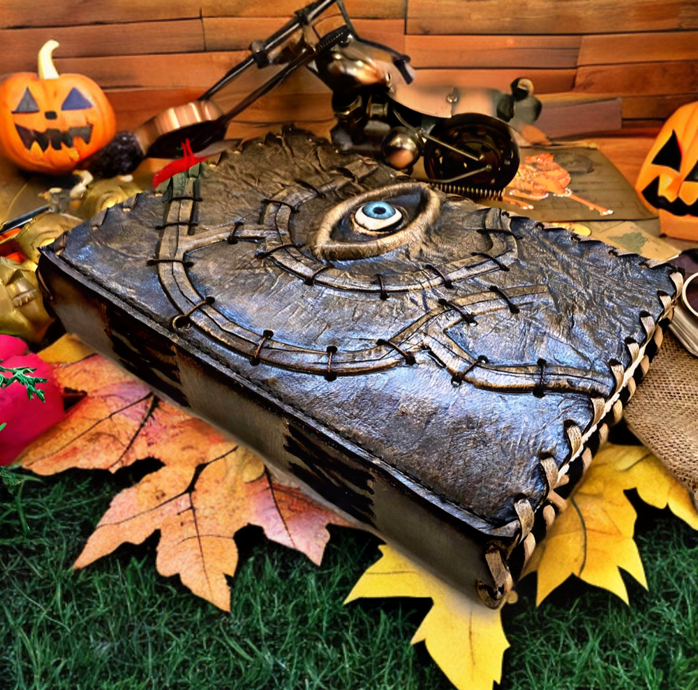 Hocus Pocus Book Antique Book of shadows Blank journal hocus pocus Eye Journal - leather notebook is made with 200 pages of Antique Deckle Edged Paper which looks like it was pulled from history. You will fall in love with the the antique handmade vintage paper which is unique to our spell book EXQUISITE & UNIQUE EYE STONE - Leather Bound Journal is antique made with a special stone called “Eye” which helps to reveal inner truth within yourself and encourage self-awareness and self expression. We have taken extra to make sure that the emboss is perfect in every piece. USE ANY KIND OF PEN - Sketch, Doodle, Write on your Leather Blank Spell Journal with a Calligraphy Pen Fountain Pen, Brush Pen, Ball Pen, Acrylic Colours, Watercolor and many more. We guarantee no bleed through. VINTAGE LOCK AND STURDY BINDING - The vintage clasp lock will keep all your valuable writing locked inside.Sturdy hand stitched binding to make sure that no paper comes out loose from your vintage notebook. Many Uses - Can be used as a notepad, journal, writing notebook, sketch book. 1.25 inch thickness, easy for handwriting, drawing or sketching and compact for carrying in your bag. Ideal for alternative Artist Sketchbooks, Photo Album, Traveling Notes, Business Executive, Logbook, Poetry Work, Journalists, Food Planner, Instagram Scrapbook and Bible Journaling. Unique Clasp Lock Easy To Open - Stylishly Medieval - Ancient looking rustic cotton unlined paper combined with the beauty of distressed leather, hand stitched by Artisans, creates a keepsake you will cherish forever. Makes a great gift for the men, women, and wiccans in your life!