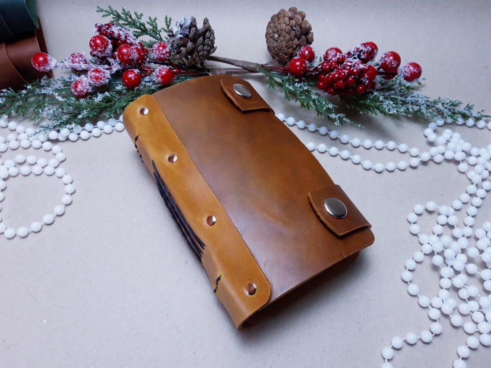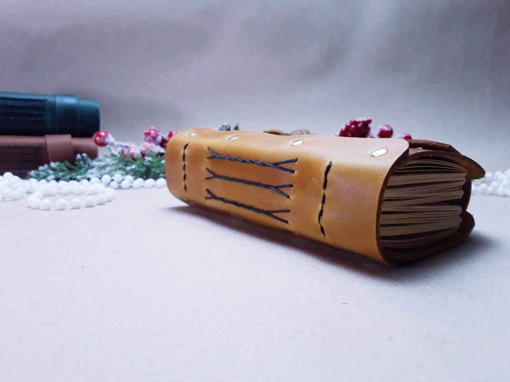 general purpose notebook with thick paper 60 pages custom size 10x16cm thickness 4 cm with original handmade bindings made of two colors of thick leather brown and yellow book as decoration for a cozy home