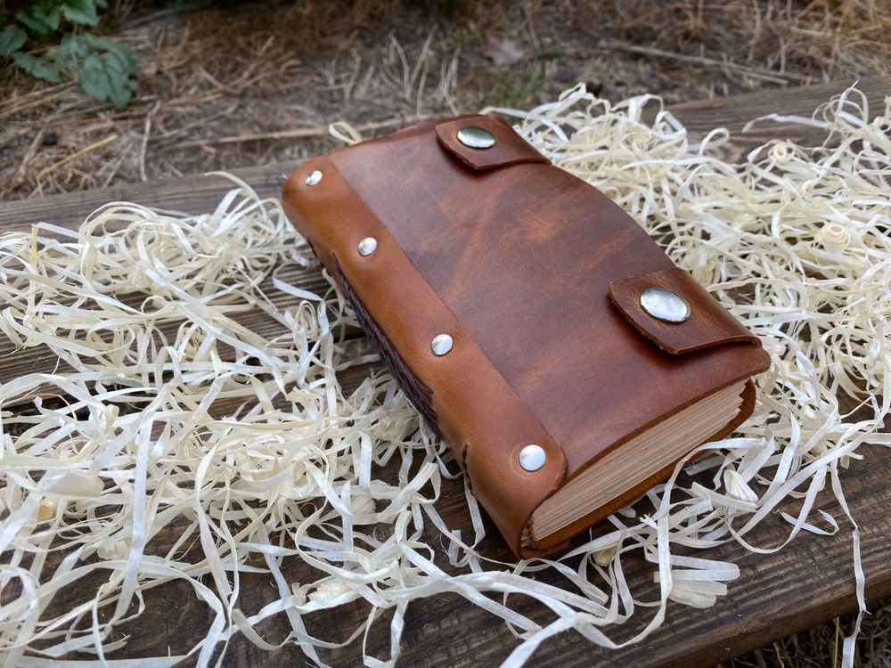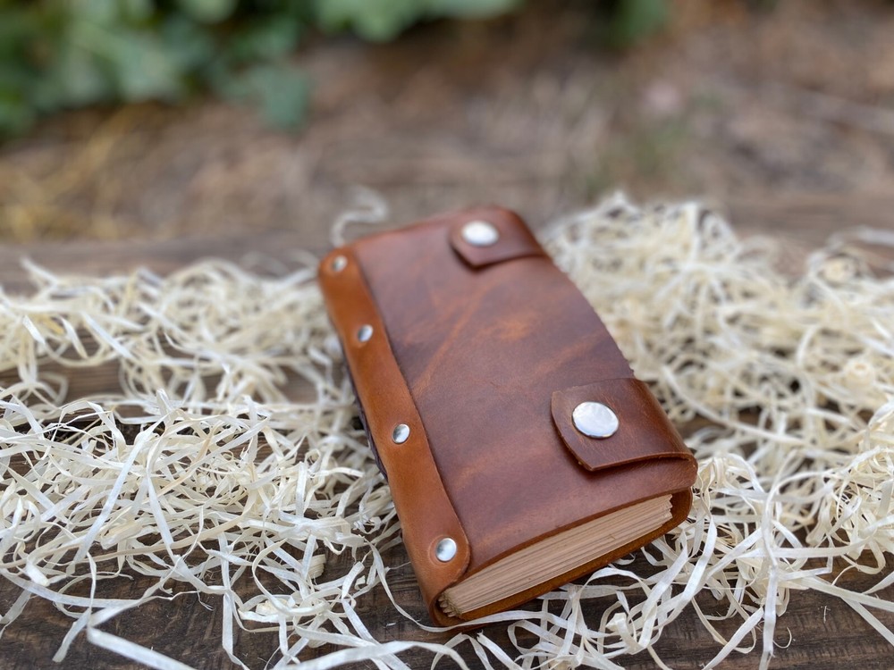 general purpose notebook with thick paper 60 pages custom size 10x16cm thickness 4 cm with original handmade bindings made of two colors of thick leather brown and yellow book as decoration for a cozy home