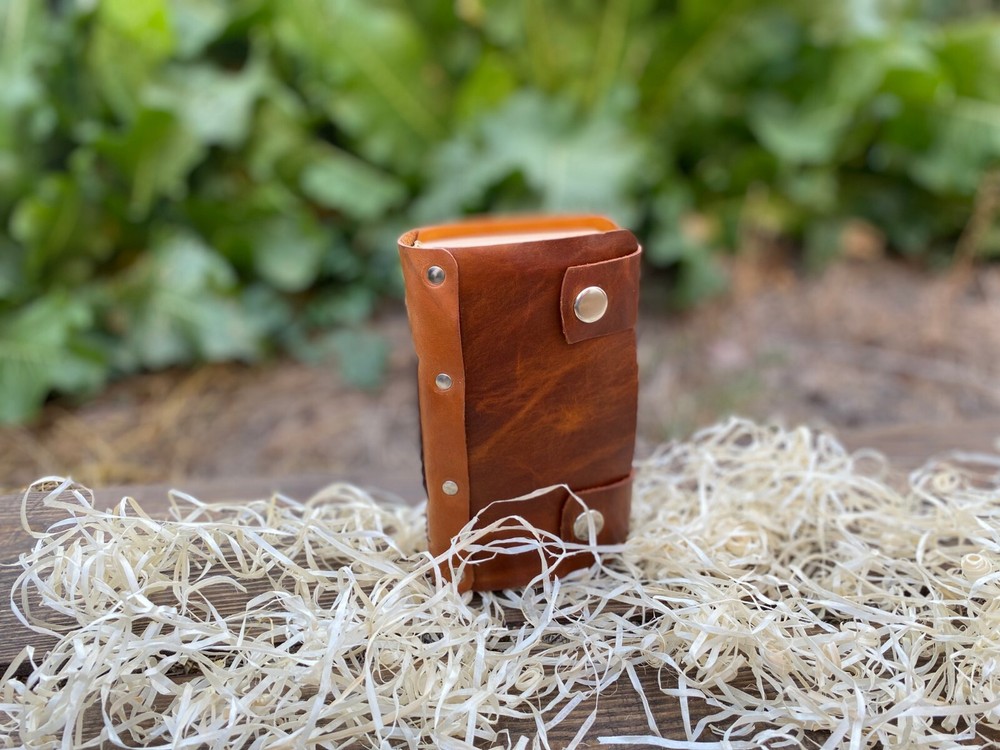general purpose notebook with thick paper 60 pages custom size 10x16cm thickness 4 cm with original handmade bindings made of two colors of thick leather brown and yellow book as decoration for a cozy...