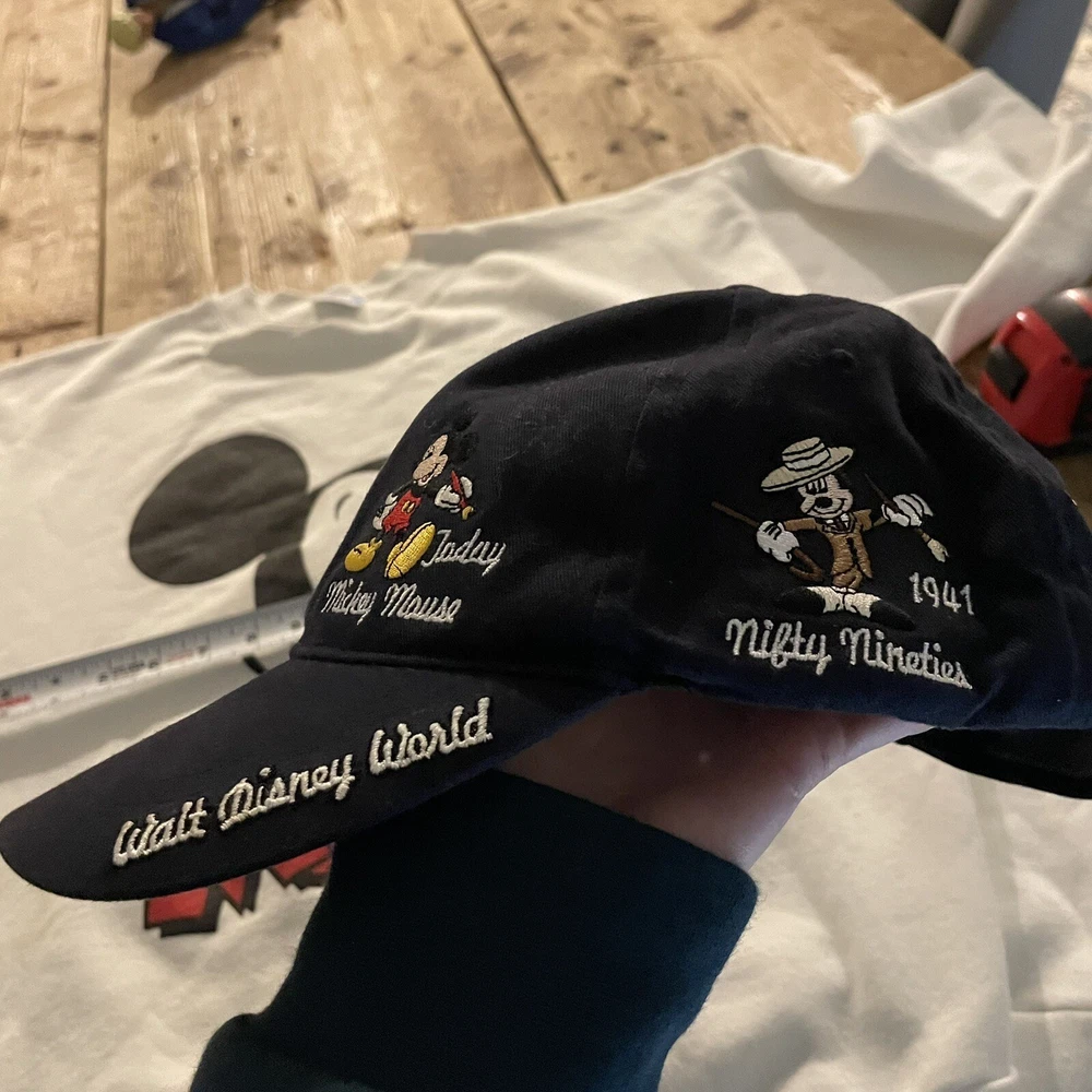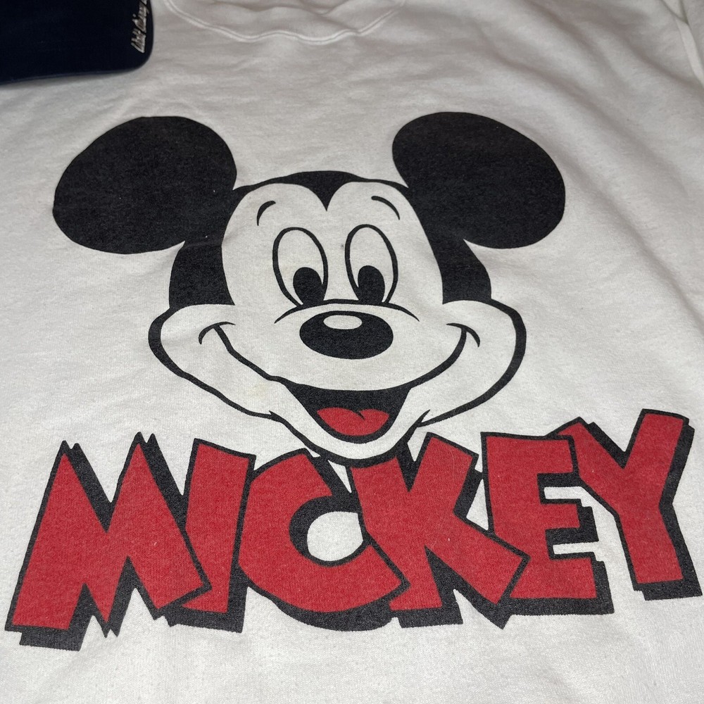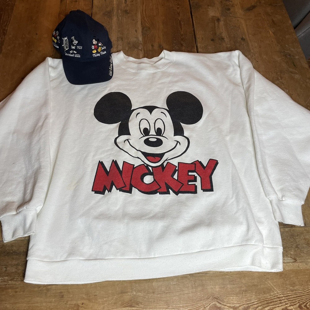 Vintage Lot Walt Disney World Hat+ Mickey Mouse Through The Years Cap XL USA Crewneck is USA made, 50-50, very soft. OSFA - measurements provided Cap is velcro back, embroidered Crew has small yellow spot Crew has piling throughout