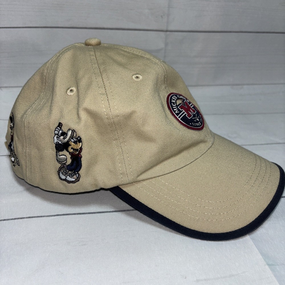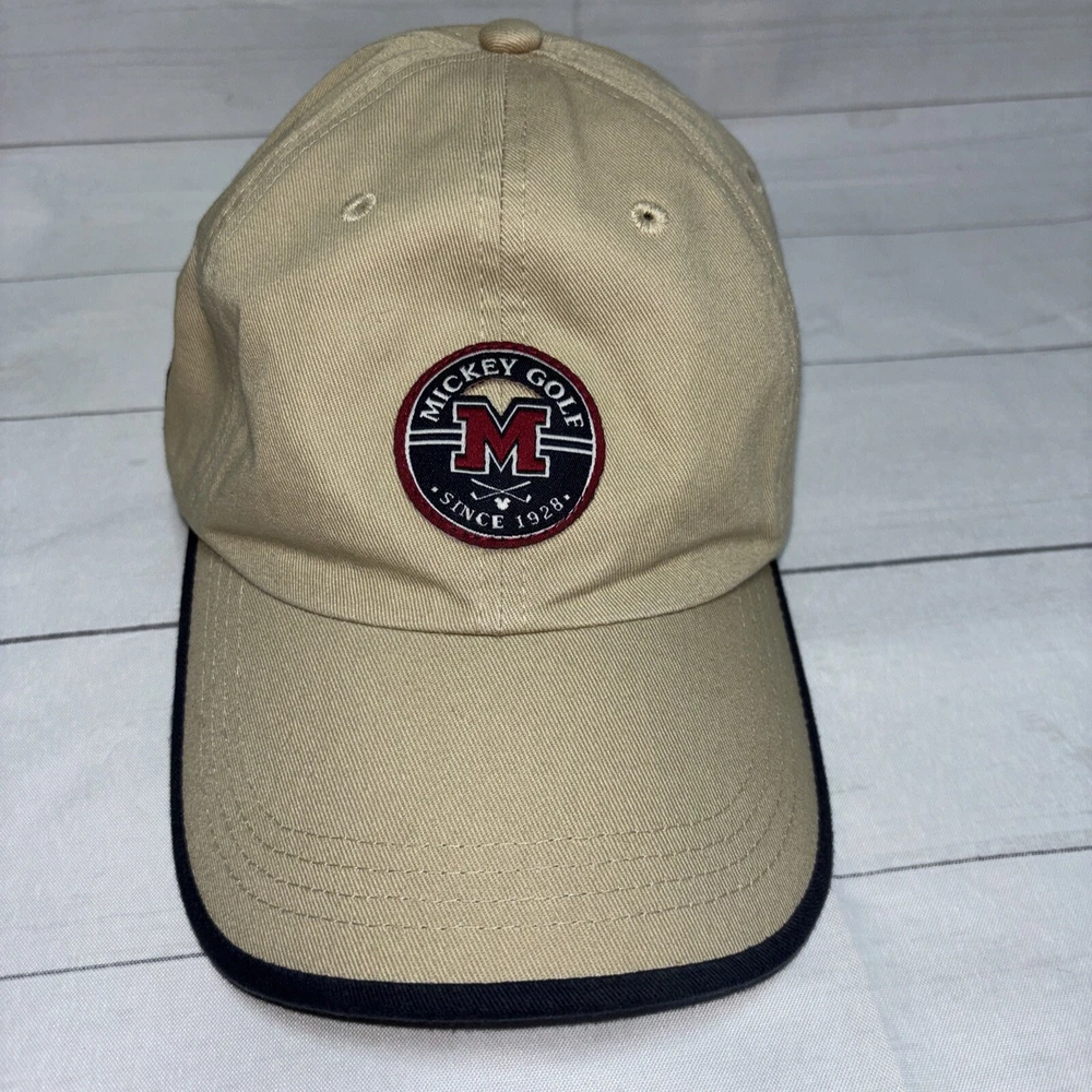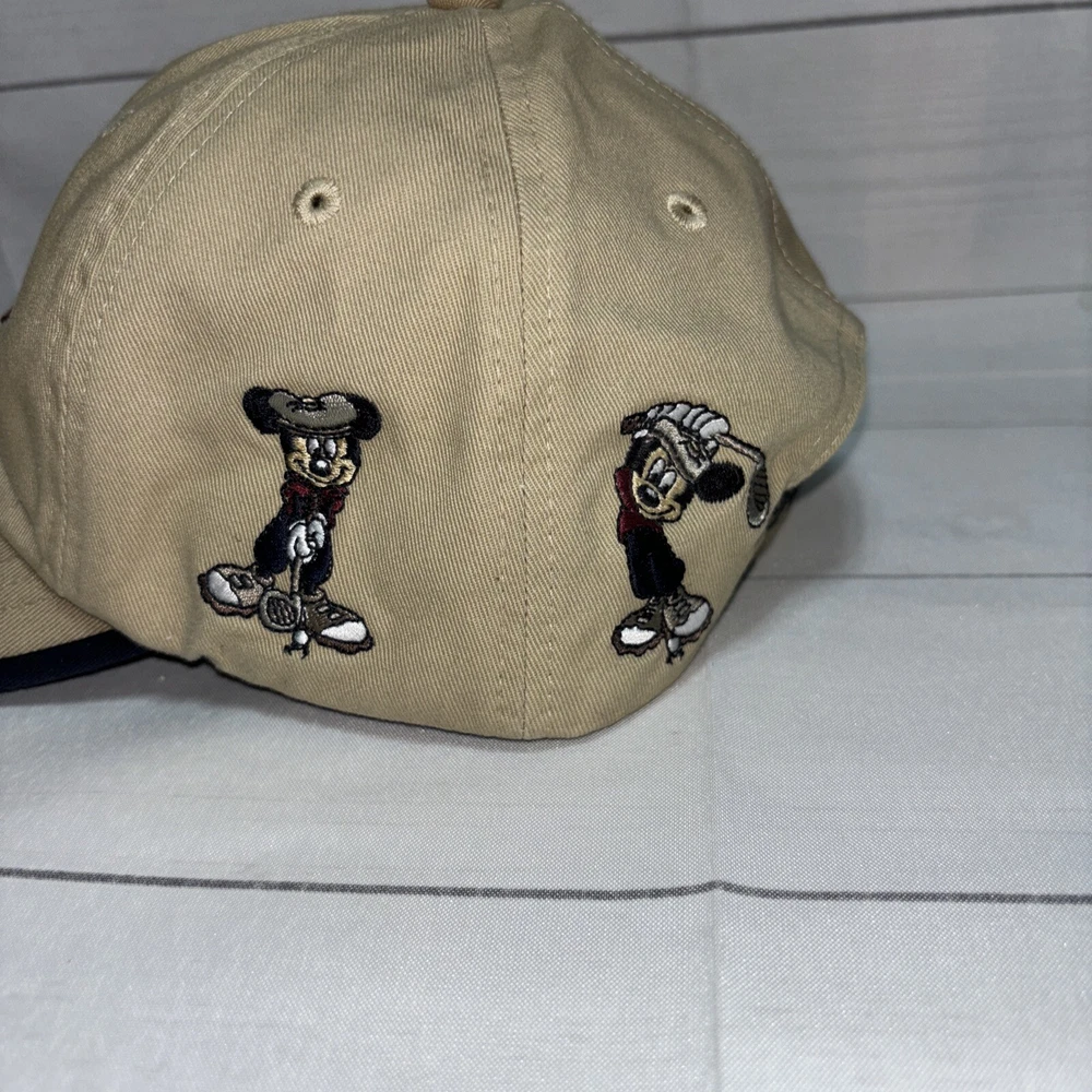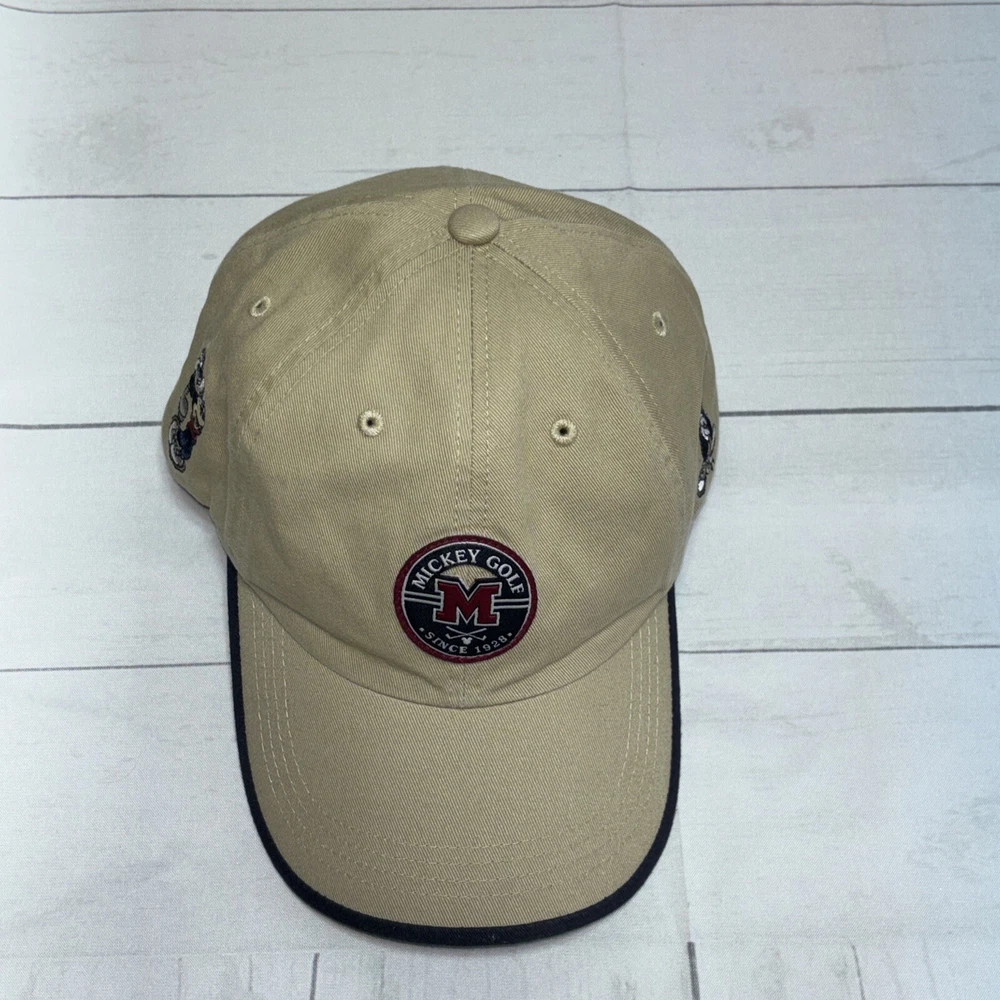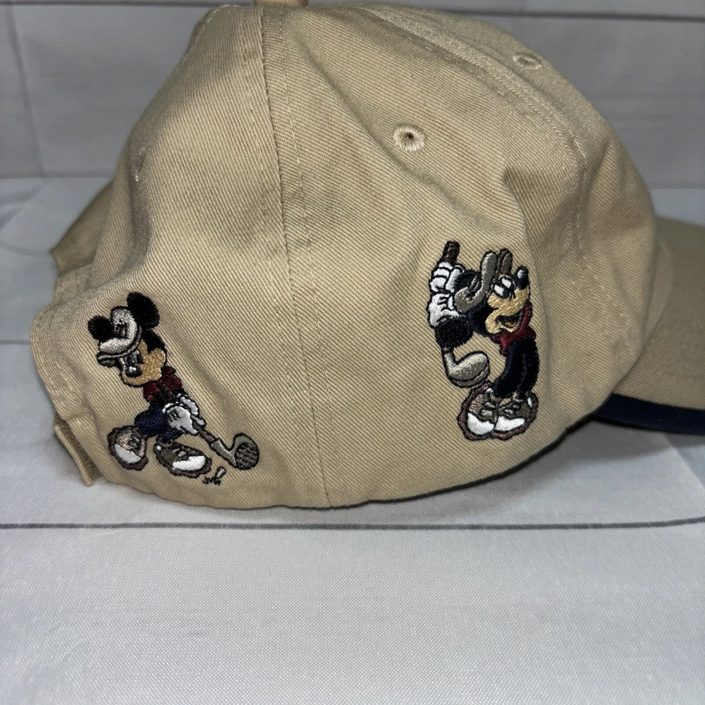 This listing is for a used Mickey Golf Baseball Cap/Hat from Walt Disney World Golf. The hat is beige and has 4 golfing Mickey Mouse’s in various poses embroidered around the hat. The adjustable hook and loop style back has Walt Disney World embroidered on it. The front of the hat has an embroidered patch that says Mickey Golf since 1928. Hat is in very good shape.