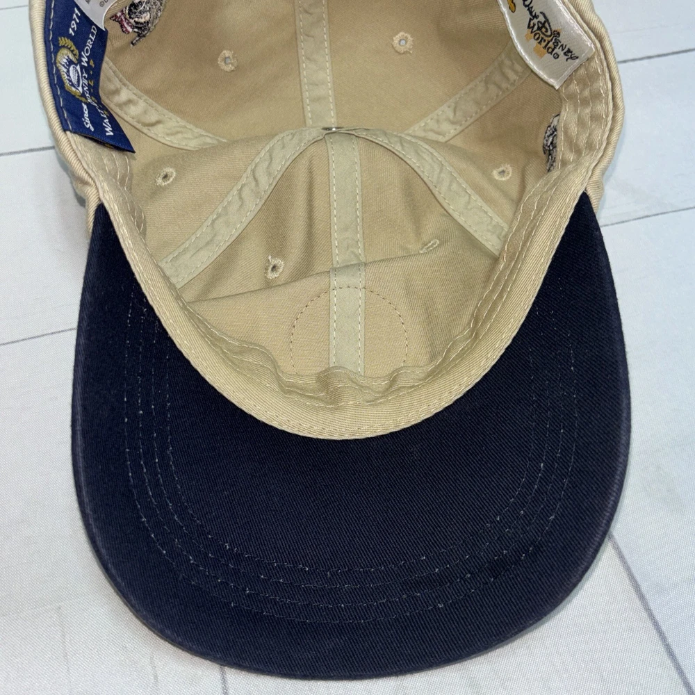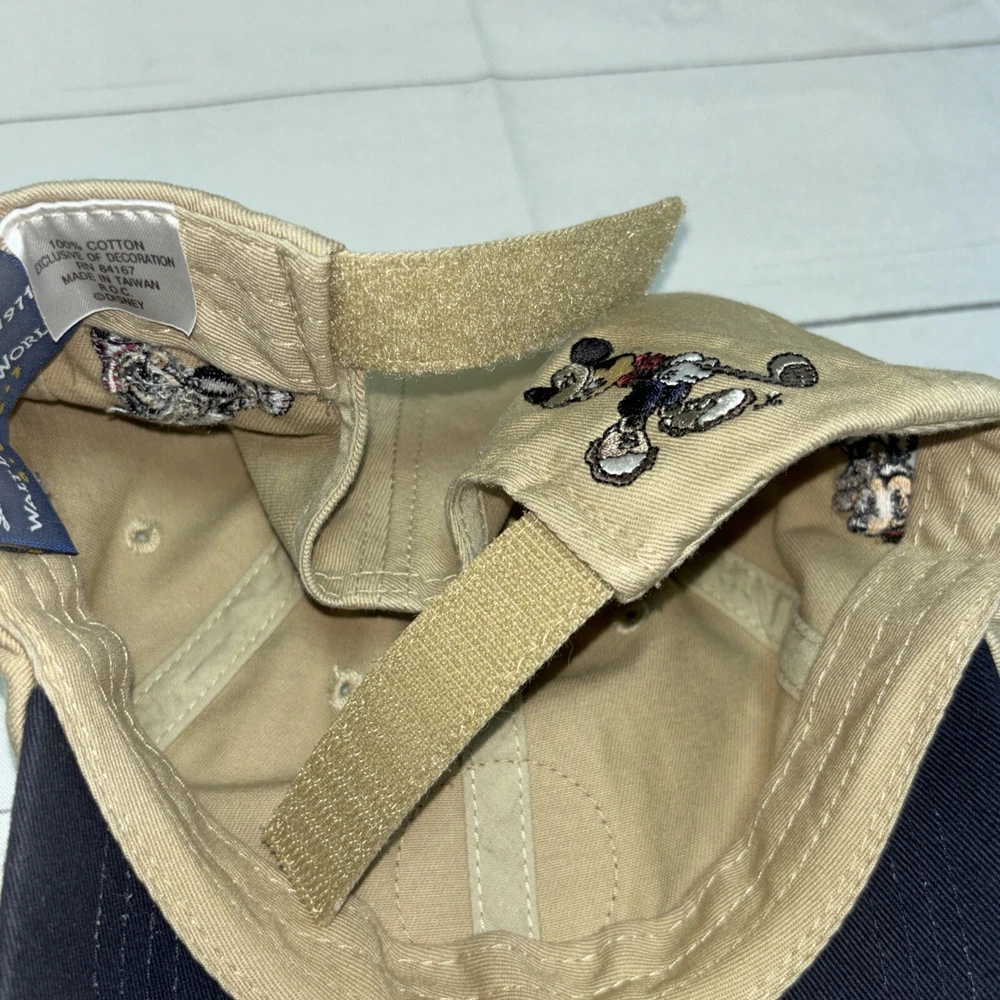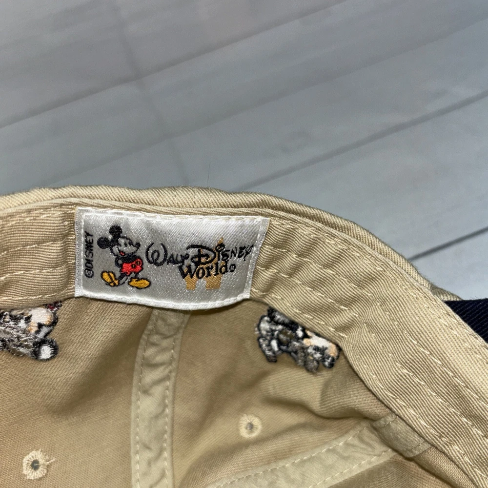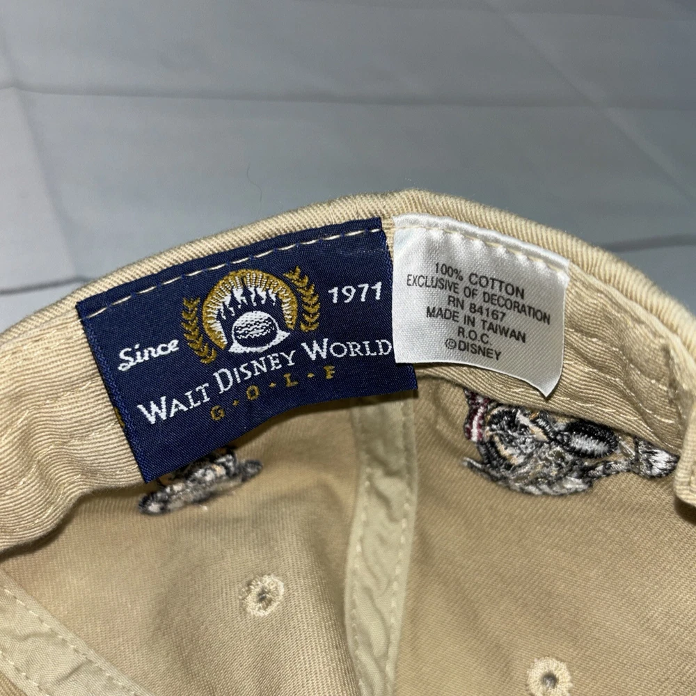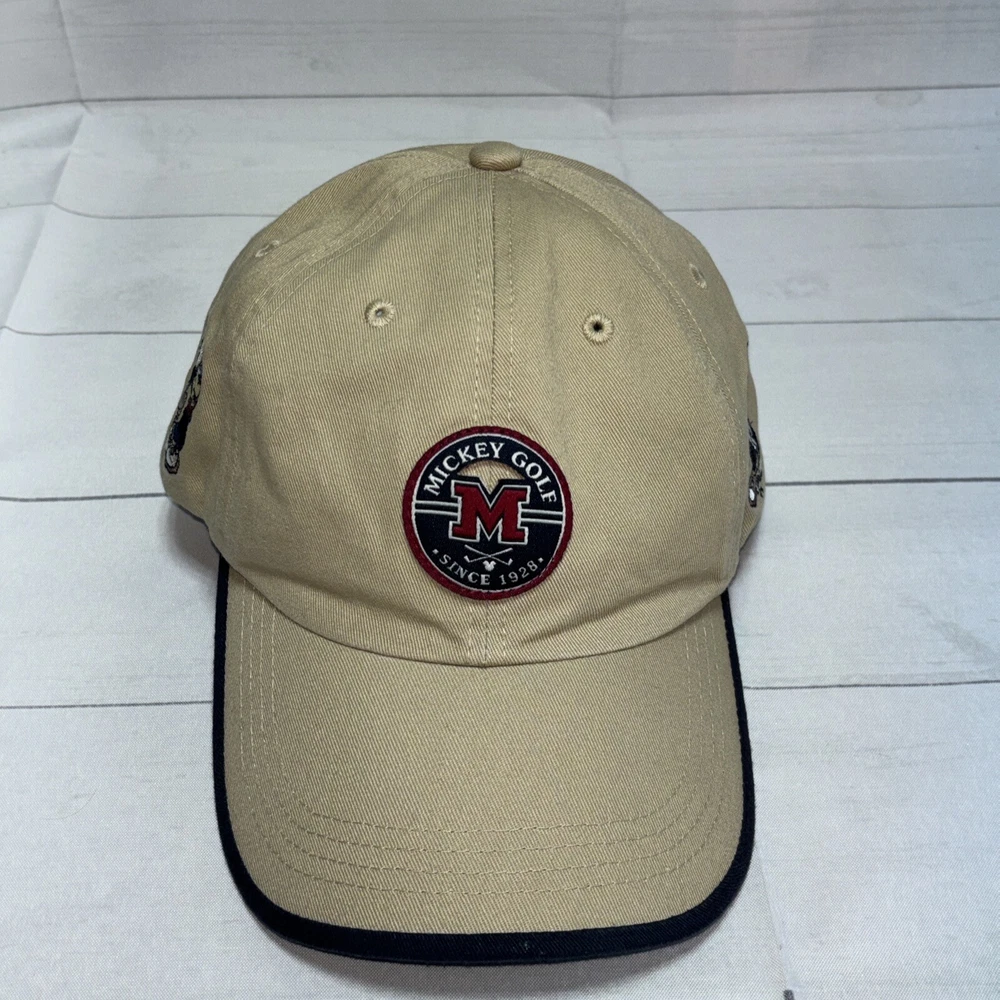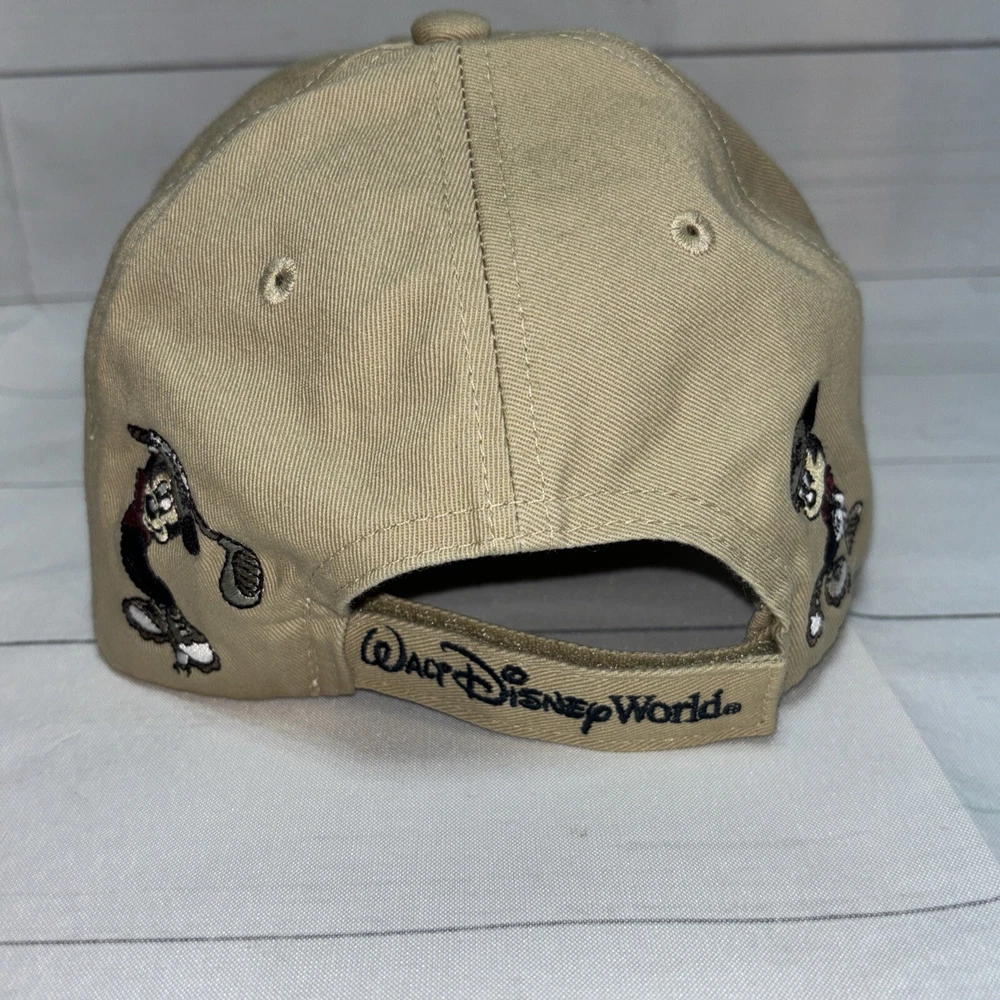 This listing is for a used Mickey Golf Baseball Cap/Hat from Walt Disney World Golf. The hat is beige and has 4 golfing Mickey Mouse’s in various poses embroidered around the hat. The adjustable hook and loop style back has Walt Disney World embroidered on it. The front of the hat has an embroidered patch that says Mickey Golf since 1928. Hat is in very good shape.