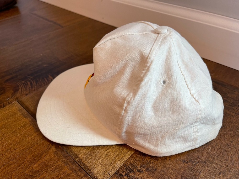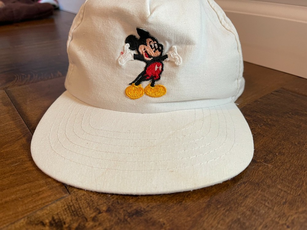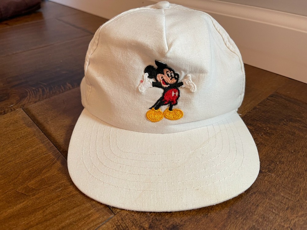 I have for sale a Vintage Mickey Mouse Walt Disney World White Adjustable Snapback Dad Hat Cap. Nice older Mickey snapback hat. Has some discoloring on the brim and a spot on the top (pictured). Nice white color with embroidered mickey front logo. Adjustable snapback unisex adult fit. Ships Fast and Free!