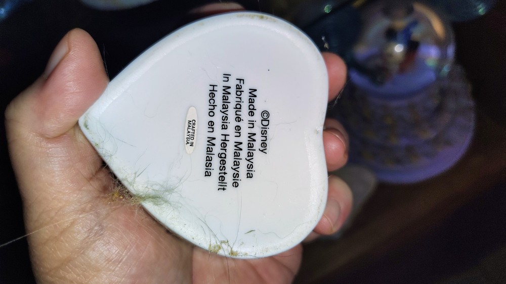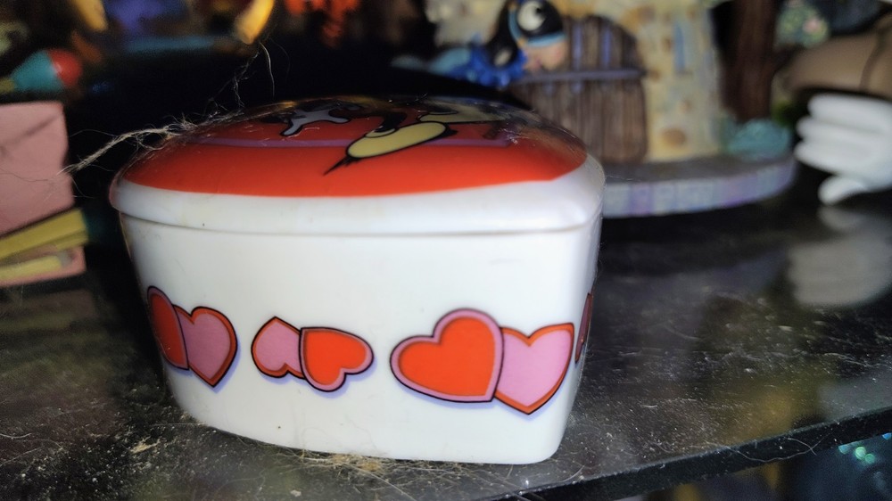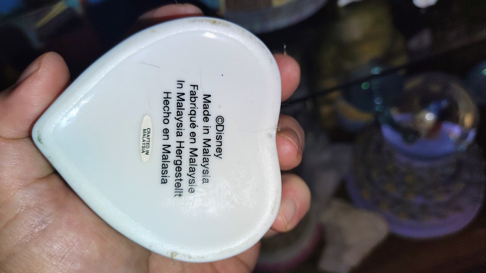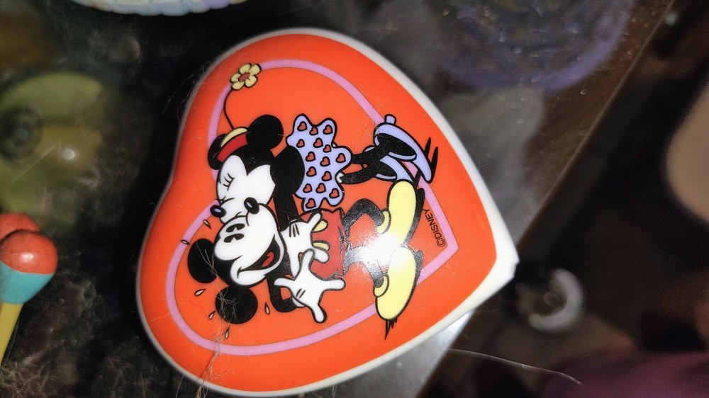 This vintage Disney keepsake heart trinket box is a must-have for any Disney fan. Featuring Mickey Mouse and Minnie Mouse, this musical box plays a beautiful tune that will transport you to a magical world. Made in Malaysia, this collectible item is perfect for those who appreciate contemporary Disneyana No damage to the box but not playing