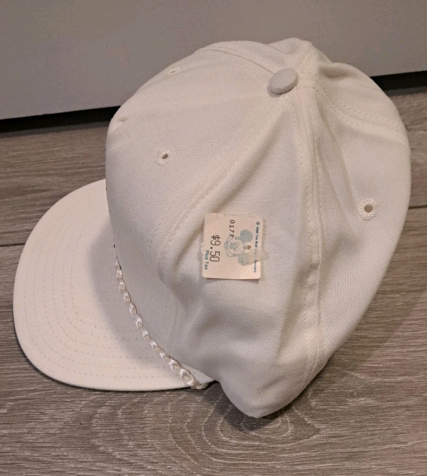 The Vintage Walt Disney World 15 Year Anniversary Snapback Hat is a nostalgic collectible item to commemorate the iconic theme park's milestone anniversary. Made by New Era, the adjustable size hat features a classic white color and bears the Disney franchise logo, making it suitable for both men and women. With a unique sales tag attached, this hat is a unique piece of Disneyana for any fan or collector looking to add a piece of history to their collection. Made in the United States, this hat is a great addition for those who appreciate the legacy of Walt Disney World. Original Sales tag still attached to hat! See Pictures!