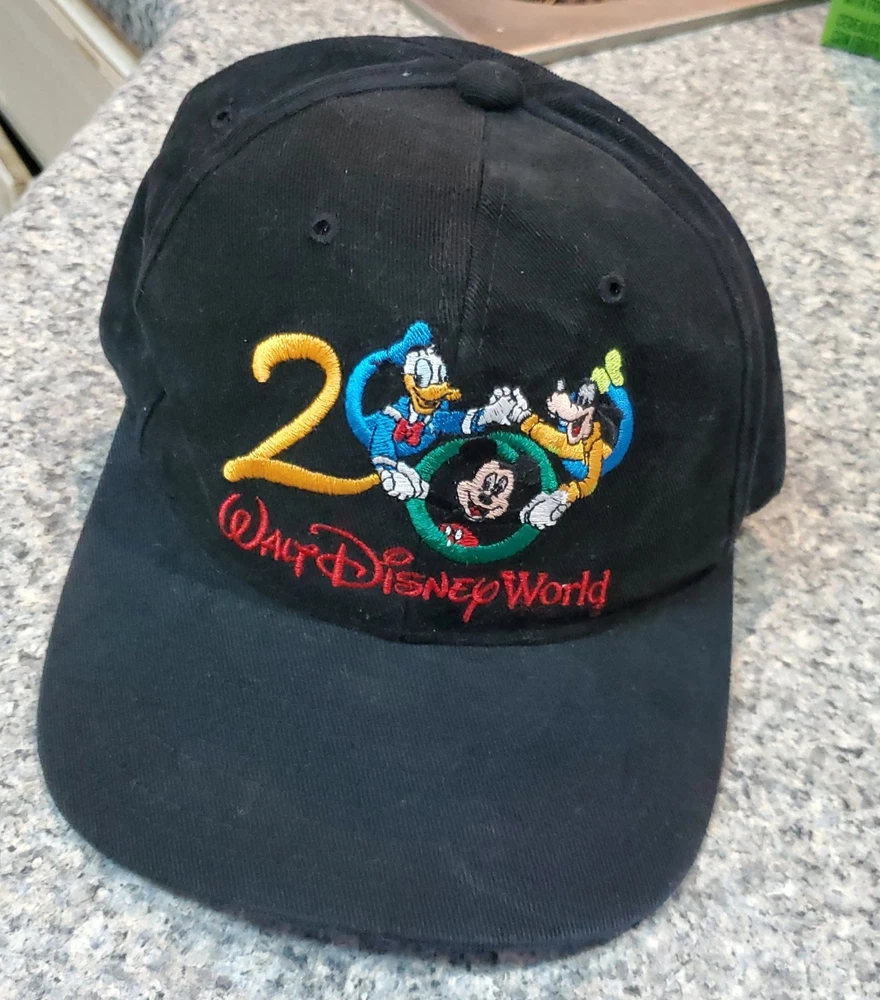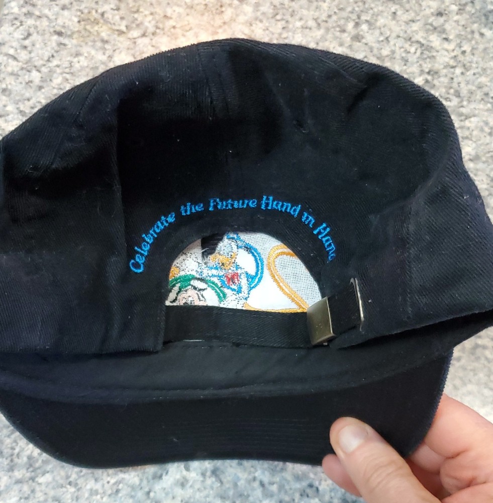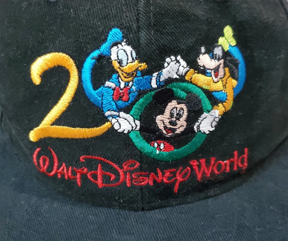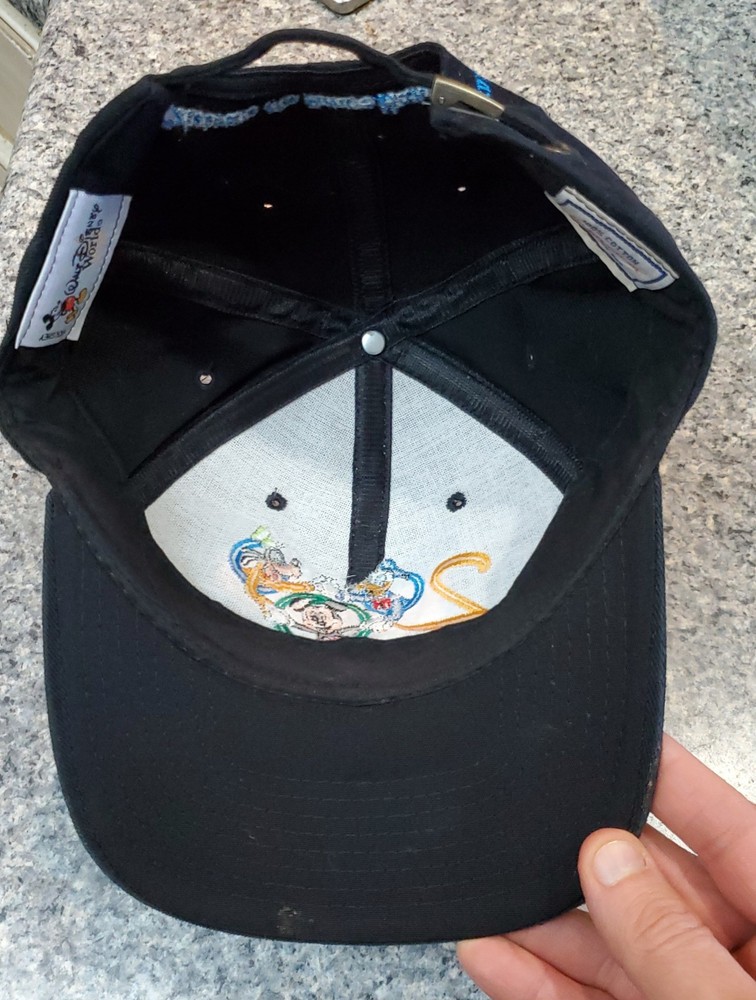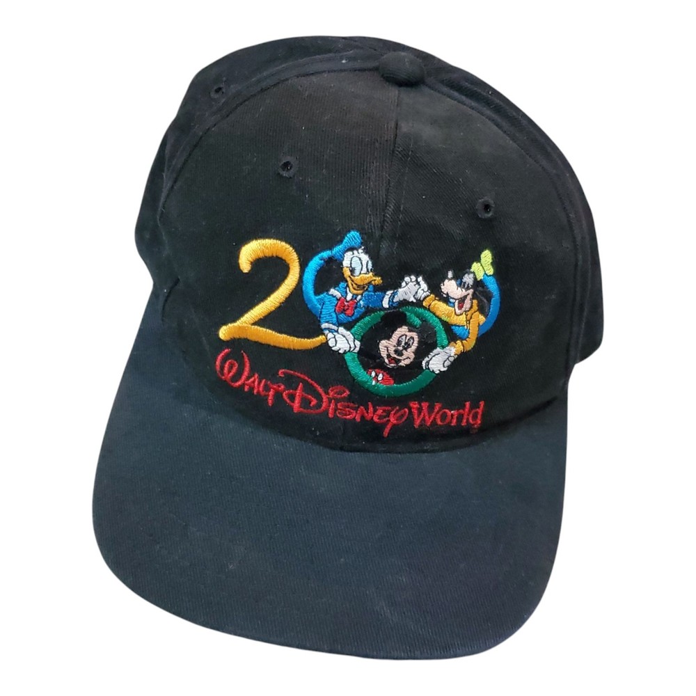 This vintage Walt Disney World 2000 black adjustable hat features a design showcasing classic Disney characters Mickey Mouse, Donald Duck, and Goofy. The hat is suitable for adults and is unisex, with a one size fits most sizing. It is part of the Disney franchise and is a unique collectible item for fans of Disneyana and contemporary Disney merchandise from 1968 to now. The hat is a timeless piece that represents the magical world of Disney and is perfect for adding a touch of nostalgia to any outfit.