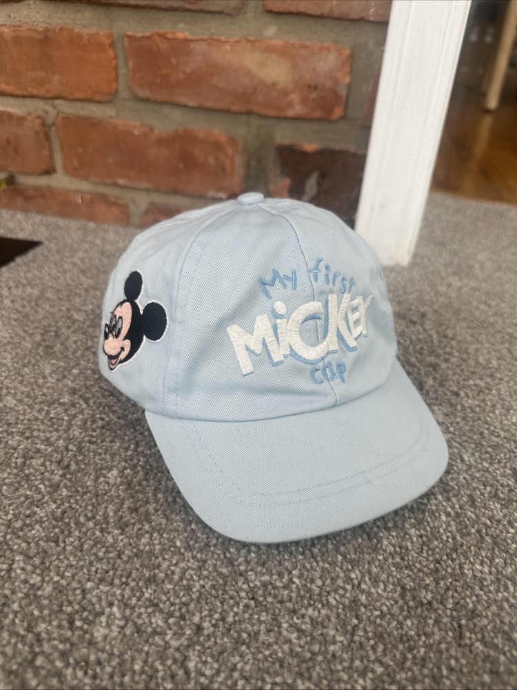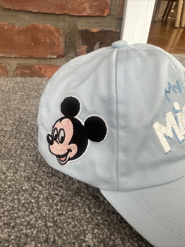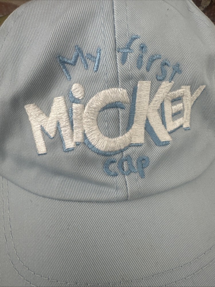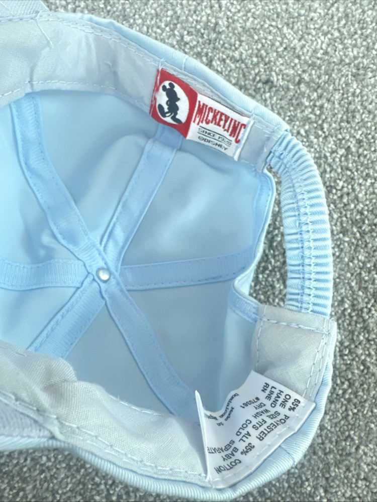 This vintage Walt Disney World baby hat is a must-have for any Disney collector. The hat features an embroidered blue Mickey Mouse design and is from the 90s. It is suitable for unisex kids and comes in one size. The hat is made in Taiwan and is in great condition.