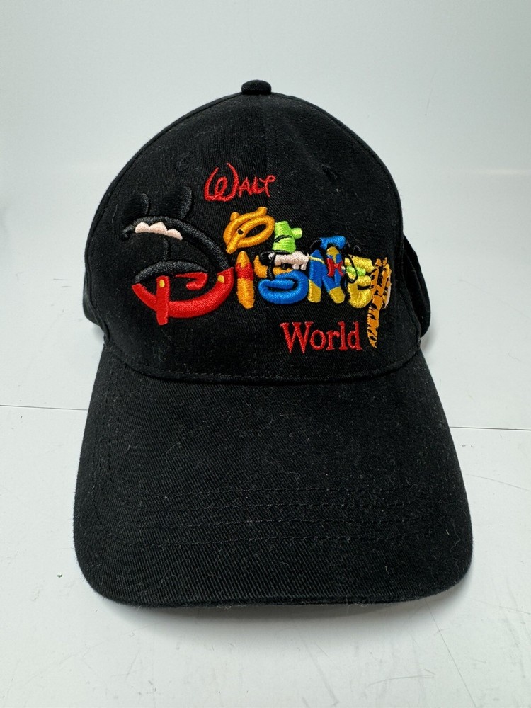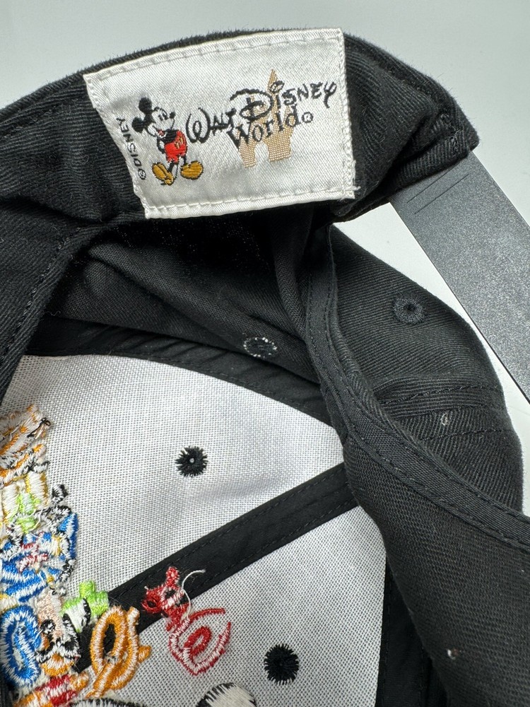 This Vintage Walt Disney World Baseball Hat features an embroidered design in black, suitable for adults with a one-size-fits-all snapback closure. The hat showcases the iconic Mickey Mouse character from the Disney franchise, making it a timeless collectible item for Disney enthusiasts. Made in Taiwan, this unisex hat is a classic piece of Disney memorabilia that would be a stylish addition to any fan's apparel collection.