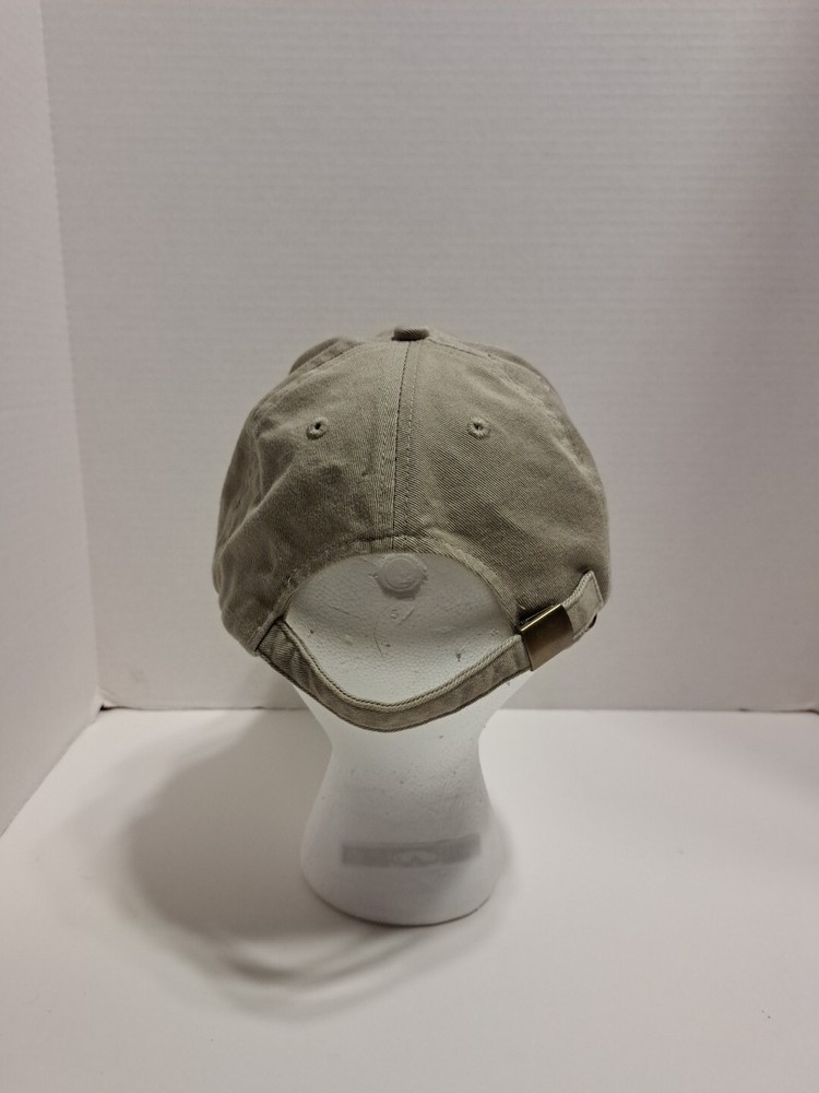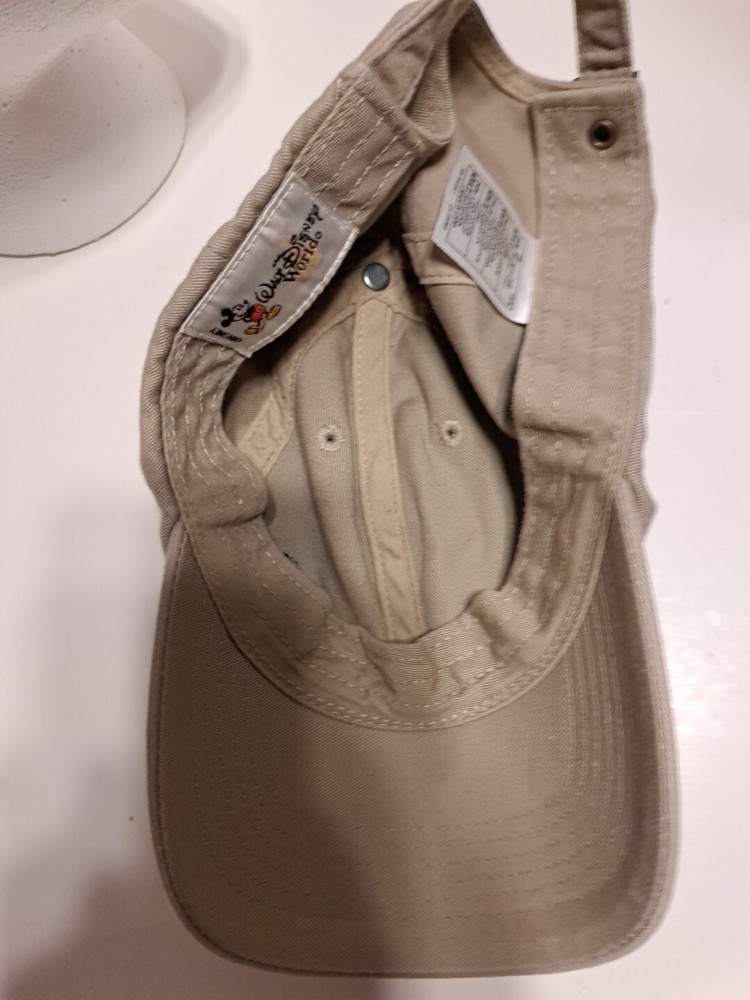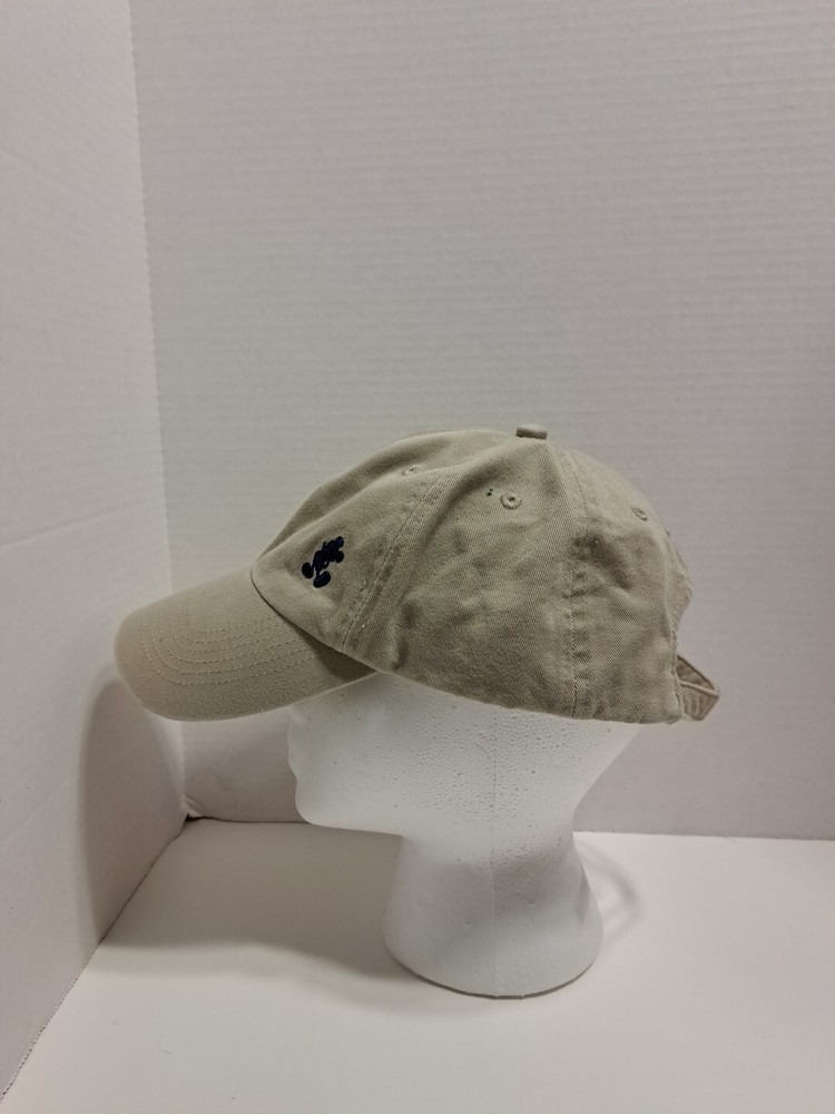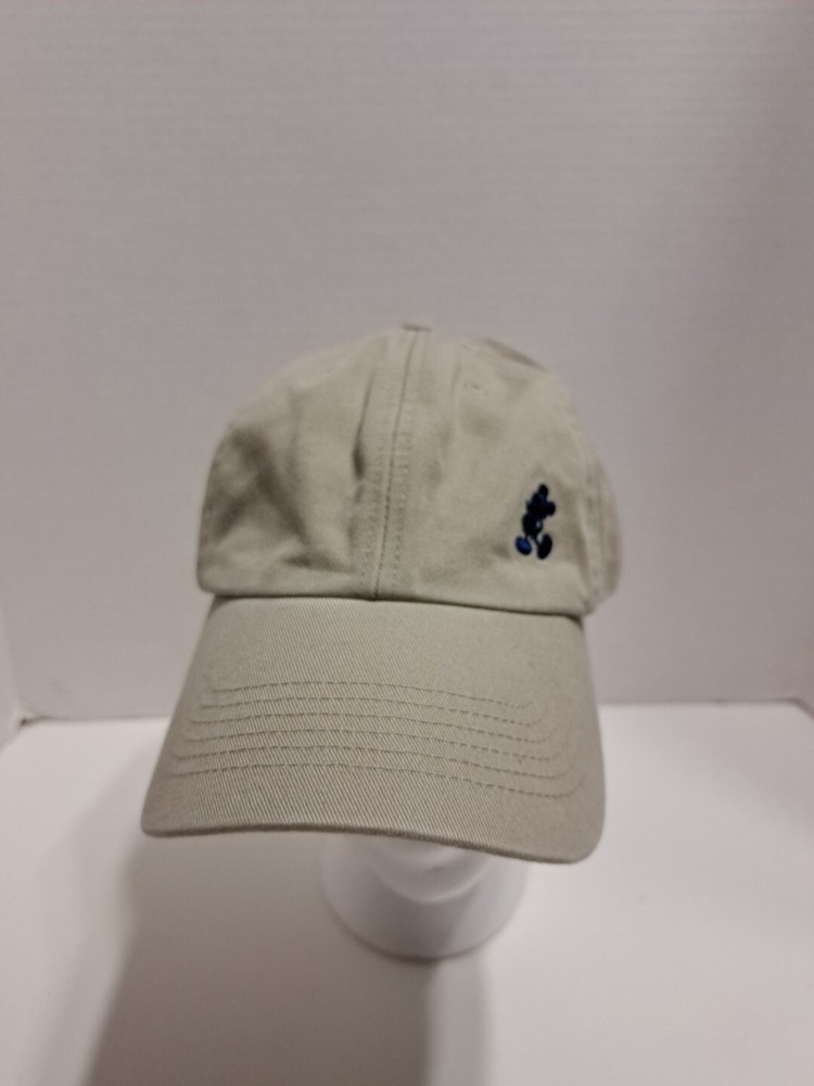 This vintage Walt Disney World Disney Parks hat features a tan color with navy blue accents and a silhouette of Mickey Mouse. The hat is designed for adults and is adjustable in size, making it suitable for a variety of head sizes. With its classic Disney branding and theme, this collectible hat is a perfect addition to any Disneyana collection or for any fan of Mickey Mouse and the Disney franchise. Used in good condition. Check out my other items. I combine shipping.