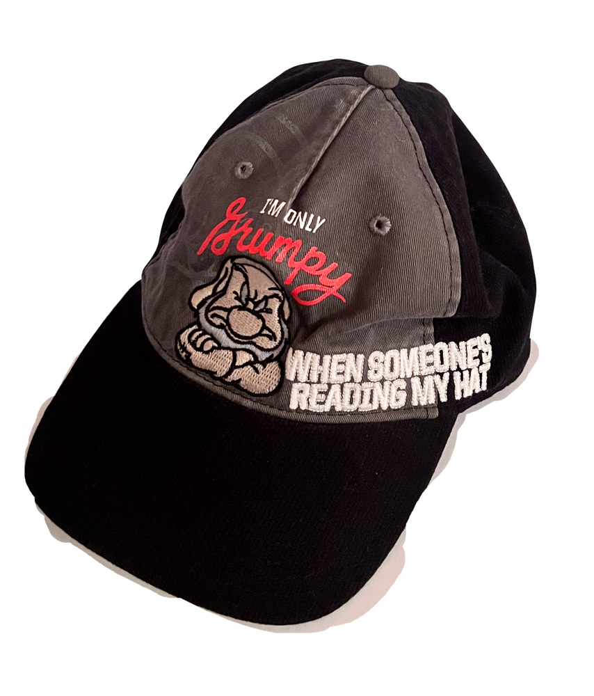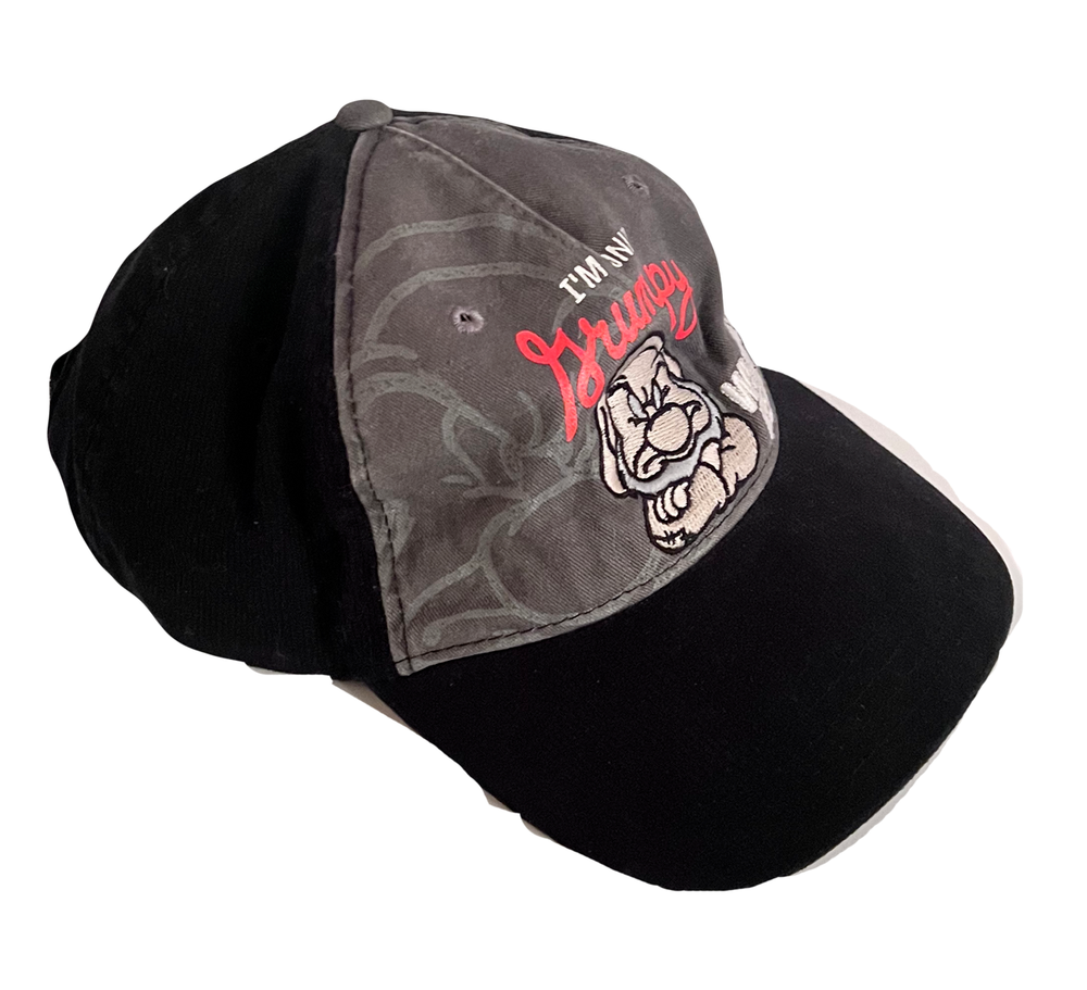 Great hat with an embroidery featuring Disney's 7 Dwarves names embroidered all around the hat, while the front has the character Grumpy on it. Back has a hook and loop adjuster. This black hat is in great, gently worn condition.