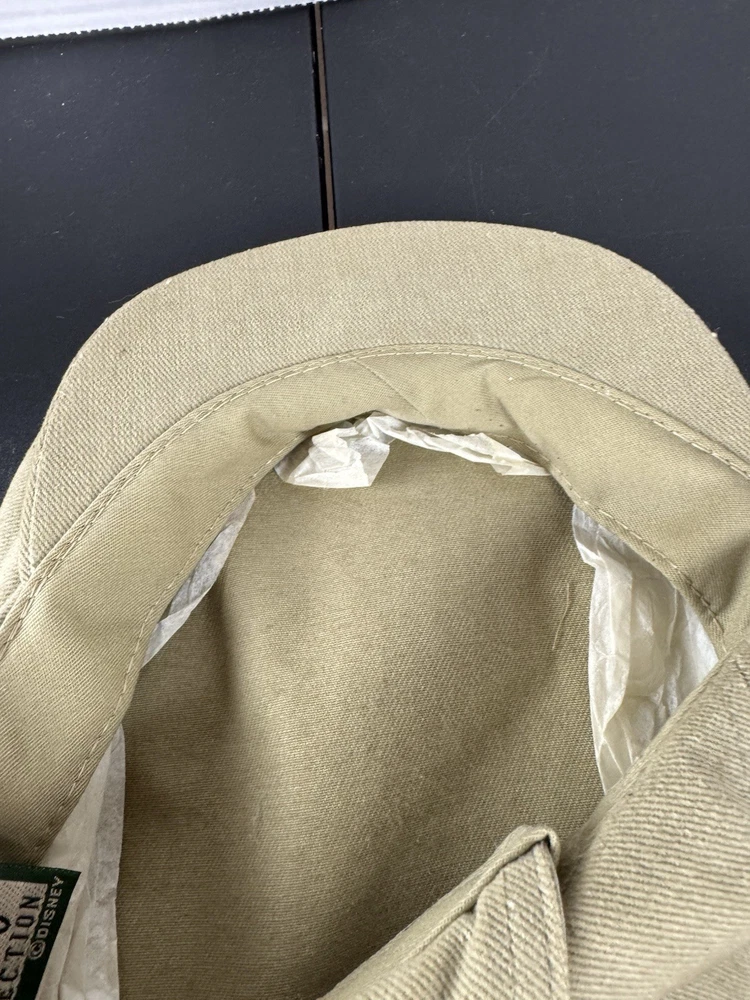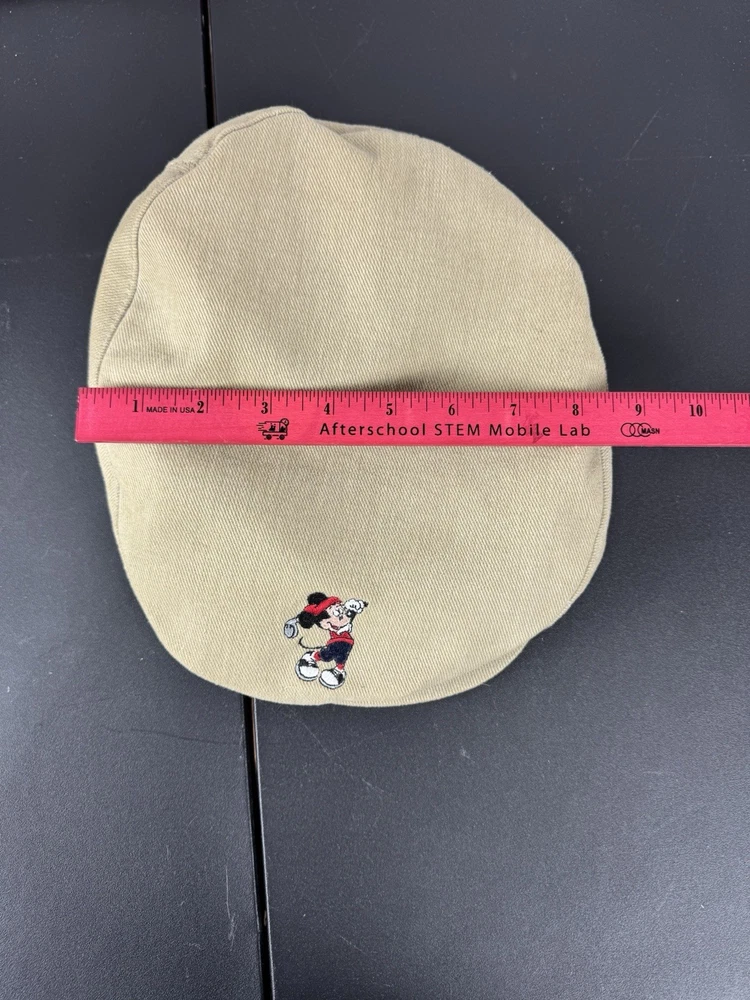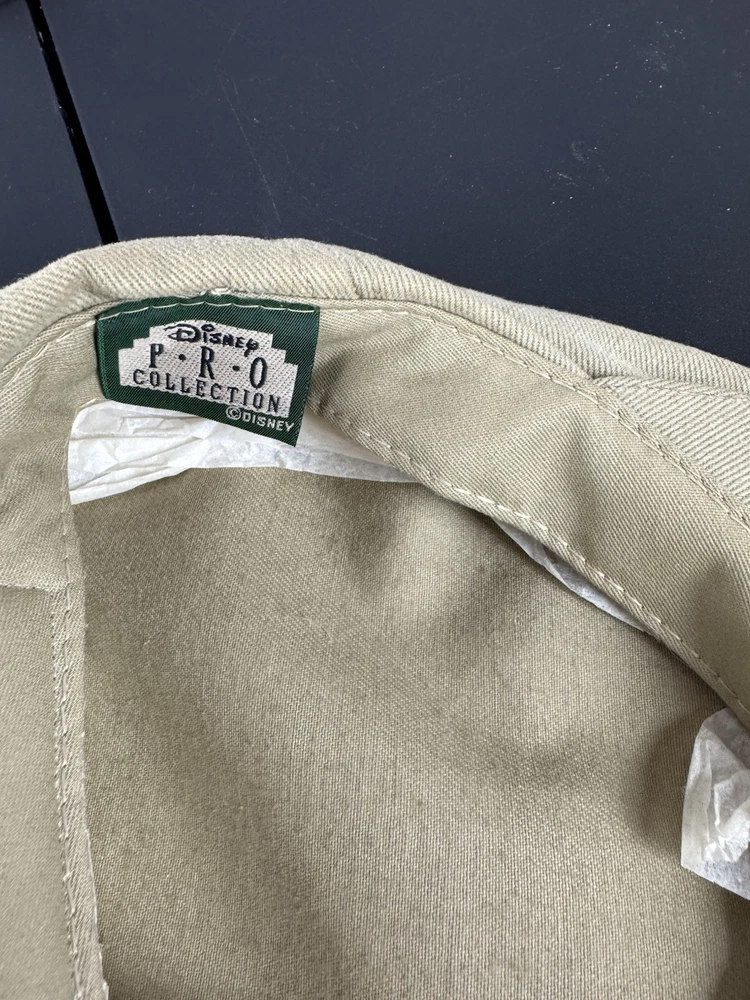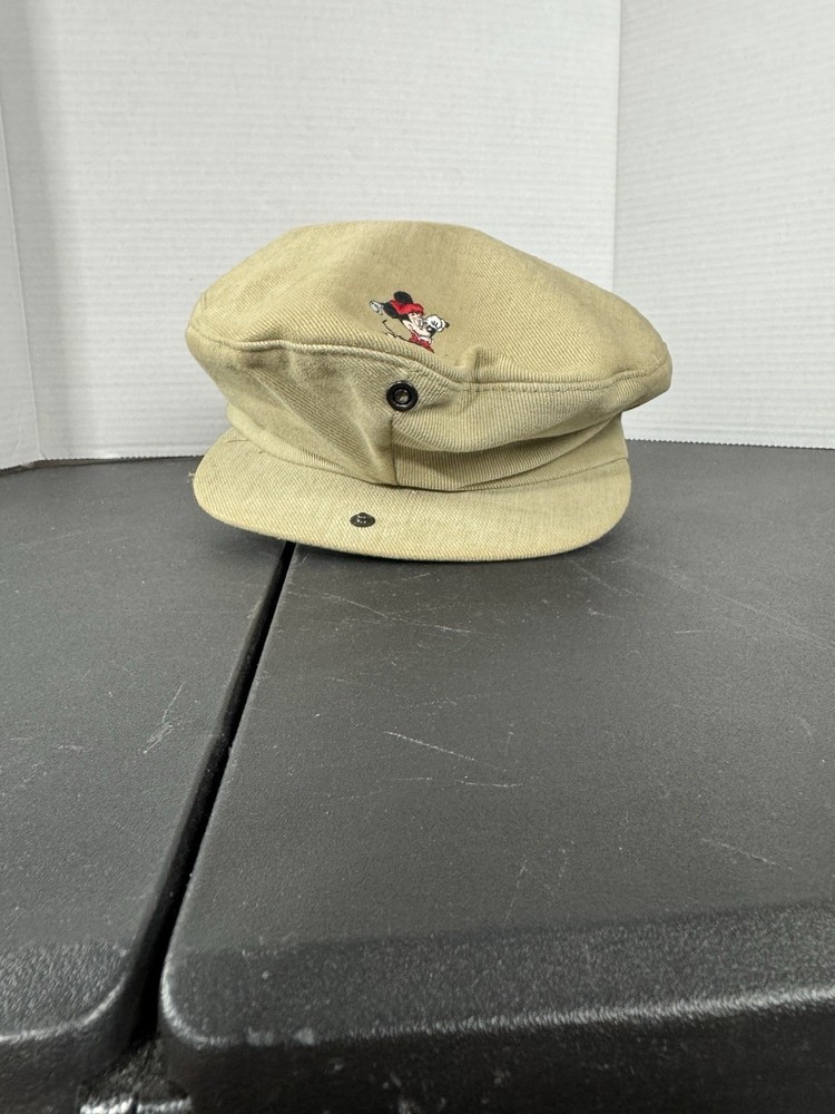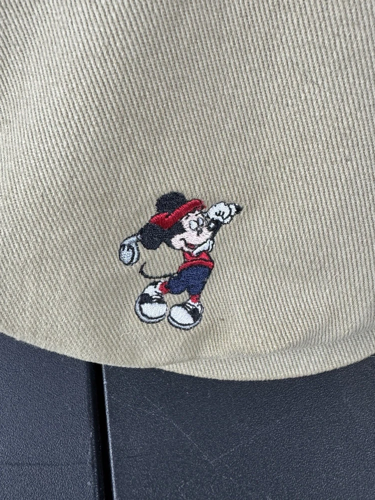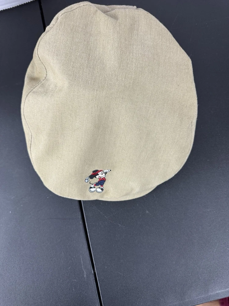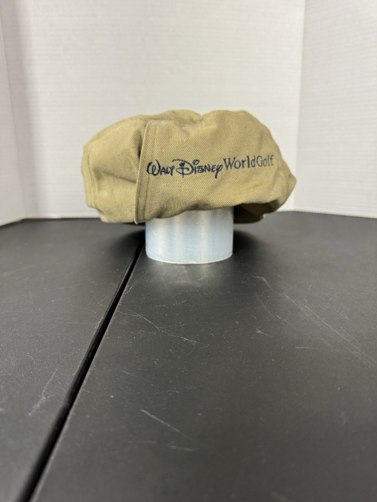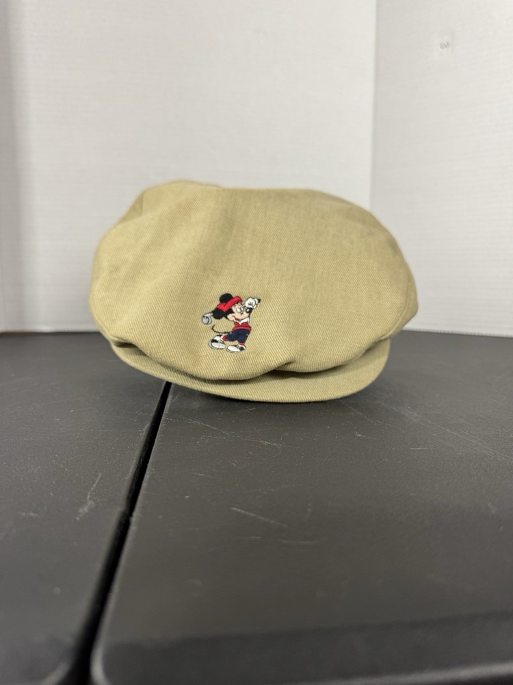 This vintage Walt Disney World Golf Hat is a must-have for any Disney enthusiast. The hat features an embroidered Mickey Mouse design and is part of the Disney Pro Collection. It is an adjustable newsboy cap in a beige color, suitable for both men and women. The hat is perfect for collectors of Disneyana and those who love to golf. It is a great addition to any wardrobe and a perfect gift for any Disney fan. This item is in excellent condition and ready to be added to your collection.