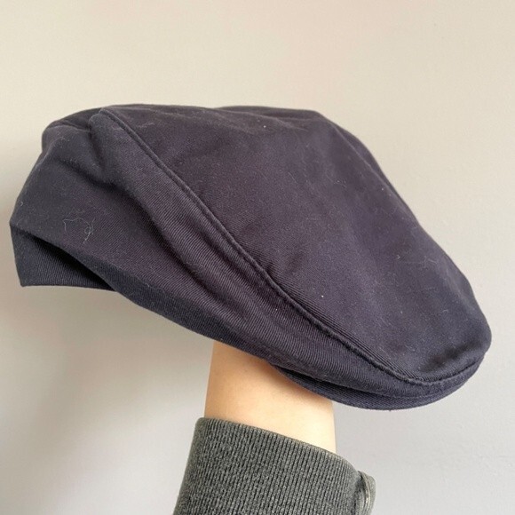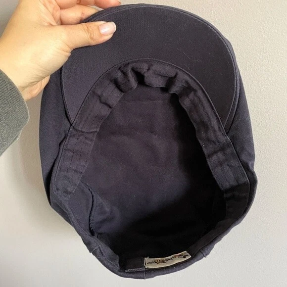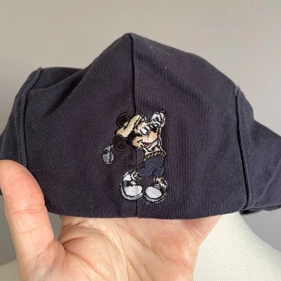 Cotton twill, cabbie hat with embroidered Mickey Mouse taking a swing. One Size, Unisex. ๐บ๐ธ Navy Blue feels like a cotton/cotton blend twill. Size tag removed, but interior brim measures approx 23.5" which is a L/XL as per various size charts. Please measure your head to ensure fit! GUC