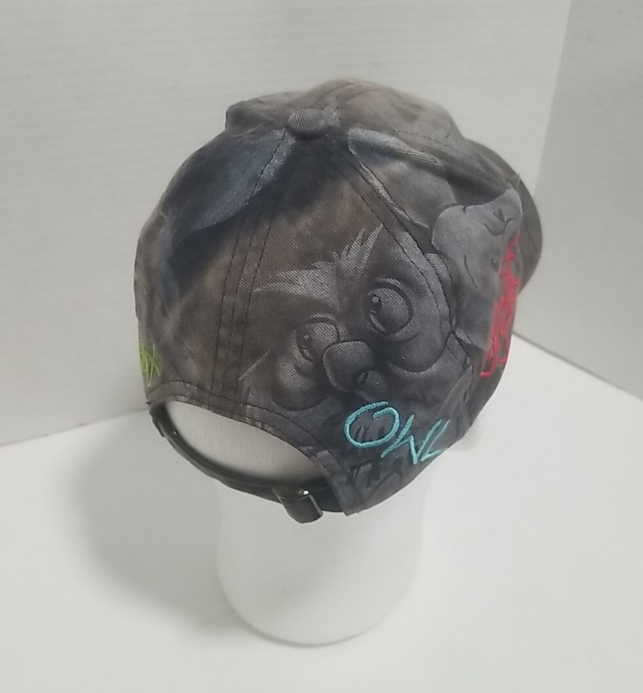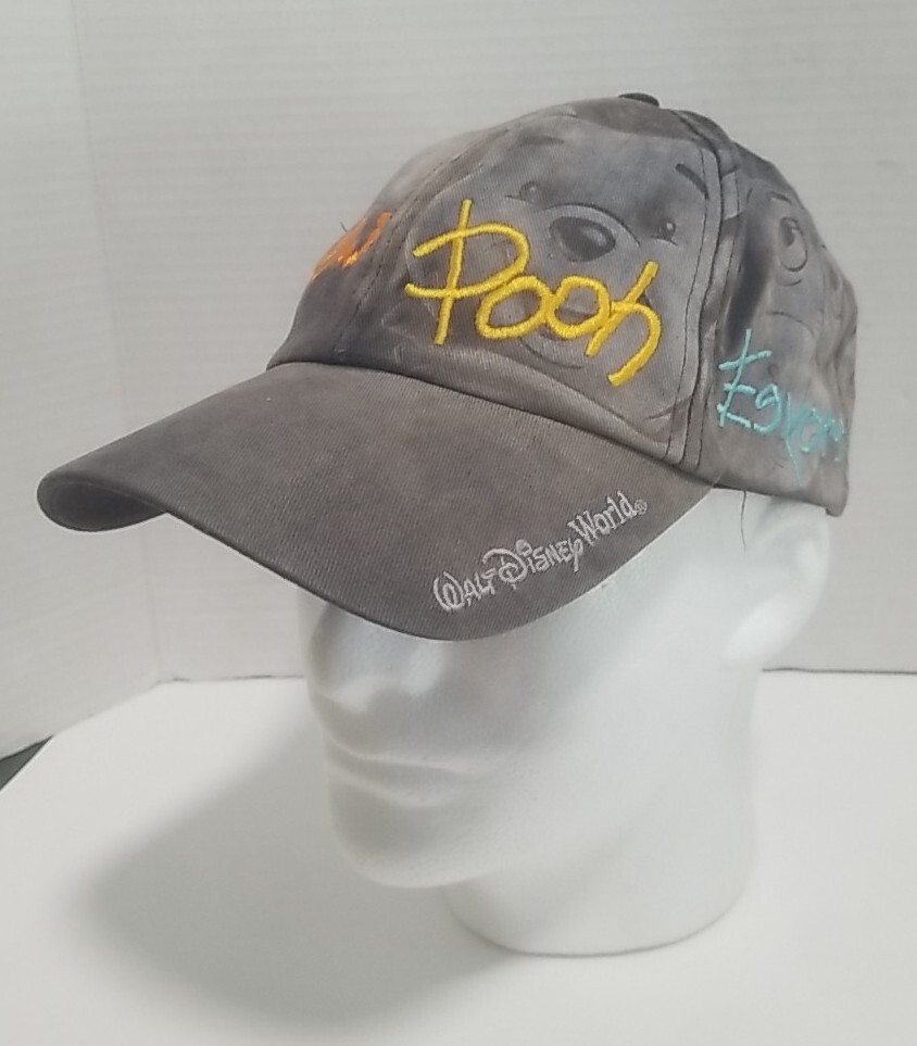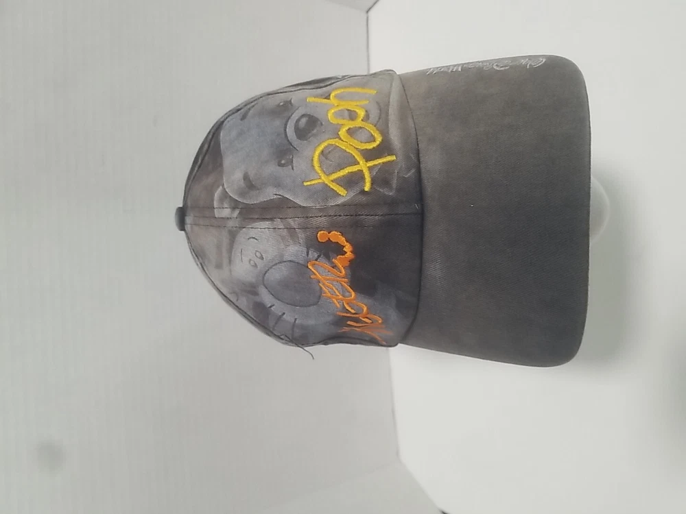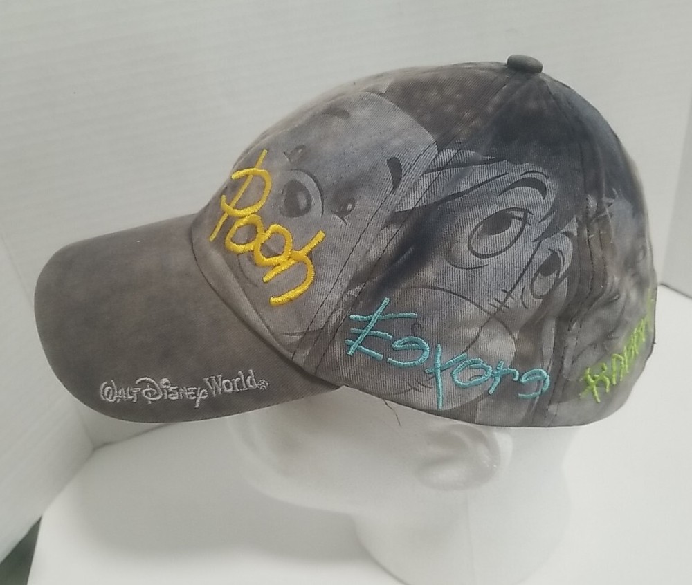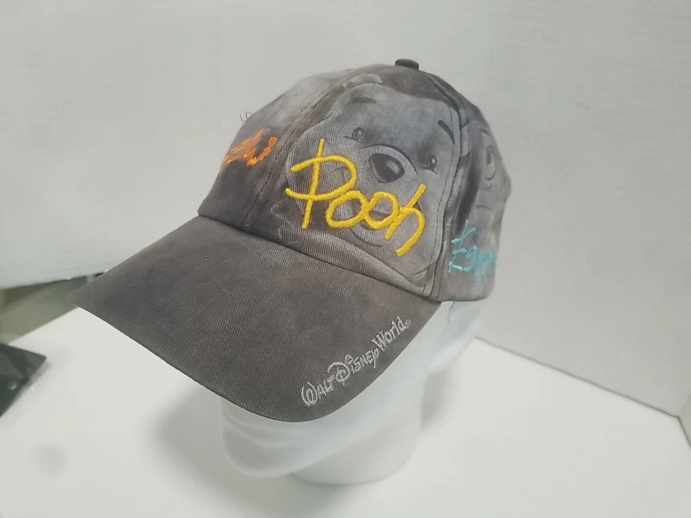 This vintage Walt Disney World hat features the beloved Winnie the Pooh character signatures on a grey and faded background. The hat is suitable for both men and women, and is a great addition to any Disneyana collection. The hat is black in color and is a contemporary piece from 1968 to now. It is perfect for Disney fans who are adults.
