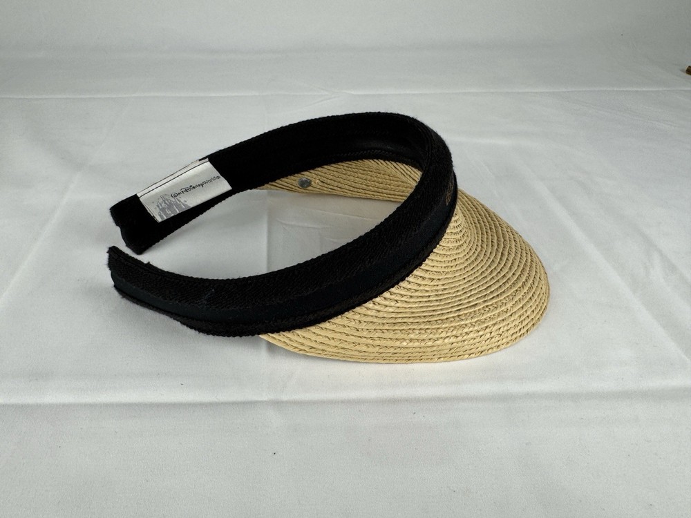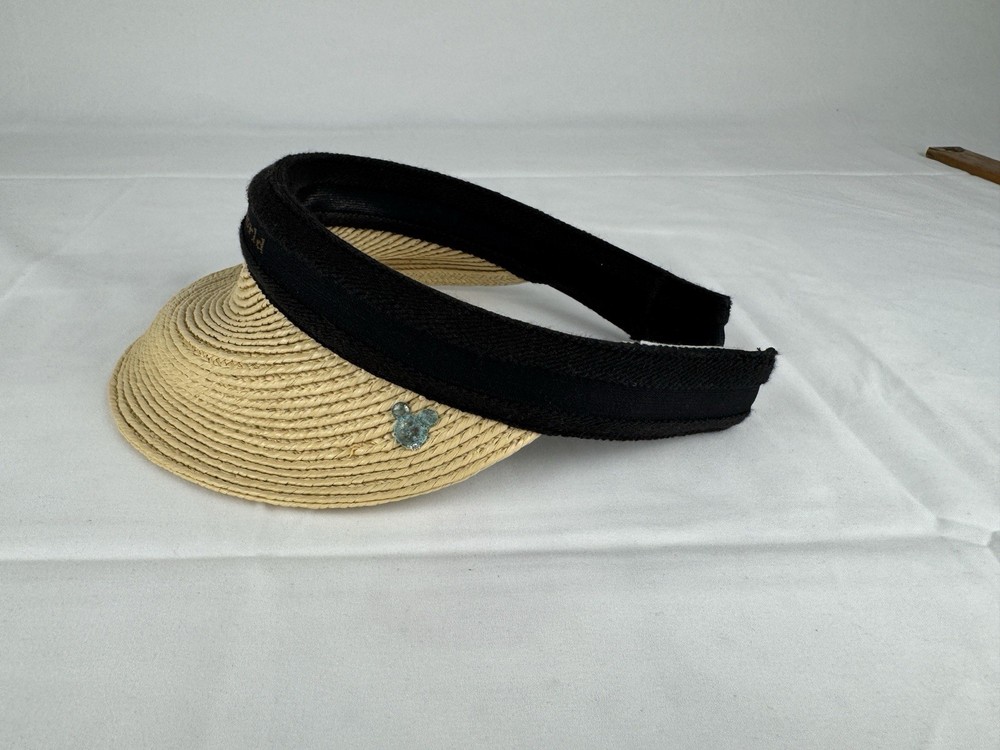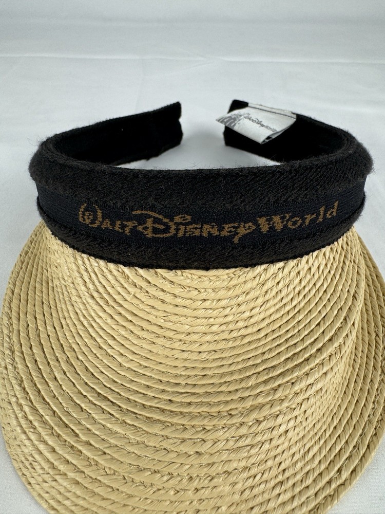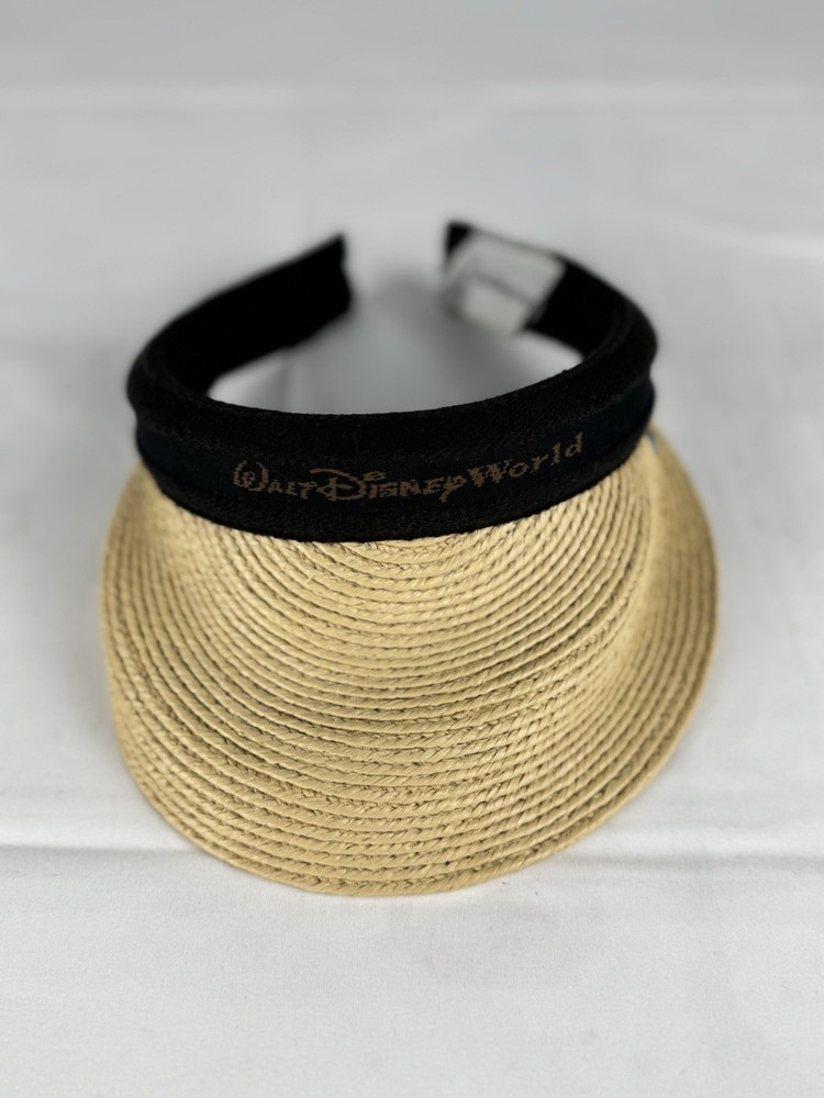This Walt Disney World straw visor features a natural woven brim and a soft black fabric band embroidered with the classic Walt Disney World logo in gold lettering. On the side, it’s accented with a charming Mickey Mouse silhouette pin, adding a special collectible touch.