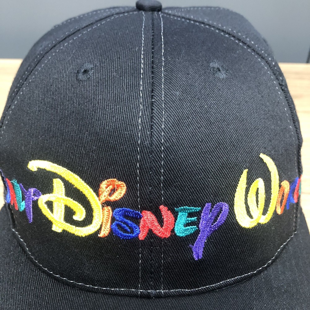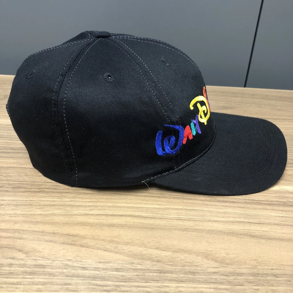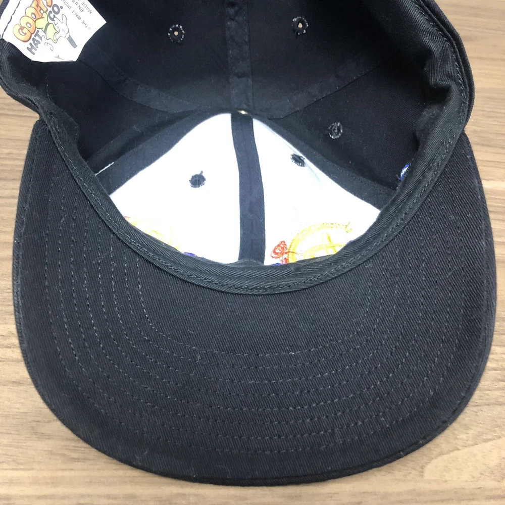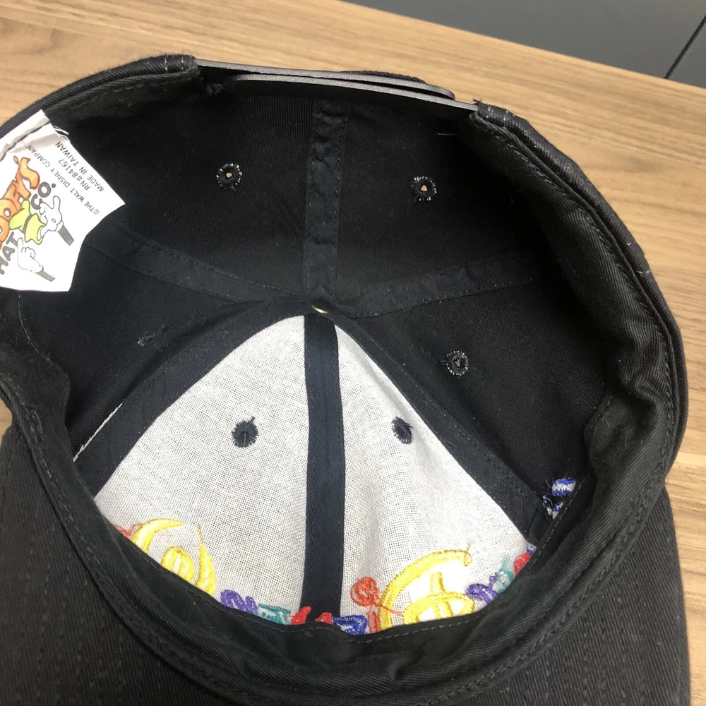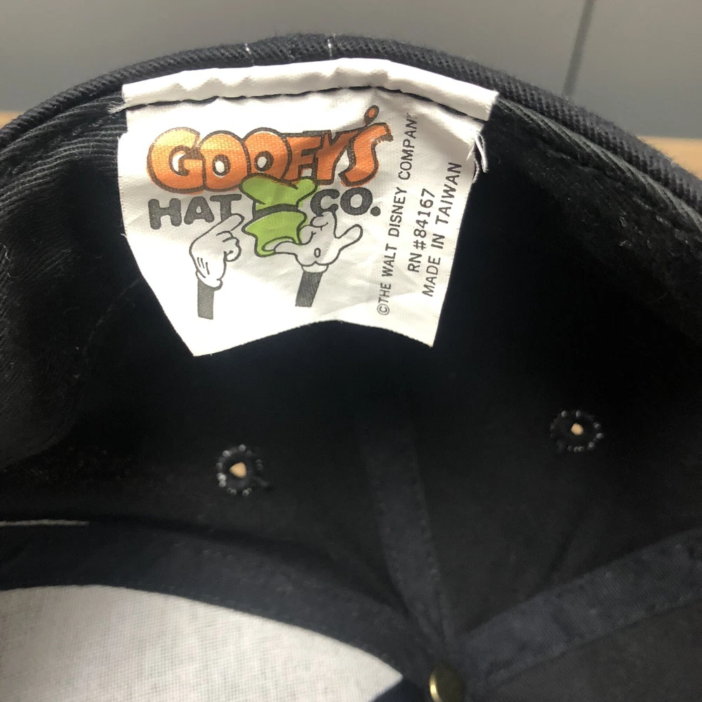 This vintage Walt Disney World script black adjustable snapback hat is a must-have for any Disney fan. The hat features a solid pattern with Mickey Mouse character and Goofy's Hat Co. design. It's perfect for travel, casual outings, and workwear. The adjustable snapback ensures a comfortable fit for all head sizes. The hat is made from an unknown material and has a black color that matches any outfit. It's a unisex hat suitable for both men and women. The cartoon theme adds a touch of fun to the hat, making it a great addition to any Disney collection. This hat is a vintage piece, perfect for those who love classic Disney memorabilia. It's a great way to show off your love for Disney without compromising on style. The hat has been hand washed, please see the pics for condition. The hat ships in a box.