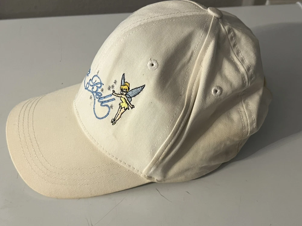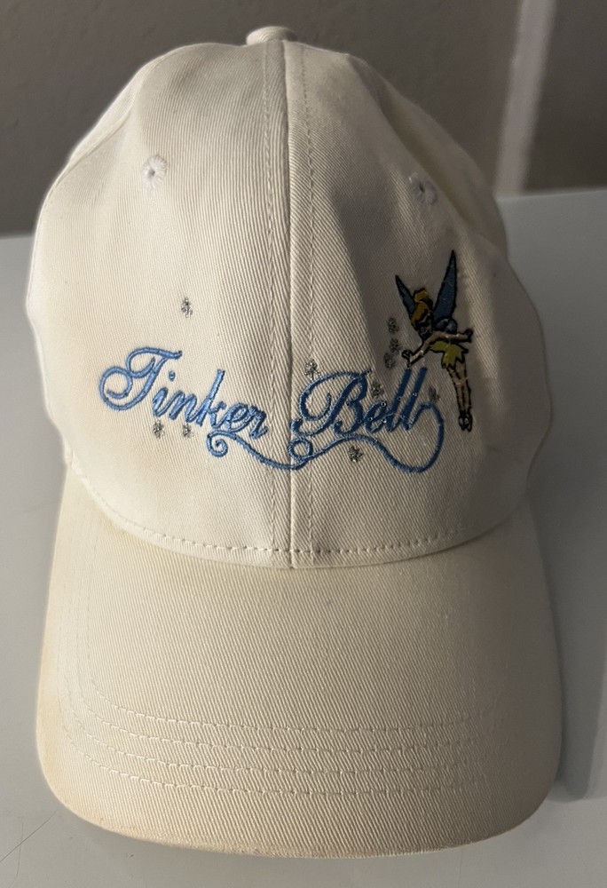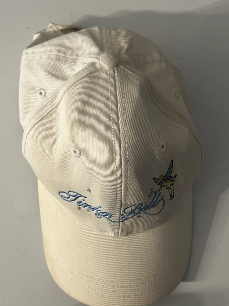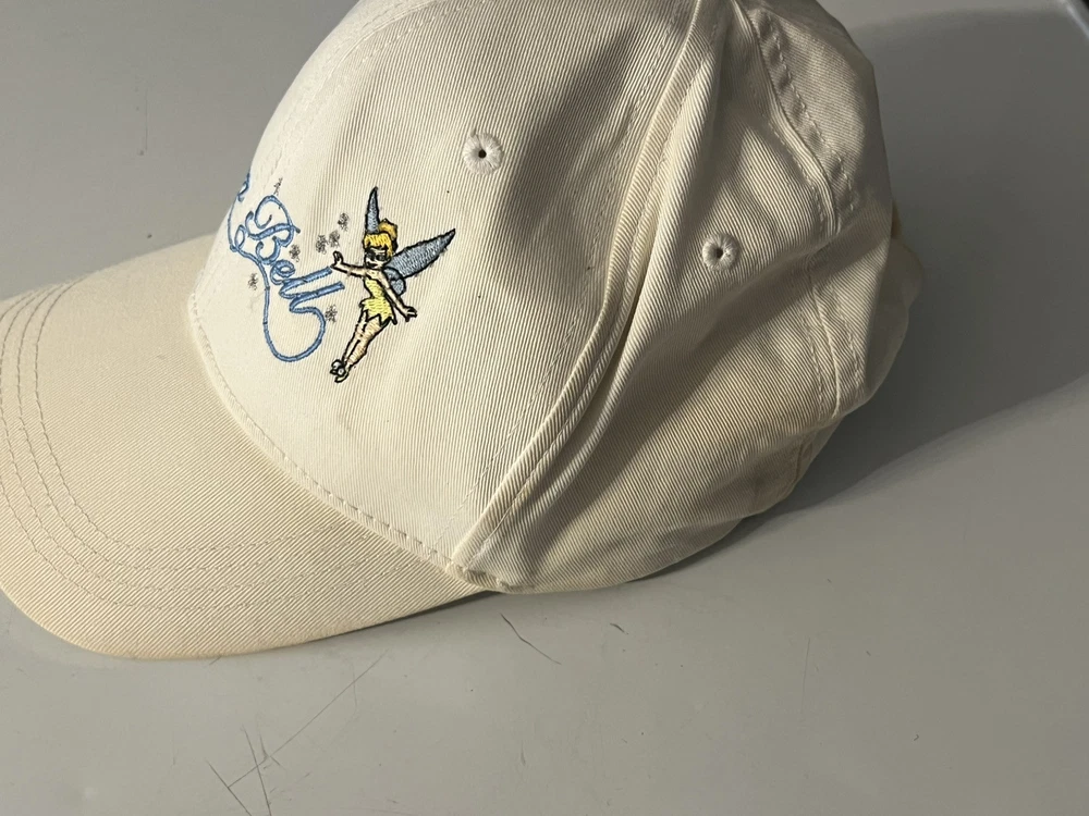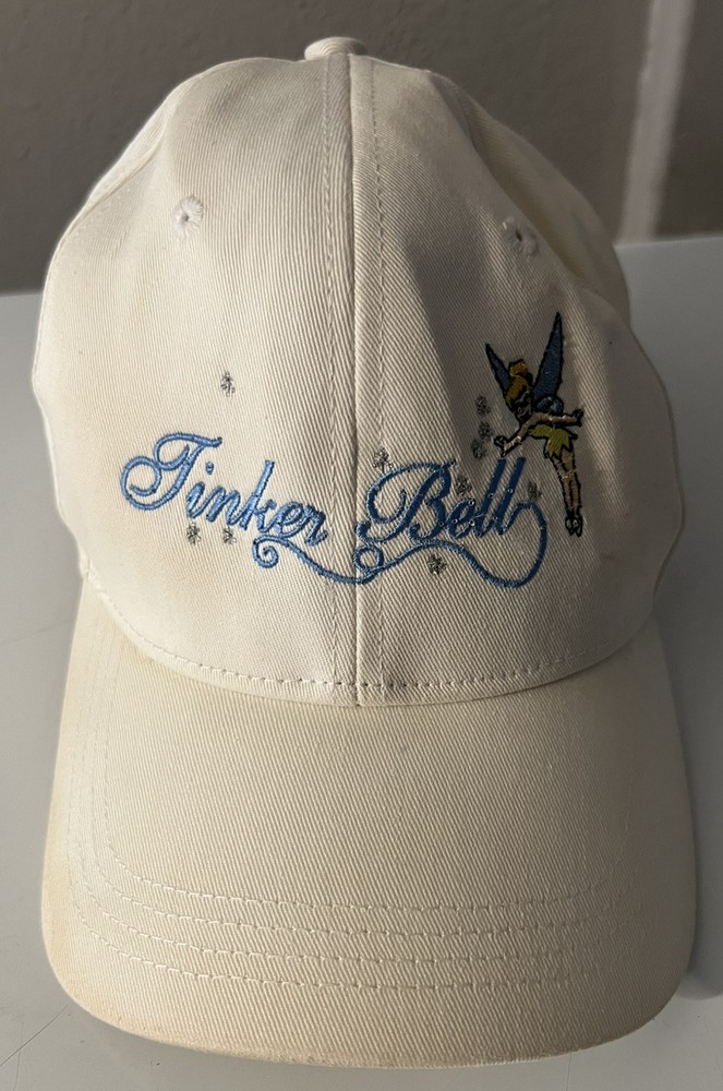 Vintage Walt Disney World Tinker Bell Baseball Hat Cap Adult Cream color Does have batteries that need to be replaced UNSURE IF IT STILL LIGHTS ON - not tested - sold as none working lights ( may work ) be advice Has some stains here and there see pictures Back is faded see pictures