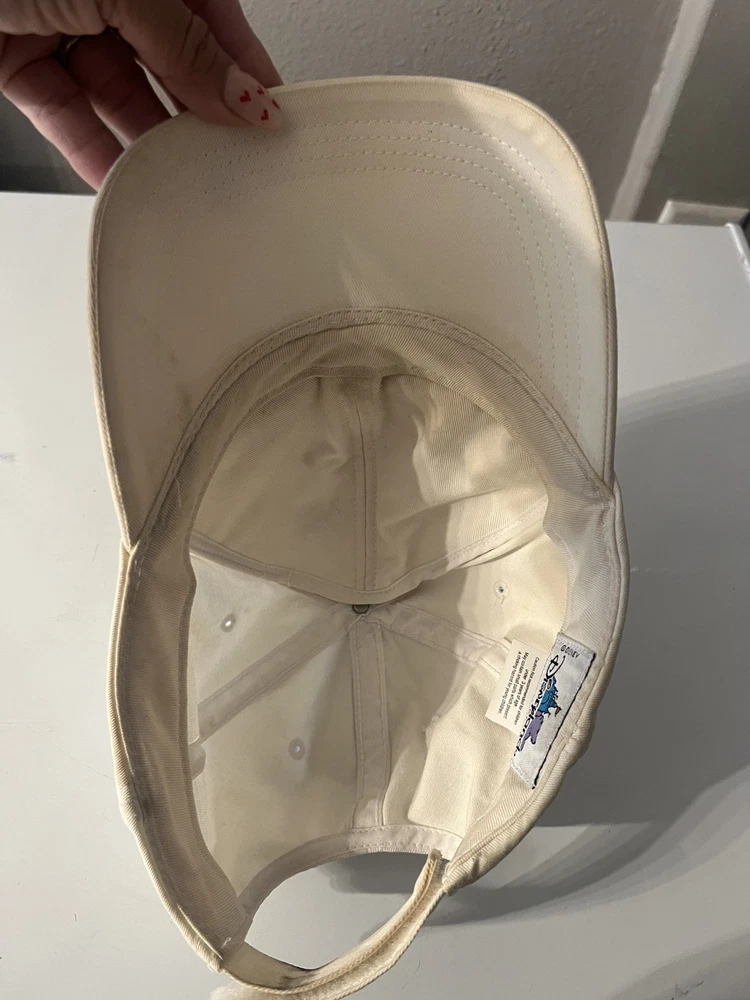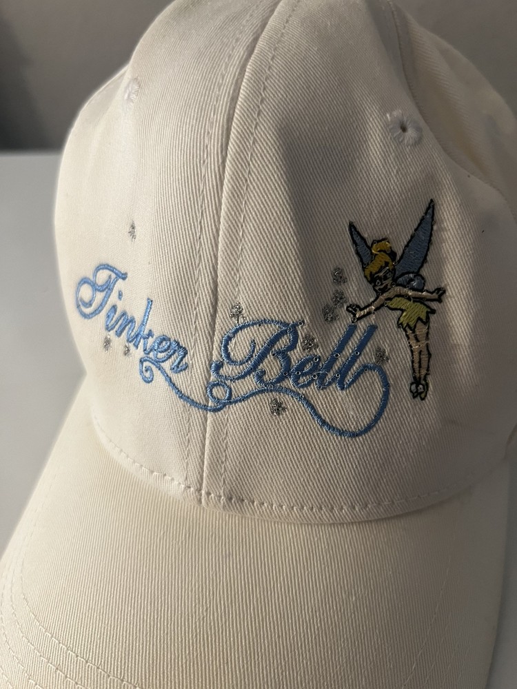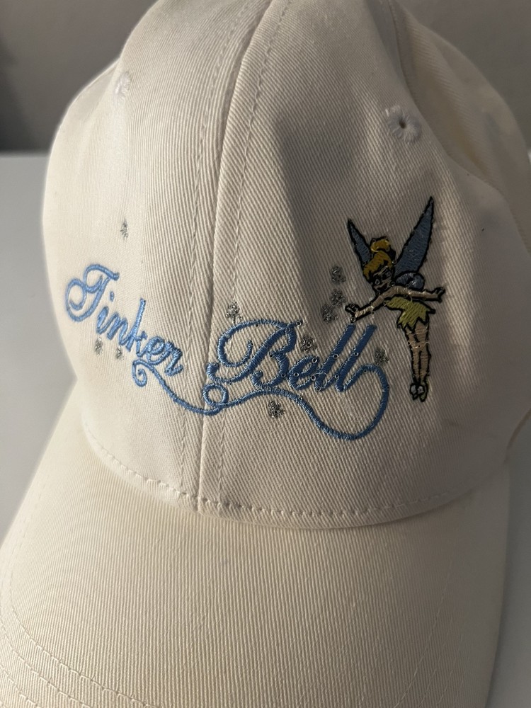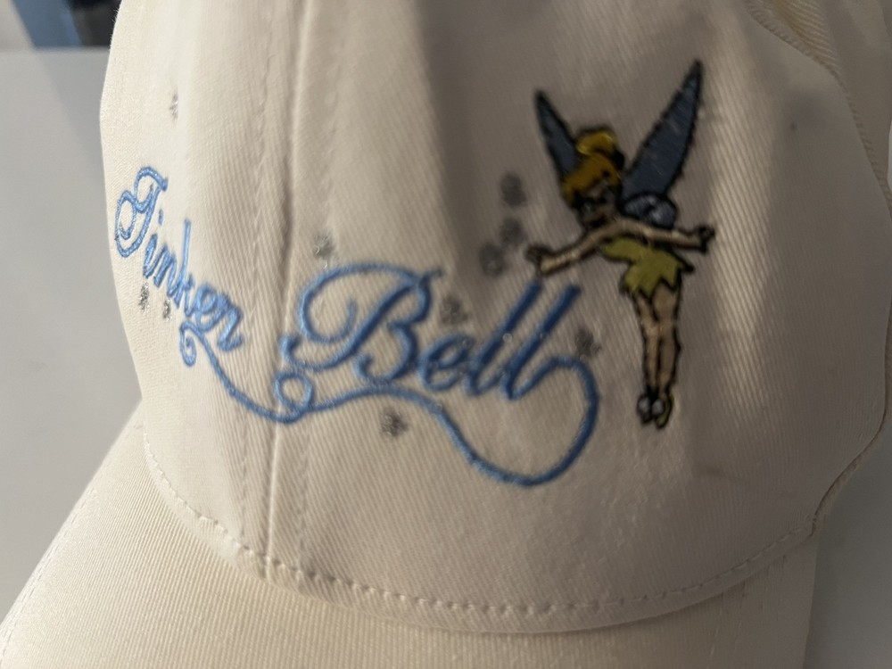 Vintage Walt Disney World Tinker Bell Baseball Hat Cap Adult Cream color Does have batteries that need to be replaced UNSURE IF IT STILL LIGHTS ON - not tested - sold as none working lights ( may work ) be advice Has some stains here and there see pictures Back is faded see pictures
